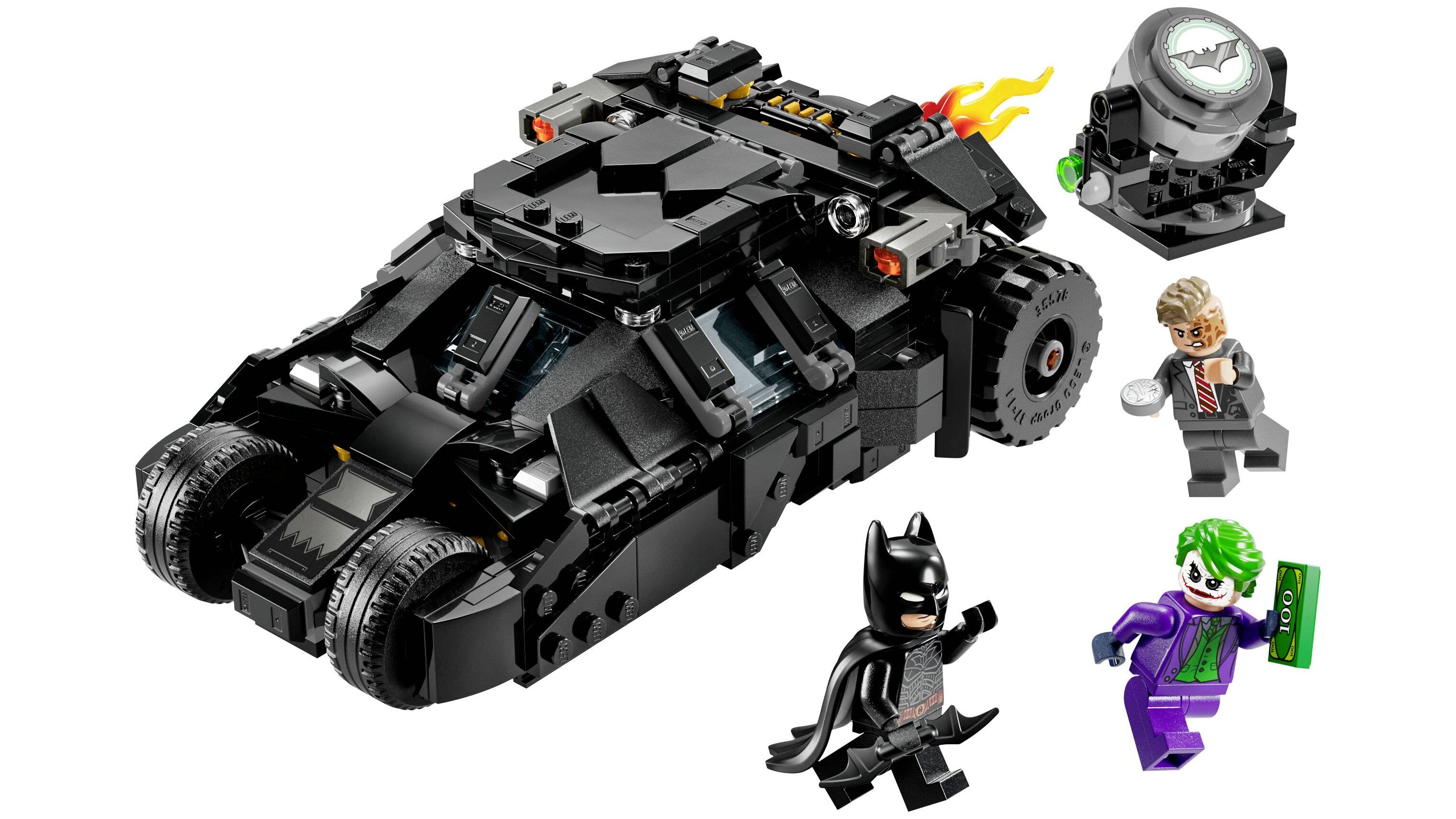 - LEGO® Batman™ Tumbler Batmobile™ – A játék autó kipufogójához egy lángelem van illesztve, az autó pedig kinyitható, hogy felfedezhesd a műszerfalat és a vezetőfülkét, ahol a Batman minifigura kap helyet