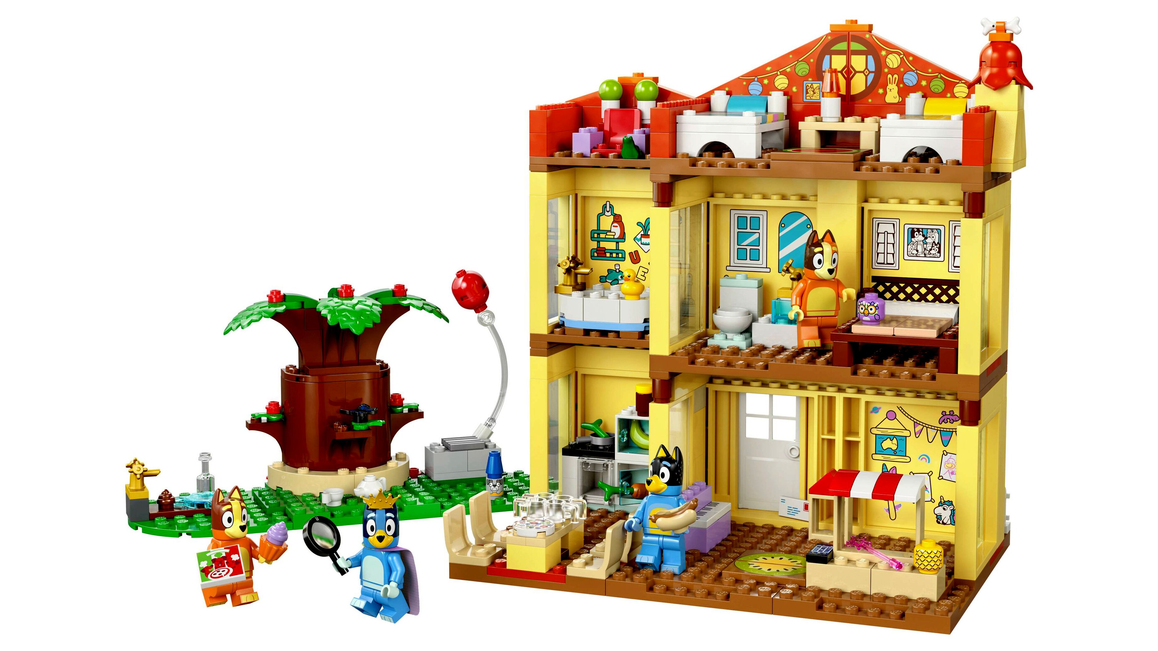 A többszobás, moduláris játékházhoz 4 minifigura – Bluey, Bingo, Szimat (Bluey anyukája), Csibész (Bluey apukája) – és többféle kiegészítő, például szivárványköpeny, varázspálca és nagyító tartozik. Mindegyik szoba kivehető, így rengeteg játéklehetőség tárul fel. A játékszobában babaház, zongora és játék büfé vár. A konyhában hűtőt, sütőt, tűzhelyet, asztalt és székeket találsz. Az emeleten van Anya és Apa hálószobája, valamint a fürdőszoba. Bluey és Bingo padlástéri szobájában van egy szőnyeg, egy lámpa és egy Chattermax-figura. A szomszéd szobában találod a királynő trónját, a teáskannát, a csészét és a békát. A kertben egy hatalmas fa, hot dog, pizza, vízcsap és Jeremy, a törpe vár, valamint egy lufit is ütögethetsz az ég felé!