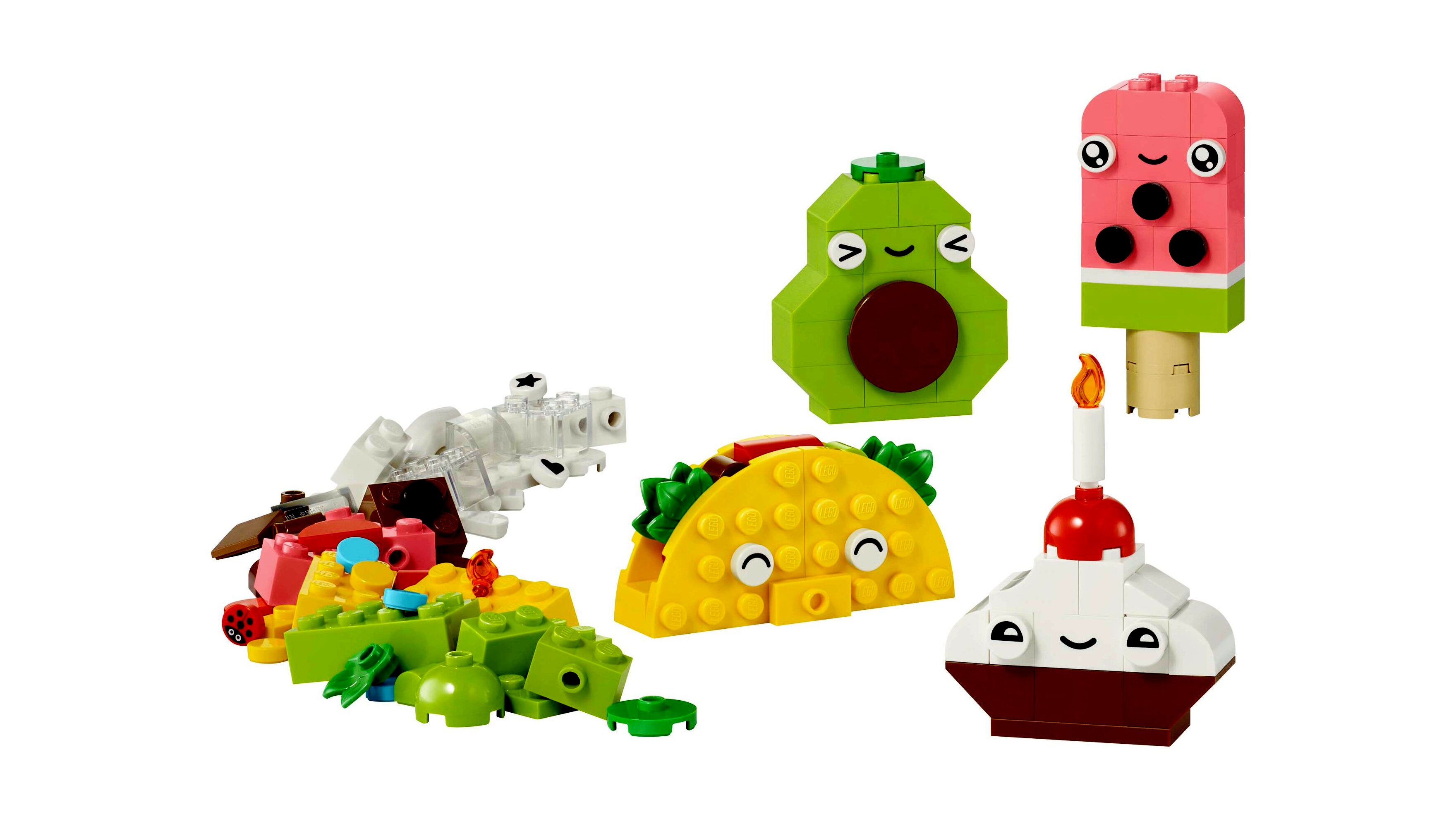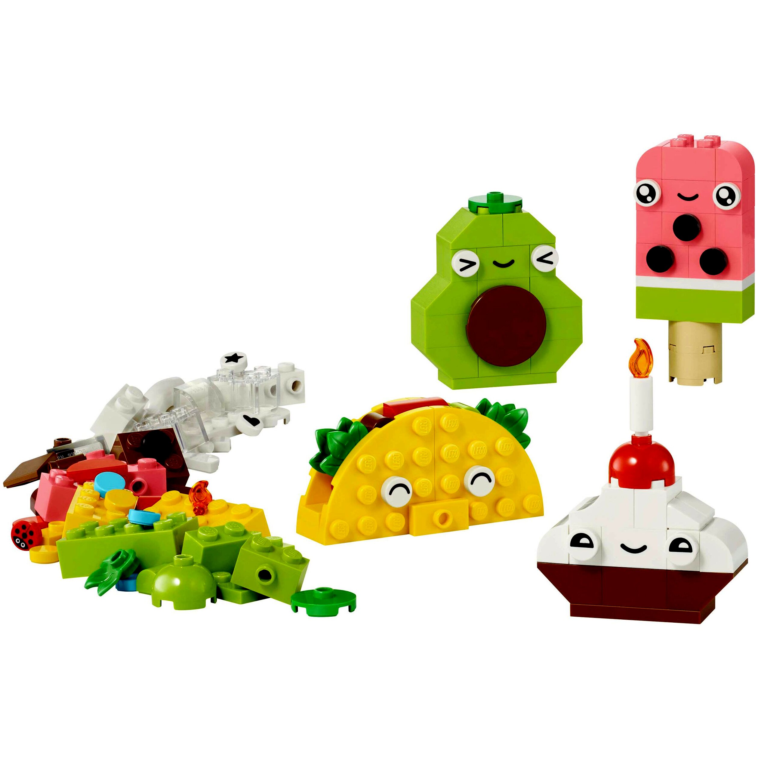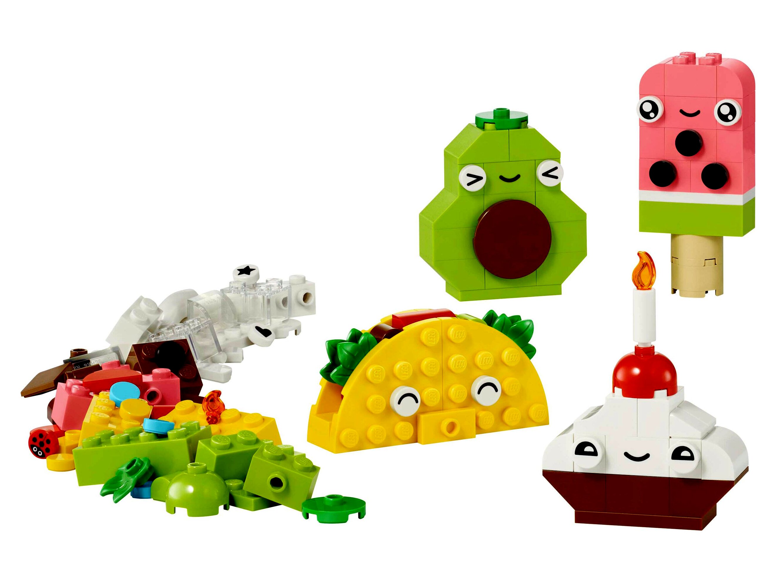 A gyerekek a szép színes építőelemekből és különleges elemekből (mint például a s zemek, a szájak és a különféle dekorelemek) 4 aranyos játék finomságot építhetnek meg: egy muffint, egy fagyit, egy avokádót és egy tacót. A kreatív szórakozás nem ér véget, hiszen a gyerekek összekeverhetik a kockákat, és cukorral díszített tortává, buborékteává, körtévé és paninivá építhetik át a modelleket. Ha a gyerekek egyre magabiztosabbá válnak az építésben, akkor az intuitív építési útmutató segítségével megváltoztathatják az arckifejezéseket, a formákat, a színeket, és olyan új finomságokat alkothatnak, mint a zöld fagylalt, az üdítőkarton, a dinnyeszelet, a csokiszelet és a hatalmas méretű szendvics.