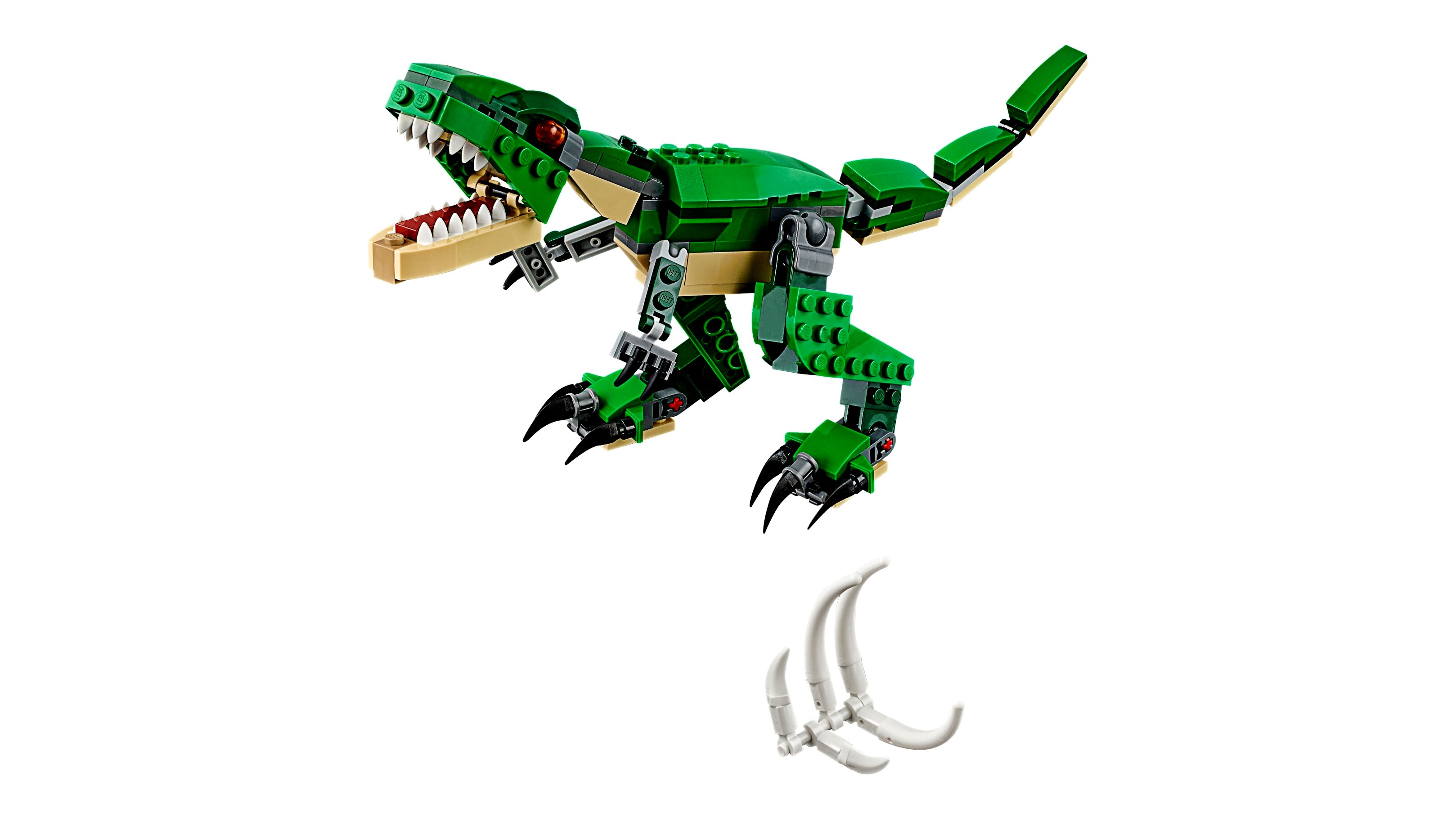 Élvezd a bámulatos T-rex látványát! Bőre sötétzöld és bézs színű, élénk narancssárga szemei vannak, ízületei és feje beállítható, karmai nagyok, nyitott szájában pedig hegyes fogakat fedezhetsz fel. A csomagban dinoszaurusz zsákmányt is találsz, egy összerakható bordázat formájában. Alakítsd át ezt 3 az 1-ben LEGO® Creator Hatalmas dinoszaurusz modellt és formálj belőle egy Triceratopsot vagy egy Pterodactylt!