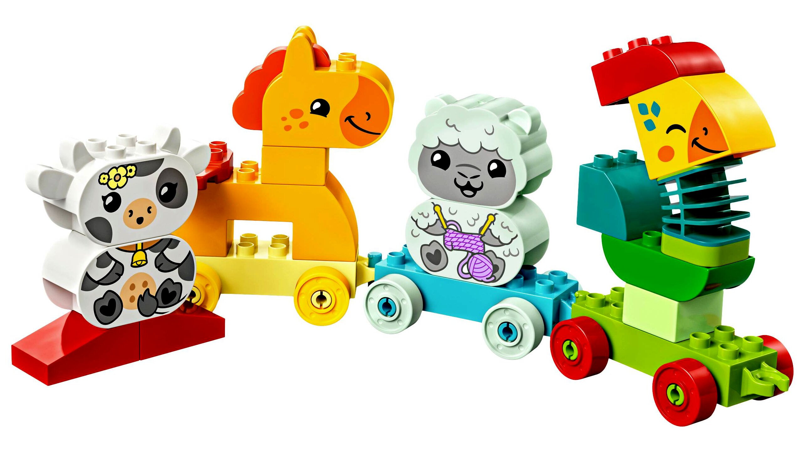 - Állatos játékvonat – A 18 hónapos vagy annál nagyobb gyermekeknek készült LEGO® DUPLO® Első Állatok a vonaton szett 4 megépíthető állatot és 3 összekapcsolható kocsit tartalmaz, amit a kicsik húzhatnak a kreatív játék során