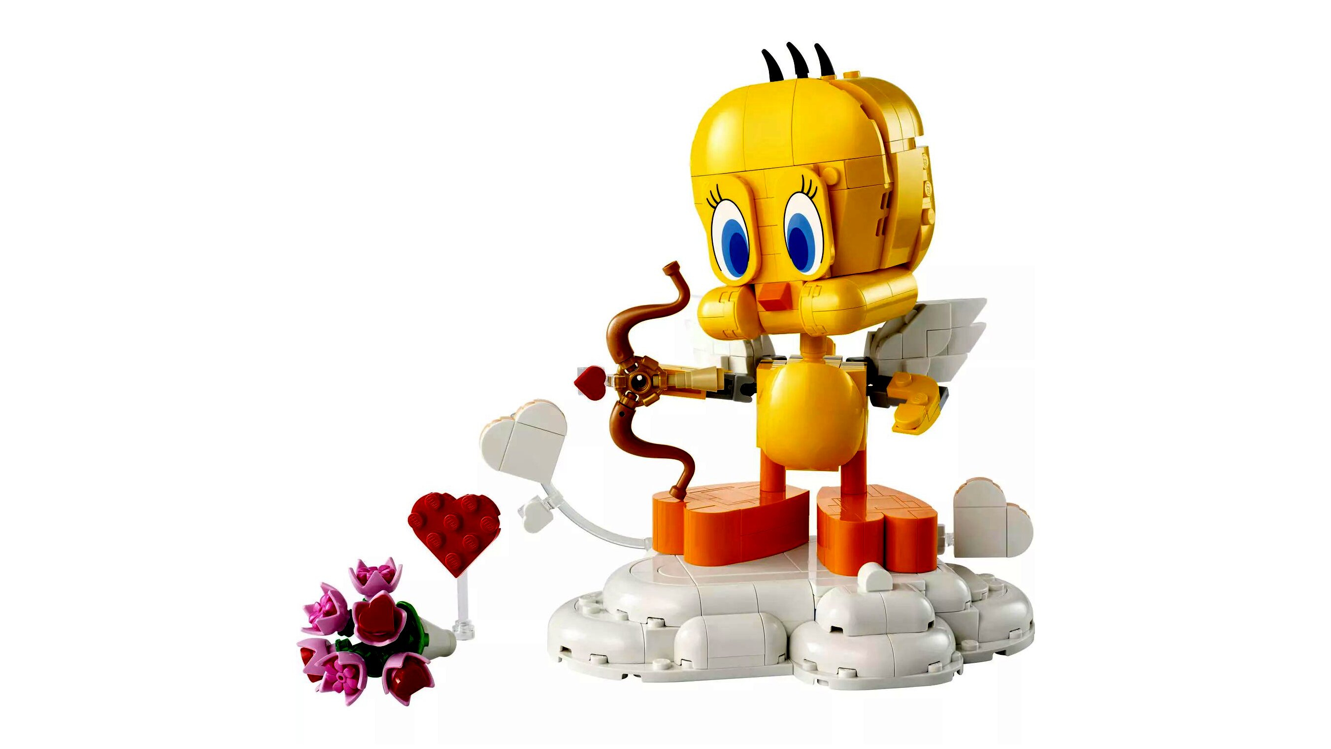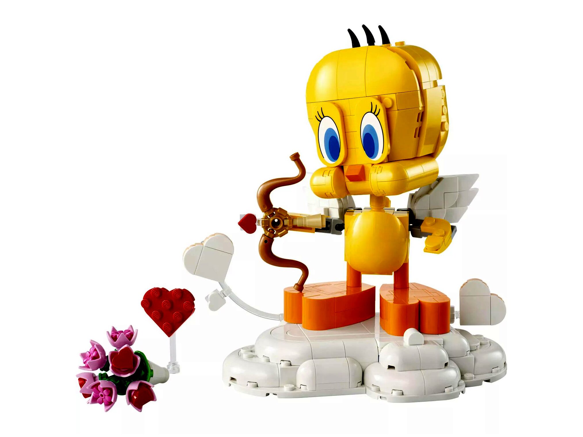 A LEGO® Cuki Csőrike egy Looney Tunes™ ihlette, megépíthető és kiállítható kanári figura, amelyet Valentin-napi hangulatú kiegészítőkkel kétféle stílusban állíthatsz össze. A készlet beállítható részleteinek köszönhetően könnyen személyre szabható, így látványos dekoráció lehet otthon vagy az íróasztalon.