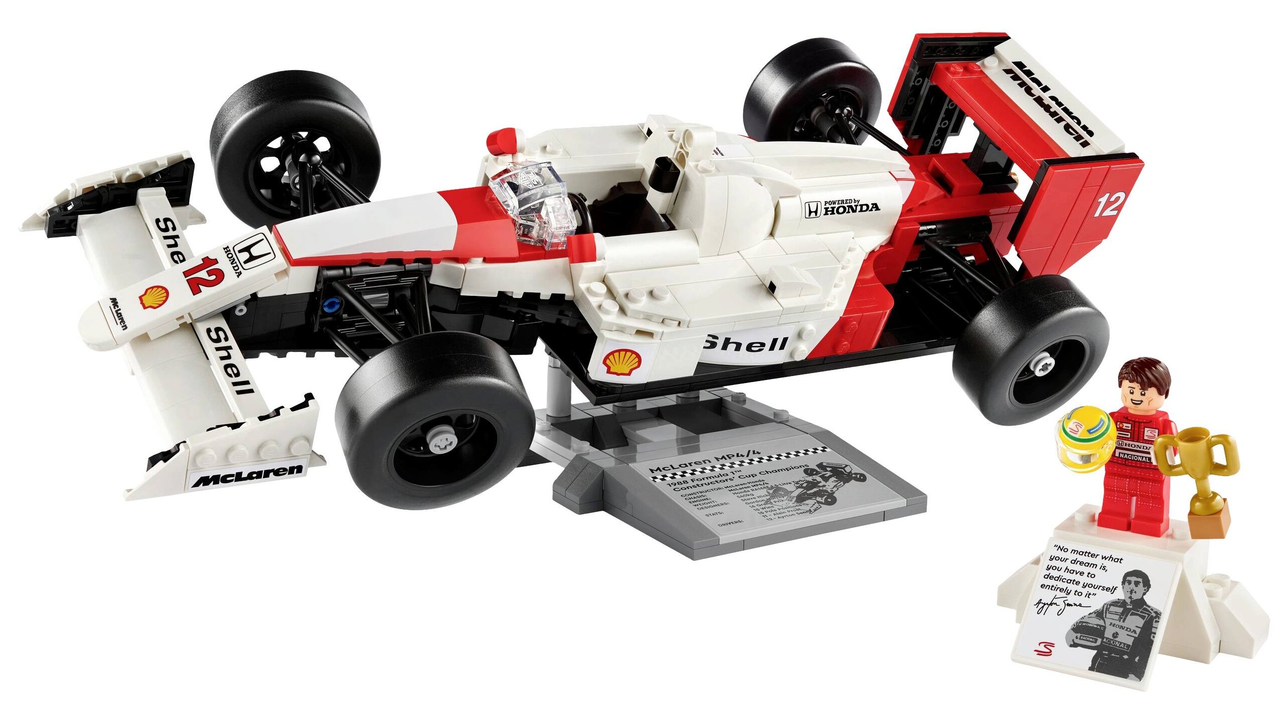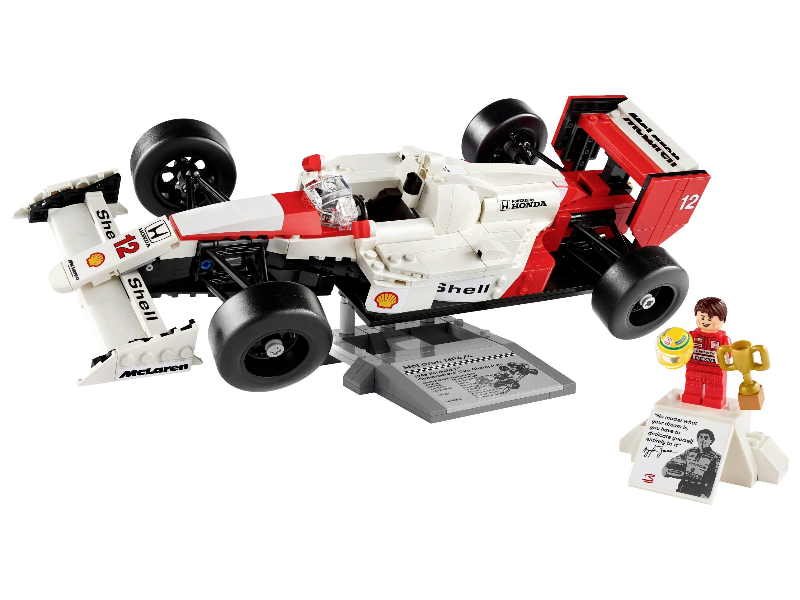 A McLaren MP4/4 replikának működő kormányzása, rudas felfüggesztése, állítható hátsó szárnya, sima gumiabroncsa, tükrei, váltója és részletgazdag v6-os turbófeltöltős motorja van, sőt, egy bemutatóállvány és egy izgalmas statisztikai adatokat tartalmazó információs tábla is tartozik hozzá. Az Ayrton Senna minifigurához egy dobogó stílusú bemutatóállvány és egy információs tábla is tartozik, amelyen Ayrton Senna fényképe és egy tőle származó idézet található.
