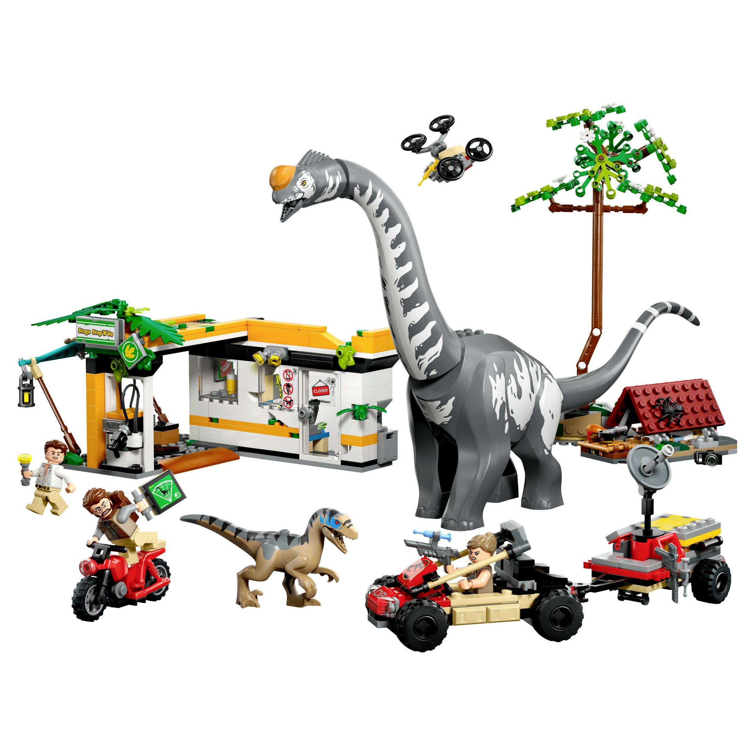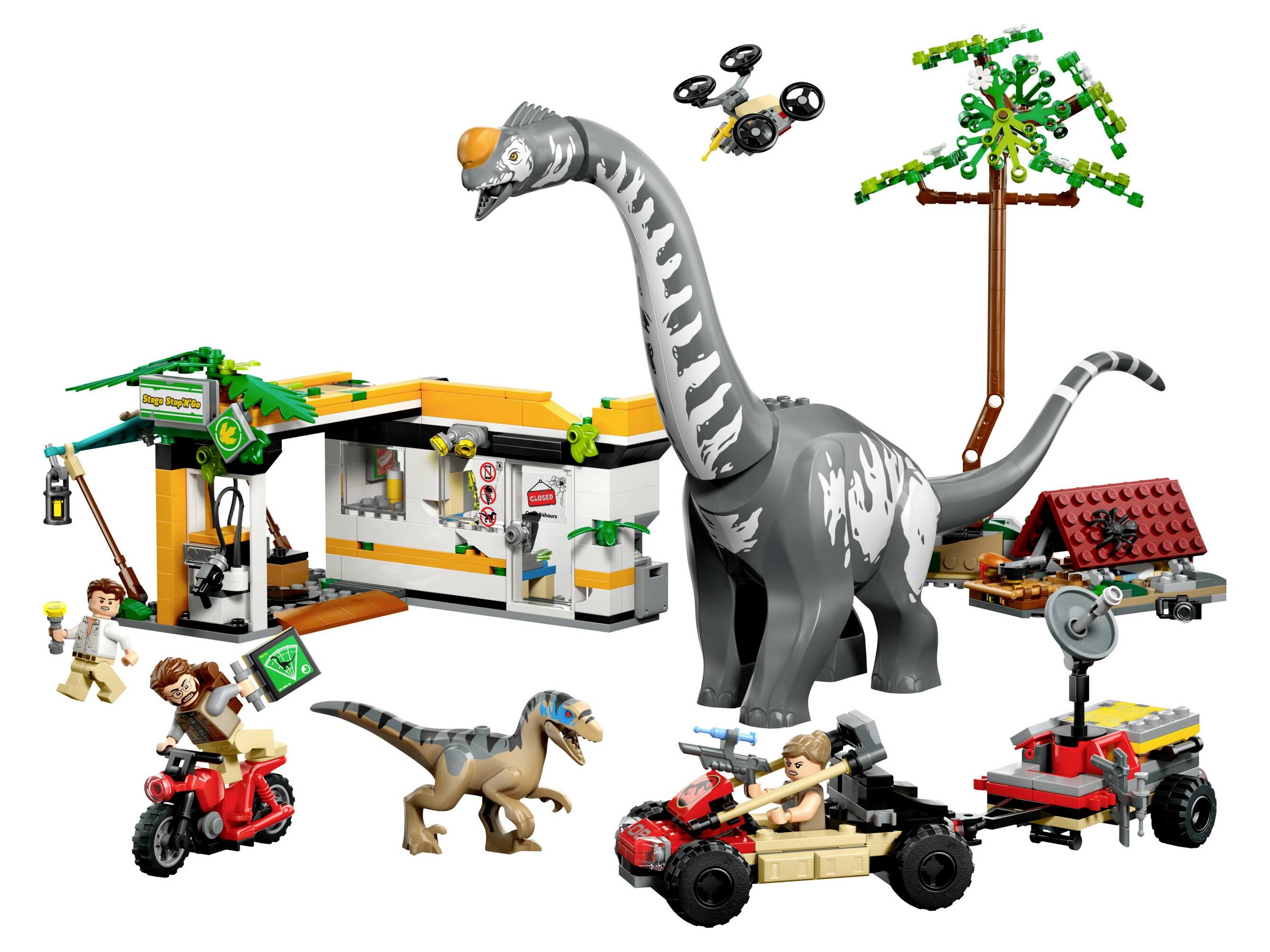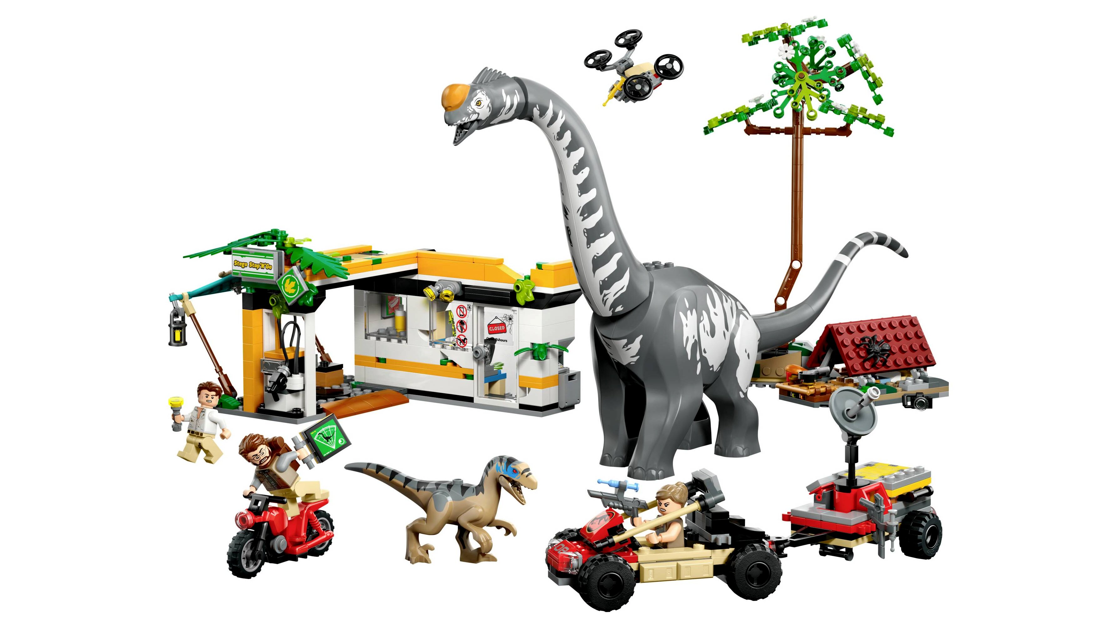 - Kreatív funkciók – A szett tartalmaz egy kidőlő fát, egy drónt, amit a játék jármű vagy a töltőállomás tetejéhez rögzíthetsz, egy mozgatható állkapcsú Velociraptort és egy mozgatható fejjel, nyakkal és farokkal rendelkező Titanosaurust