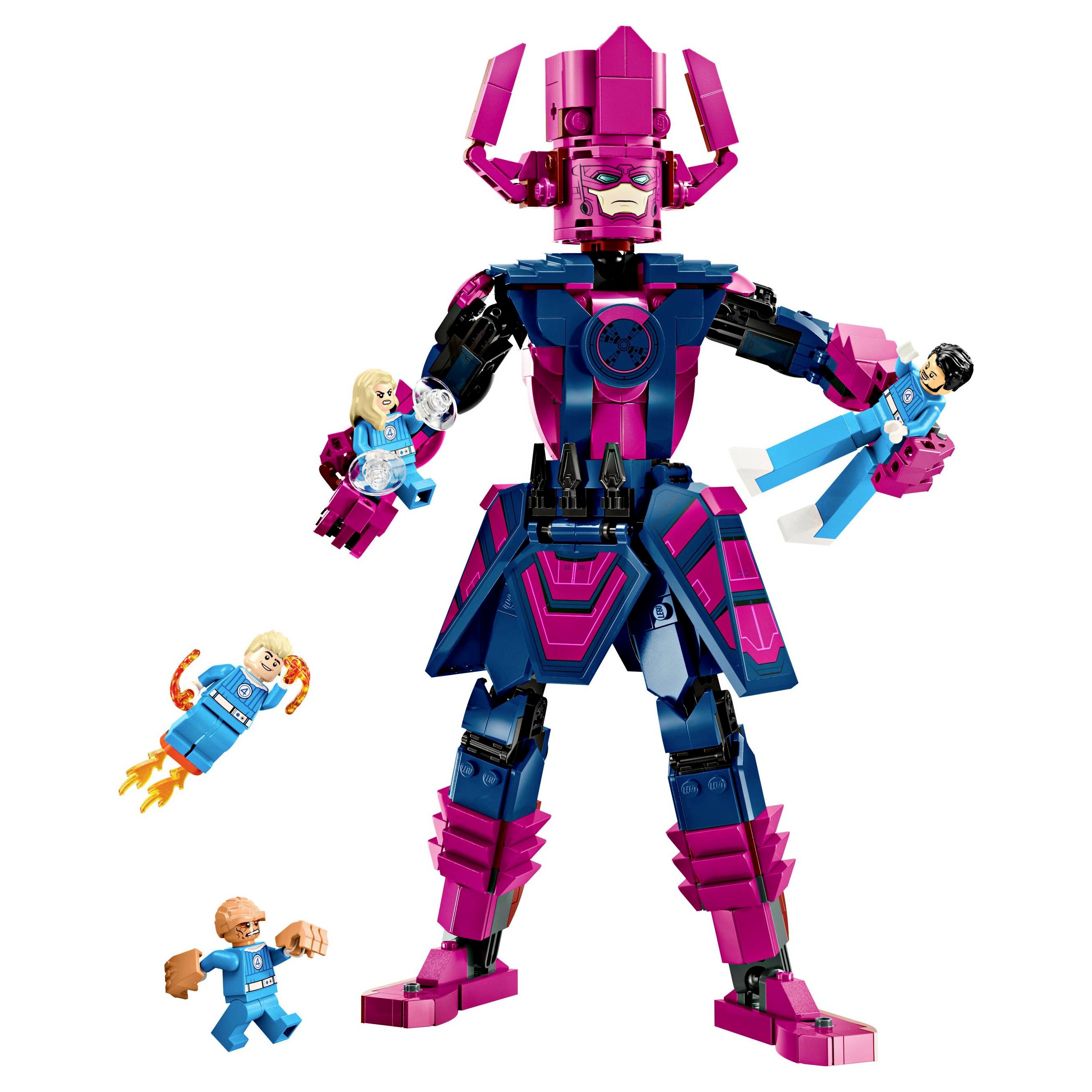 A megépíthető LEGO ǀ Marvel Fantasztikus Négyes játék 4 minifigurát tartalmaz: Mr. Fantastic kinyújtható lábakkal, Fáklya 2 kézi ágyúval, lábhoz rögzített lángelemekkel és átlátszó támasztékkal, hogy „repülni” tudjon; Láthatatlan, aki 2 erőpajzsot tart; és a Lény a hatalmas és erős kezeivel. A film ikonikus gonosztevőjének, Galactusnak a beállítható építőfigurája 28 cm magas. A beállítható építőfigura a szuperhősökkel csatázik, és téged is rengeteg akcióra hív. Az extra digitális élmény érdekében az építők felnagyíthatják és 3D-ben elforgathatják a modelleket, valamint követhetik a haladásukat a szórakoztató és intuitív LEGO® Builder alkalmazásban. A szett 427 elemet tartalmaz.