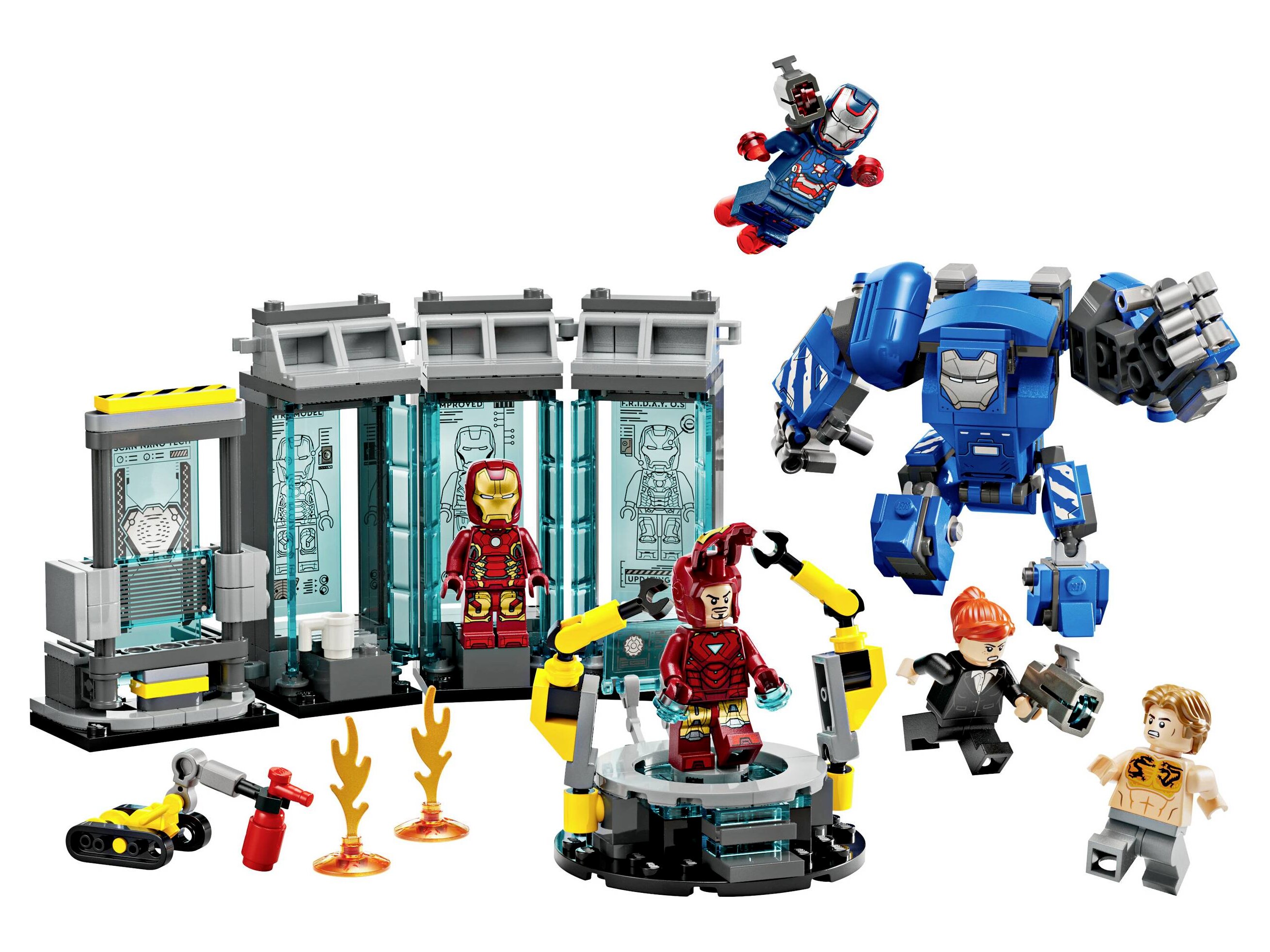 - Szuperhősfigurák – MK1, MK43 és MK6 Vasember-páncél, Pepper Potts és Aldrich Killian minifigurák, egy megépíthető Dum-E robot és egy MK3 robot, aminek mozgatható karjai és lábai, valamint felnyitható pilótafülkéje van