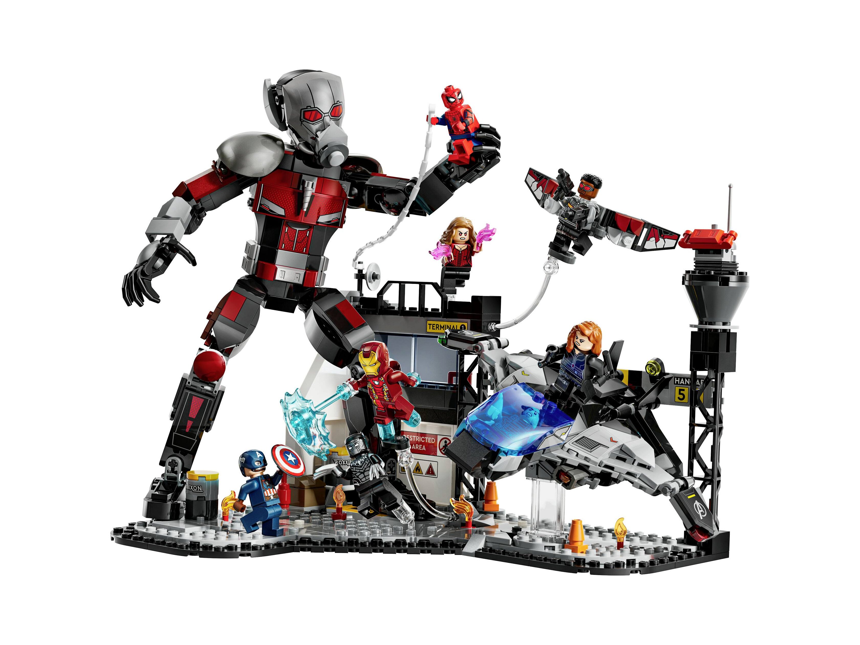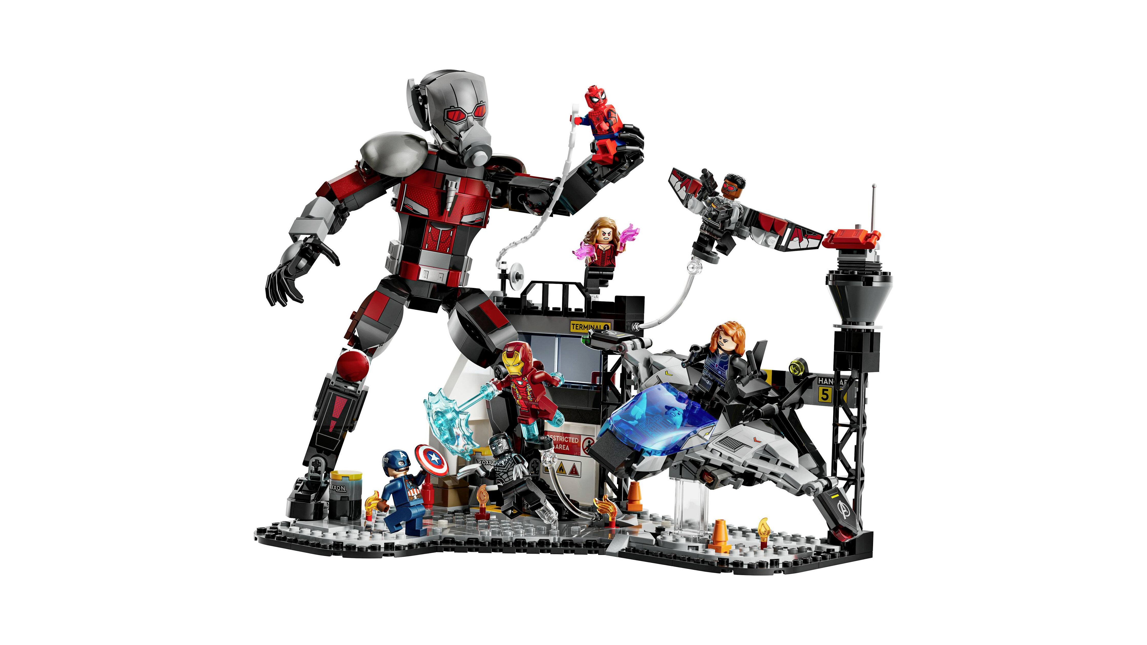 Ez a megépíthető játékkészlet a Marvel Studios Amerika Kapitány: Polgárháború című filmjének reptéri csatajelenete alapján készült. A szett 8 minifigurát tartalmaz: Amerika Kapitány, Tél Katona, Wanda, Sólyom, Vasember, Pókember, Fekete Özvegy és Fekete Párduc (mind fegyverekkel és kiegészítőkkel), valamint egy 24 cm magas, csuklós Hangya is a készlet része. A Quinjet repülőnek dupla szárnyai vannak, a pilótafülkéje pedig kinyitható, és egy minifigura ülhet bele. A csata izgalmait még tovább fokozza a szett felrobbanó hordó funkciója, amely a reptéri jelenetbe van beleépítve. A digitális LEGO Builder appban a gyerekek felnagyíthatják és megforgathatják a modelleket.