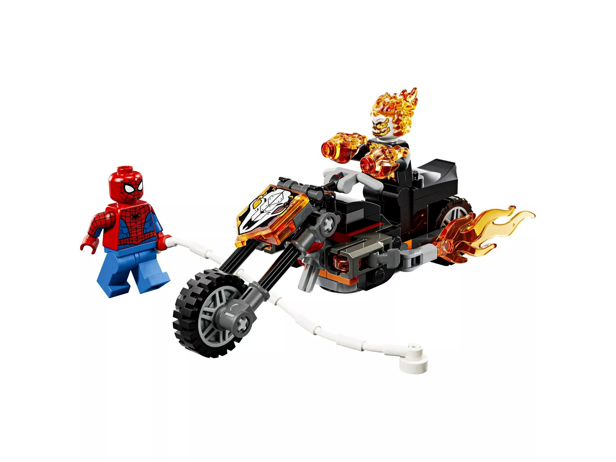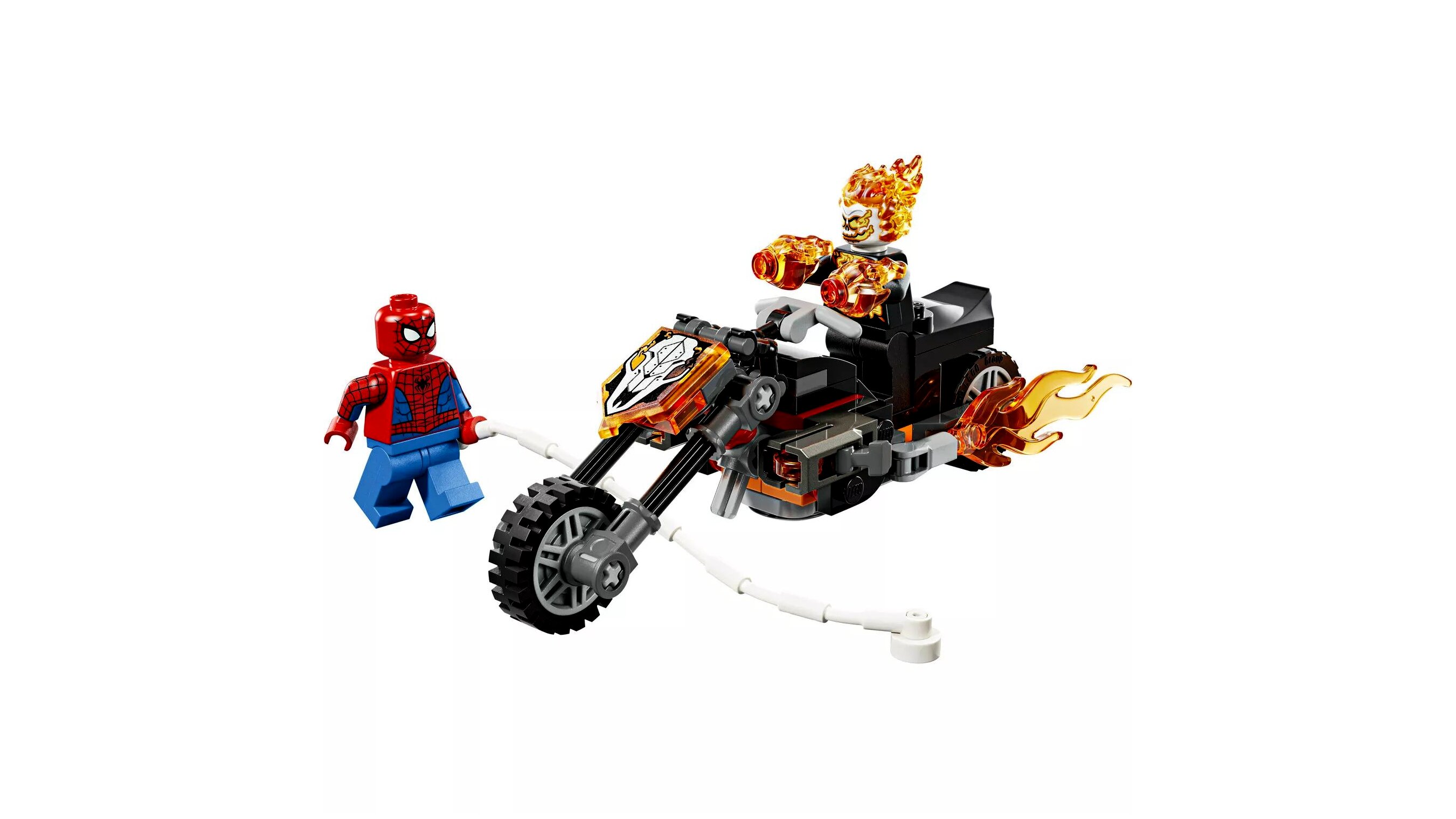 A készlet 2 dinamikus minifigurával ad azonnali alapot a történetmeséléshez: a hálóvető Pókemberrel és a látványos, lángoló csontvázként megjelenő Szellemlovassal.