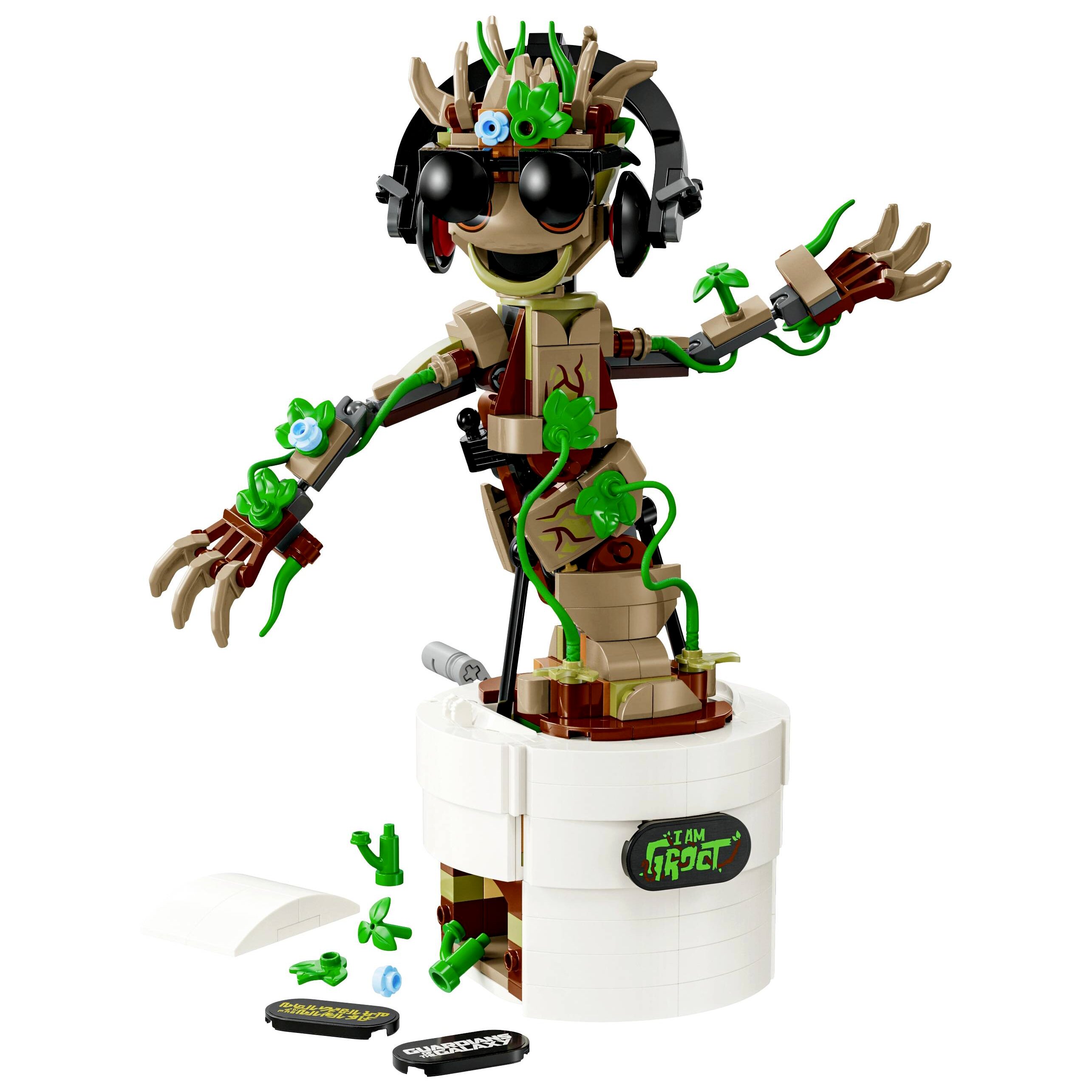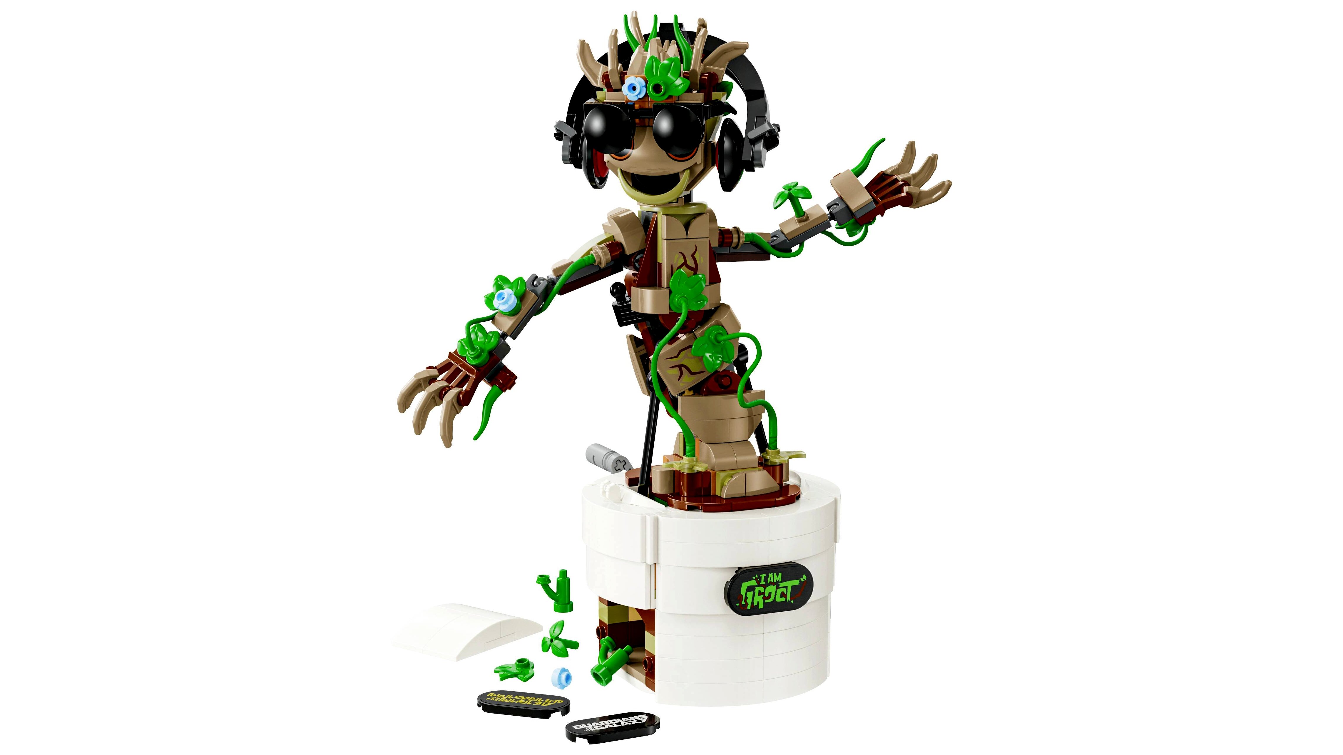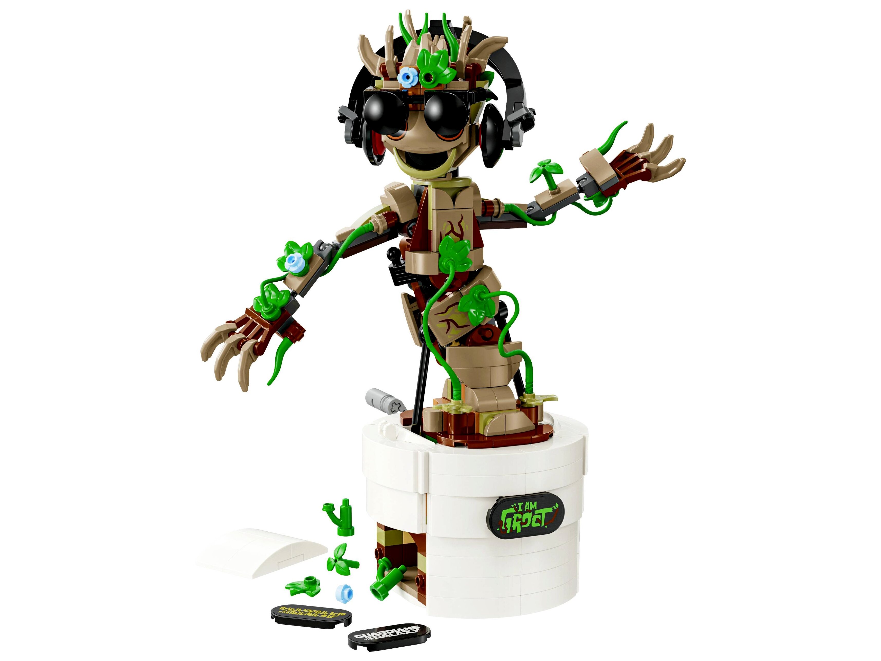 Egyerekeknek készült Groot-építőjátéknak mozgatható a feje, és beállíthatók a karjai. Amikor a gyerekek elfordítják a virágcserép hátulján lévő kart, a csuklós Groot táncolni kezd. A figurát plusz levelekkel, megépíthető fejhallgatóval és napszemüveggel lehet díszíteni, és a gyerekek testre szabhatják Groot cserepét a 3 különböző névtábla egyikével (az egyik a filmhez kapcsolódik: Én vagyok Groot). Az összes kiegészítőt a cserép beépíthető tárolójába rejtheted. Hogy még szórakoztatóbb legyen az építés, a LEGO Builder appal a gyerekek 3D-ben felnagyíthatják és elforgathatják a modelleket, és építés közben követhetik a haladásukat.