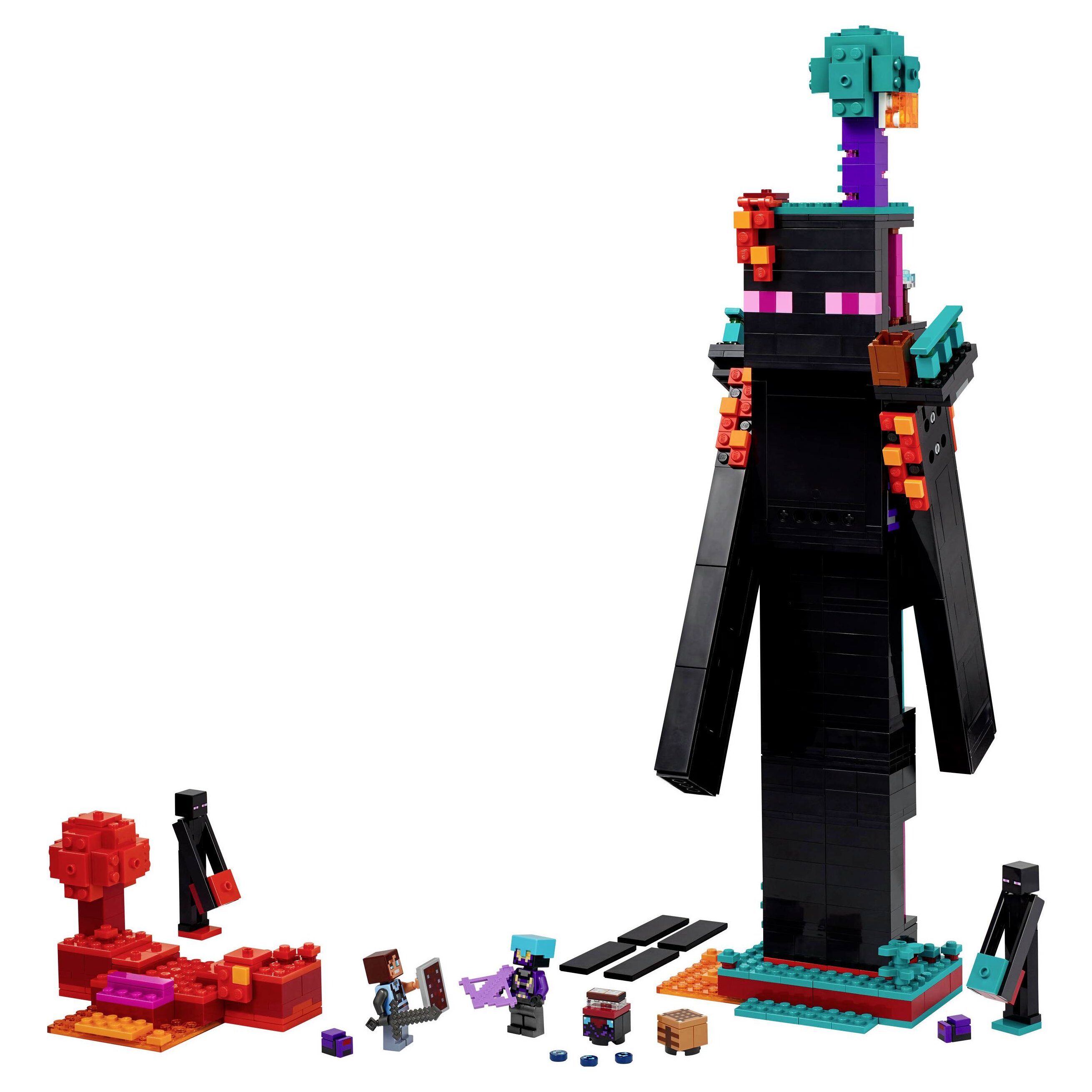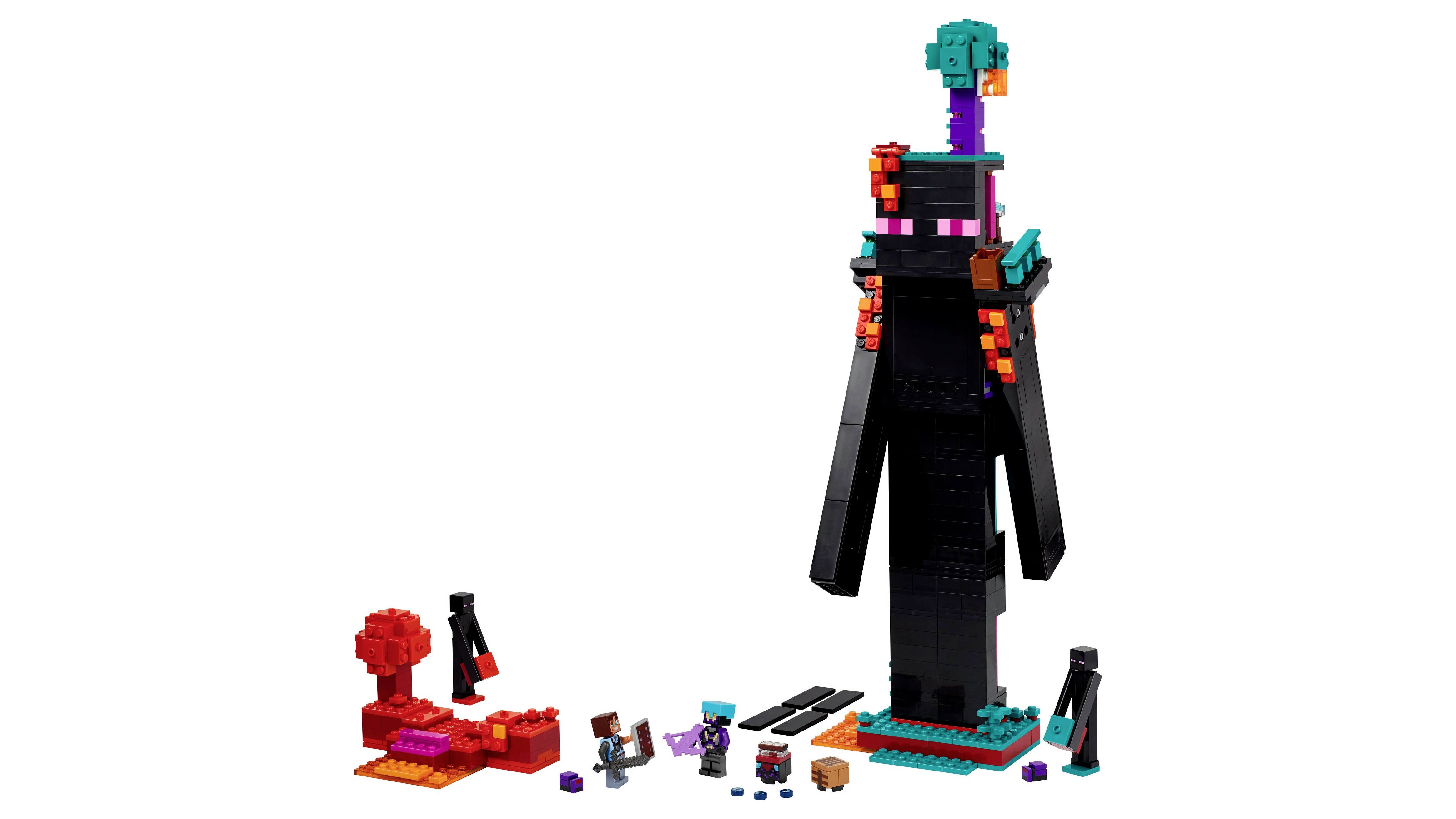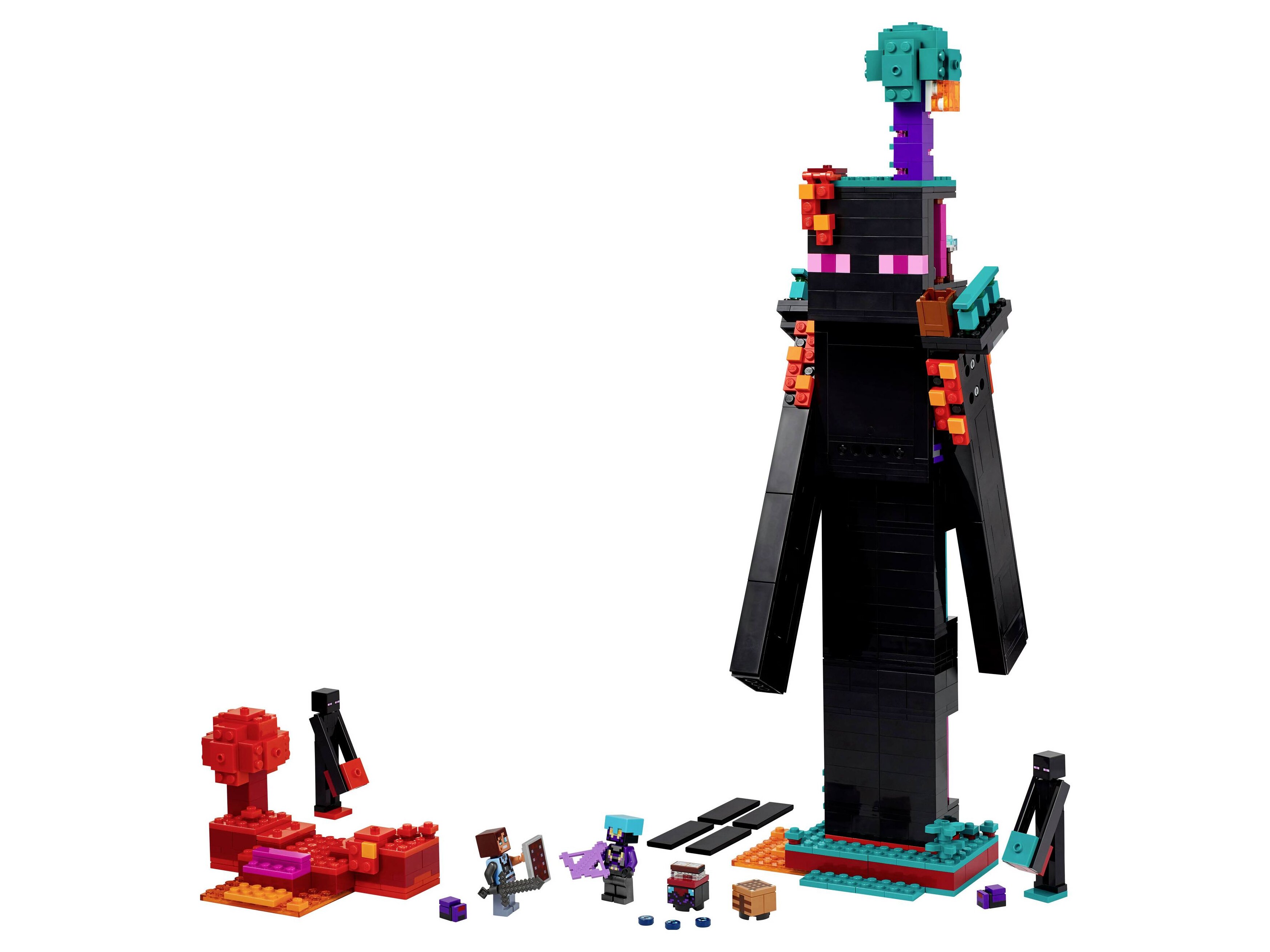 Az elsődleges építmény egy Bevégző alakú torony, fejében az alvilágportállal, mindkét vállán erkéllyel és 2 helyiséggel, amelyekben barkácsasztalt, bűvölőasztalt és tárolót találsz, ahová a bevégzőgyöngyöket teheted. A lábakon létrák vezetnek felfelé, a beállítható kezek csuklósak, a modell körül pedig a mocsaras erdő és a karmazsin erdő biomok elemei kapnak helyet. A készlet Dimenziós védelmező, Realm Raider és 2 Bevégző-minifigurát, valamint 2 végbogár mobfigurát tartalmaz. A szett olyan fegyverekkel vár, mint a nyílpuska, az alvilágérc kard és a pajzs. A Bevégzőtorony-modell 2 különböző színű erőddé építhető át, így a játékosok egymás ellen csatázhatnak. Építsd meg a LEGO® Builder app segítségével! A szett 867 elemből áll.