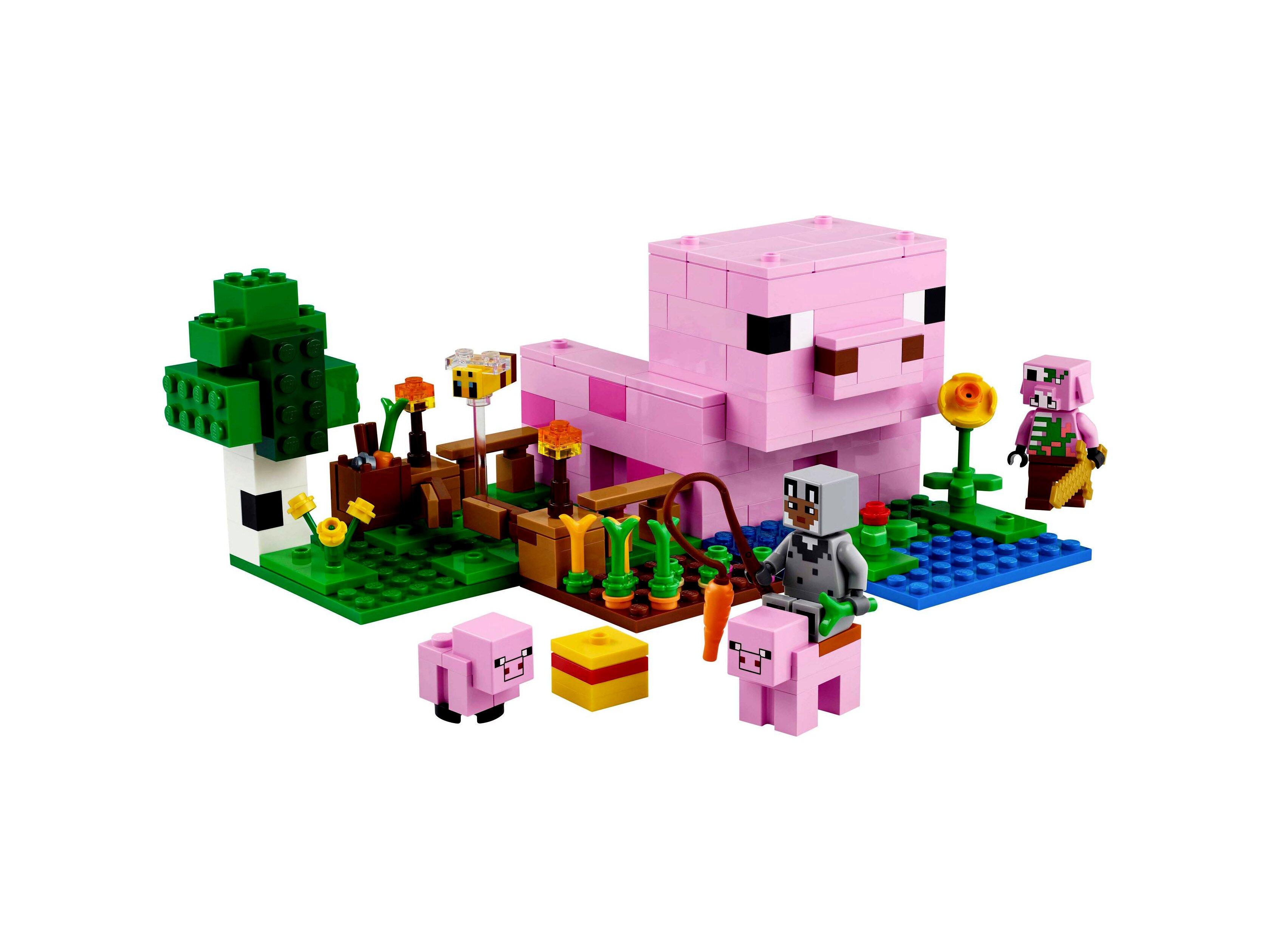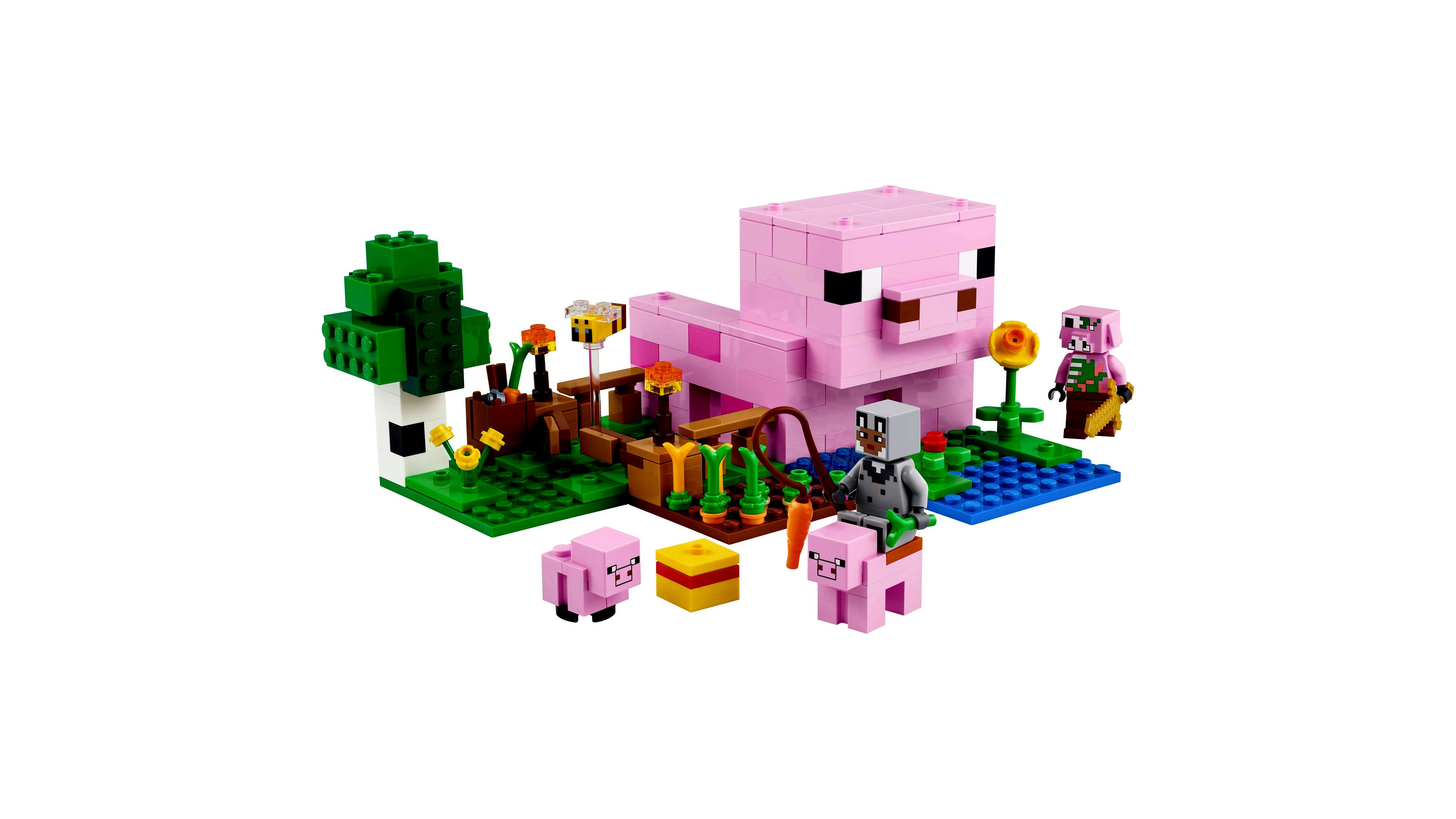 - LEGO® Minecraft® A kismalac háza – A gyerekek egy malac formájú házat építenek, amelyhez tartozik egy farm, ahol burgonyát és céklát nevelnek, valamint egy mező kapuval, amelyen átvezetik a kismalacot, és ez még nem minden!