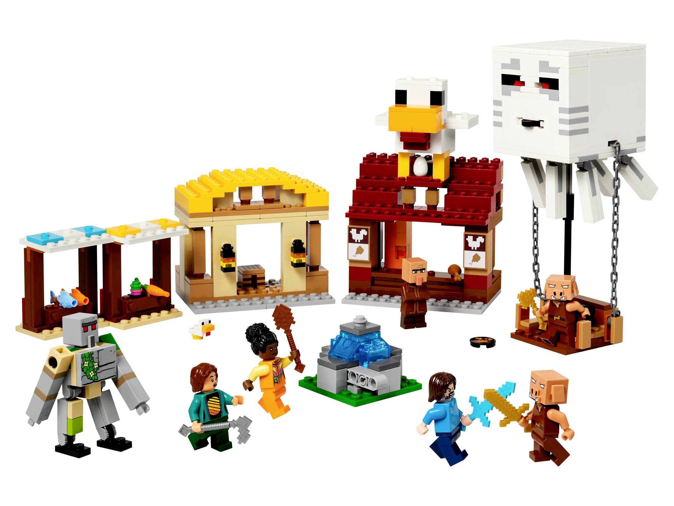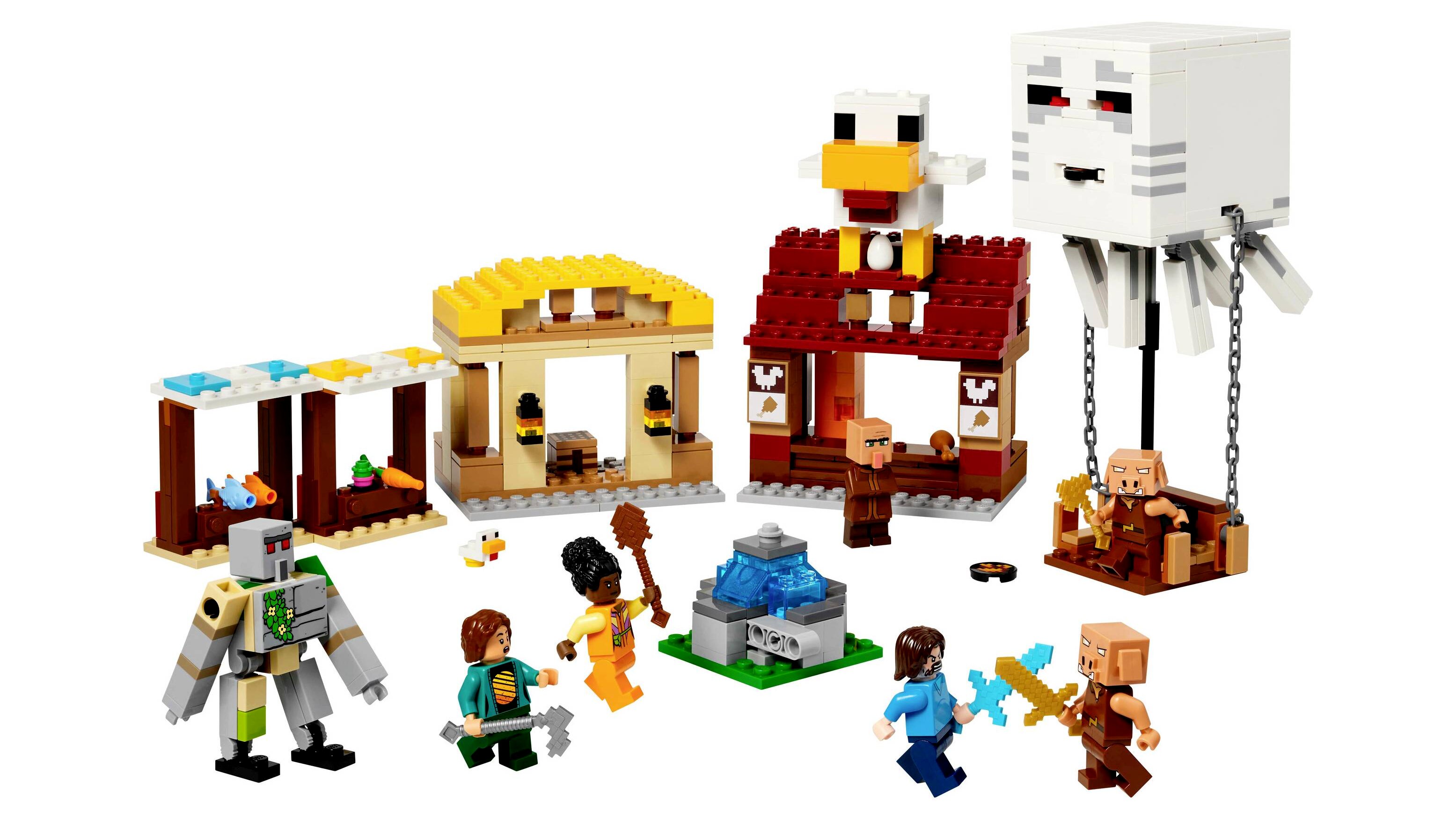 A készlet a videójátékból ismert szereplőket tartalmazza: Steve, Natalie, Dawn, 2 malacka, egy szellemléghajó, egy falusi, egy kiscsirke és egy beállítható vasgólemfigura. A léghajóban van hely a malackák számára, és van rajta egy korongvető is. A falusi jelentben piaci pultok, Steve sült csirkét áruló étterme, barkácskunyhója, valamint egy szökőkút található, amit a gyerekek egy beépített funkcióval „felrobbanthatnak”. Az étterem tetején egy hatalmas csirkemodellt találsz, szórakoztató, „tojást tojó” funkcióval. A digitális élmény érdekében a LEGO Builder alkalmazásban a gyerekek felnagyíthatják és 3D-ben elforgathatják a modelleket, és követhetik a haladásukat.