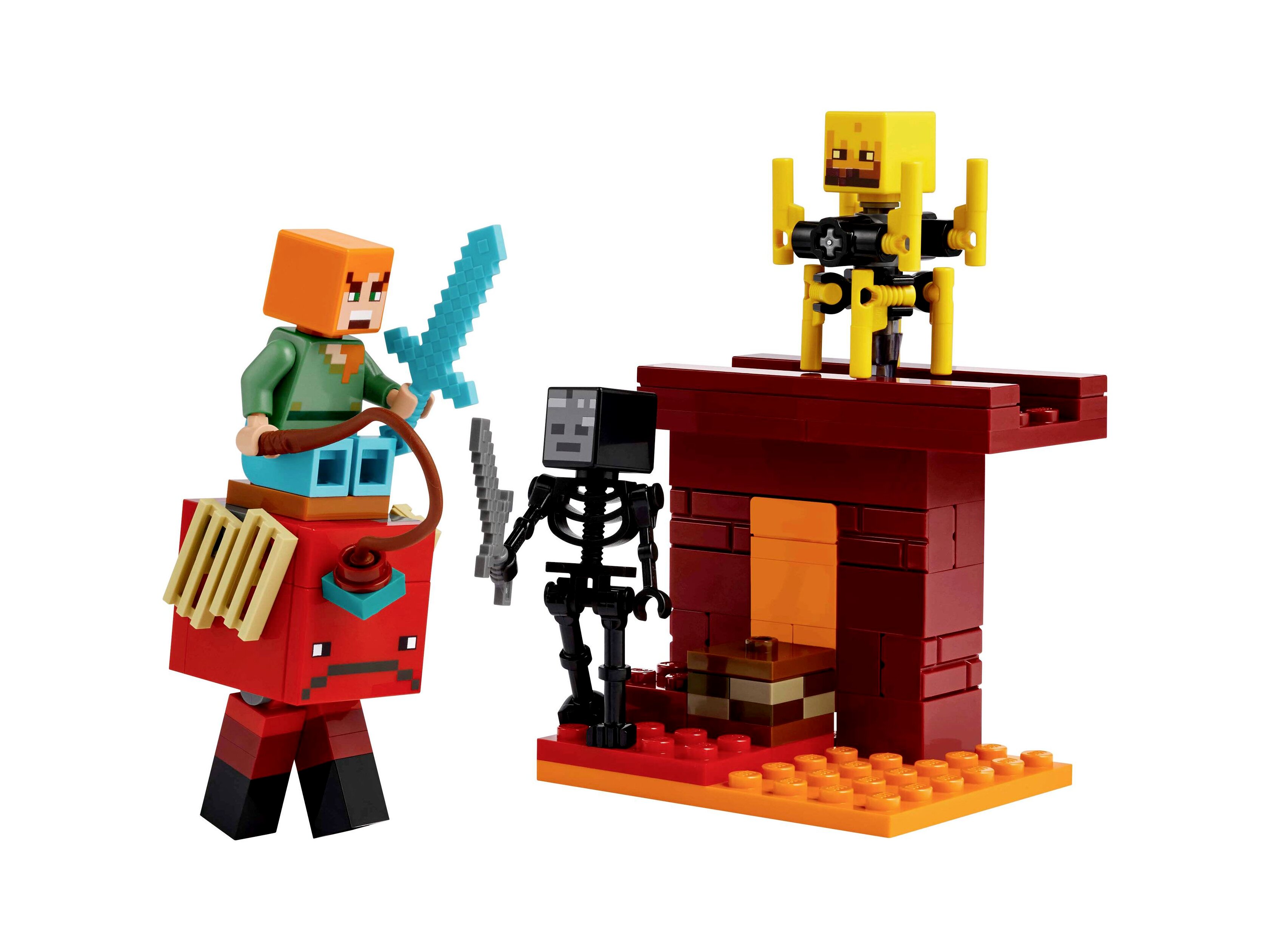 A gyerekek csatlakozhatnak a Minecraft akcióhőséhez, Alexhez, és küldetésre indulhatnak vele, hogy eltávolítsák az ősi törmelékeket a Karmazsin erdőben lévő Alvilági erőd hídjáról. Amikor eltávolították a törmeléket, a lávaelem automatikusan megindul lefelé, és Minecraft figurák (egy kőkardot forgató csontváz és rudat forgató őrláng) próbálják megakadályozni, hogy Alex elmeneküljön. A gyerekek egy ikonikus gyémántkarddal küzdhetnek a mobok ellen, mielőtt egy Minecraft figura, a strider hátára ülnek, akinek beállítható lába és nyerge van. A Minecraft játékosok tudják, hogy szerezniük kell pár torz gombát, hogy irányítani tudják a stridert. Az extra digitális élmény érdekében a gyerekek 3D-ben felnagyíthatják és elforgathatják a modelleket a LEGO Builder appban.