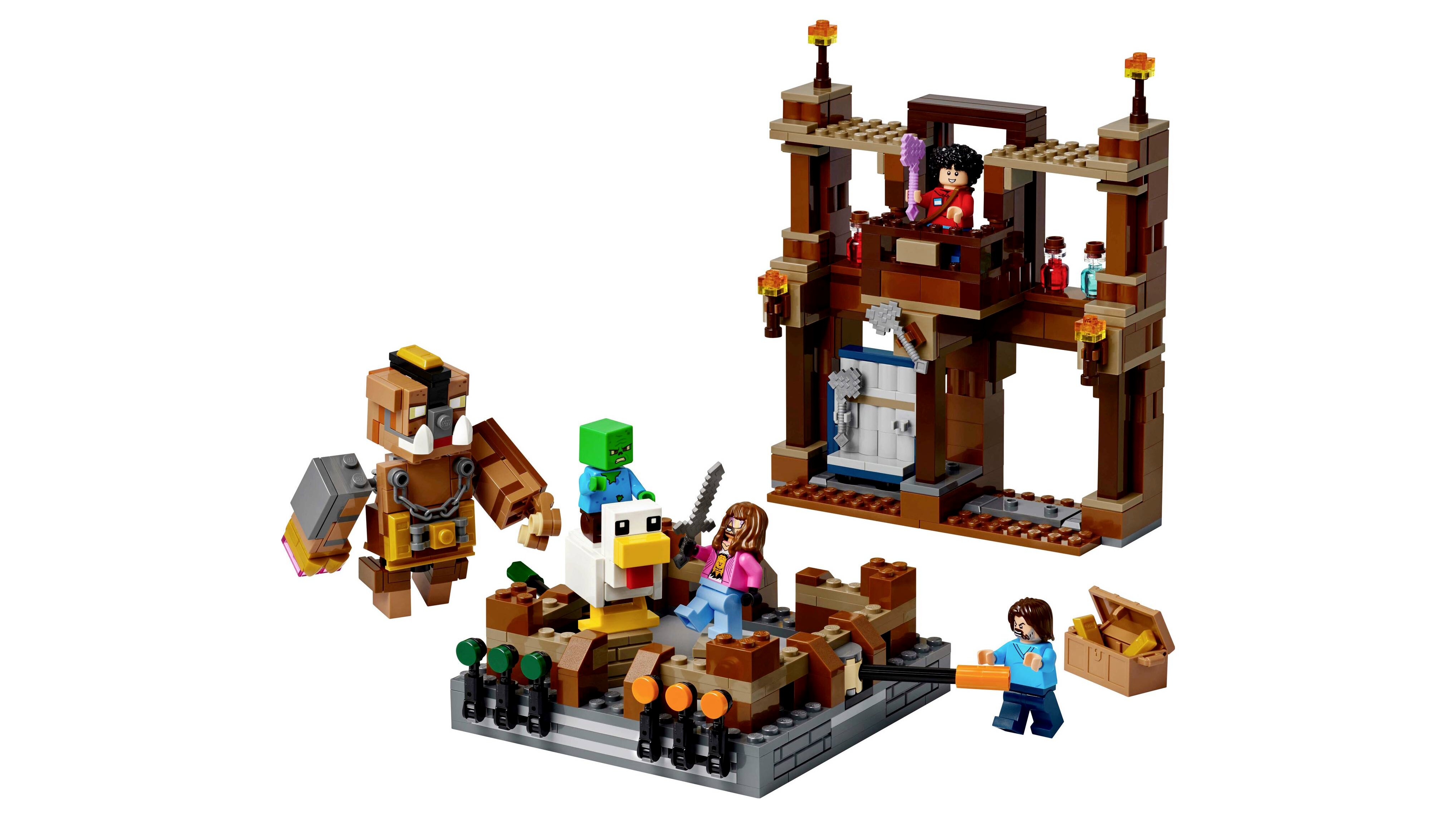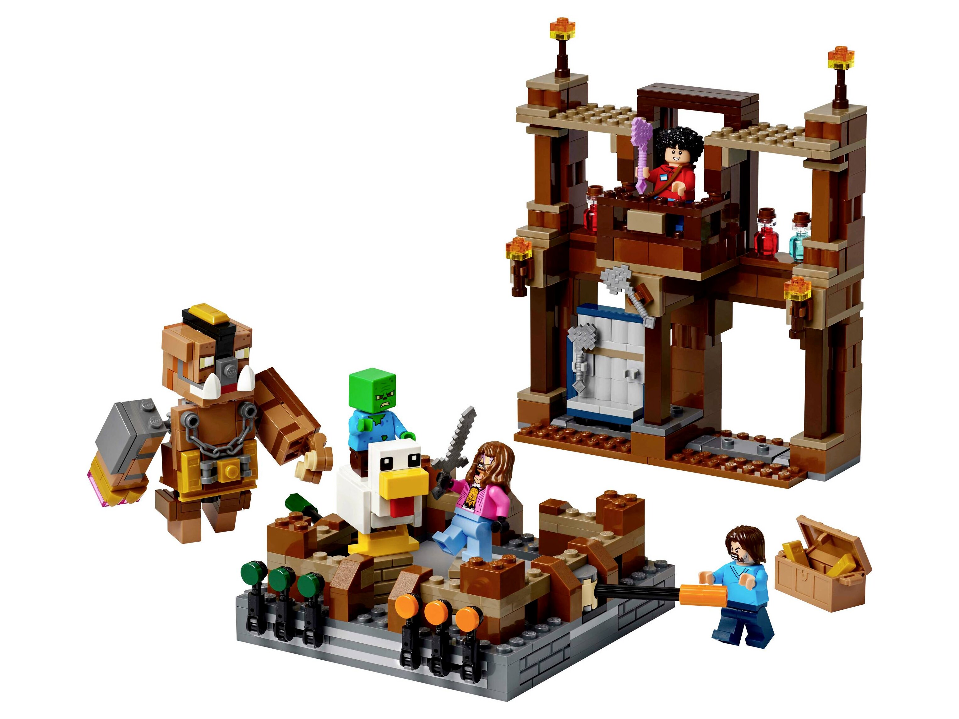 Ez a LEGO® Minecraft építőkészlet a film játékfiguráit (Steve, Garrett, Henry, zombibaba, csirkezsoké és beállítható Disznók Ura), továbbá fegyvereket és bájitalokat tartalmaz, amelyeket a gyerekek a csatajelenetek közben és az új felfedezőkalandok során használhatnak. A készlet tartalmaz egy működő küzdőteret, amely pontozótáblákat és karokat is tartalmaz, amelyekhez a gyerekek a figurákat rögzíthetik. A készlet része még egy épülethomlokzat, ahol levehető kincsesládát és fegyverállványt is találsz. A digitális élmény érdekében a LEGO Builder appban a gyerekek felnagyíthatják és 3D-ben elforgathatják a modelleket, és követhetik a haladásukat.