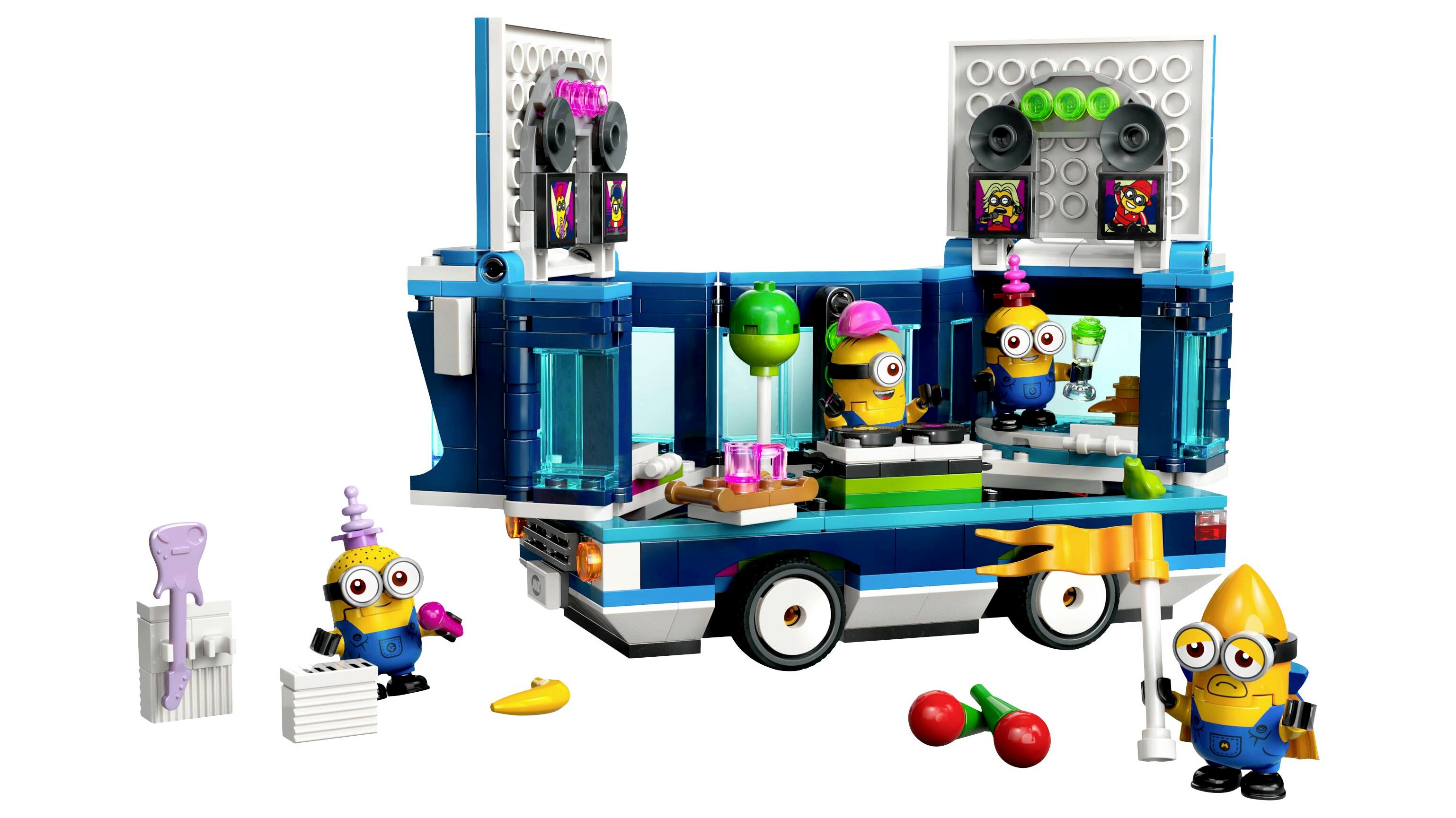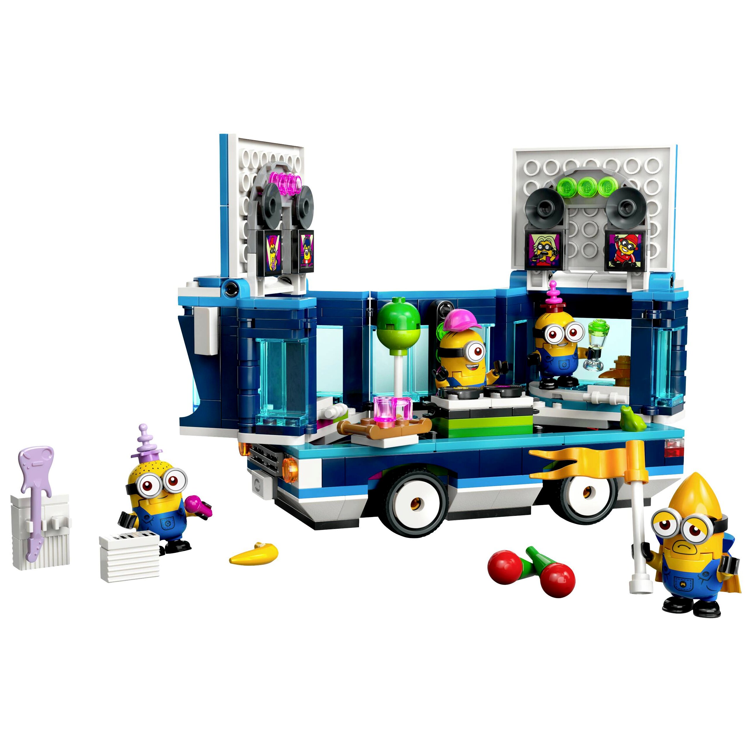 A szett 4 minyonfigurát tartalmaz: Phil, Mel, Dave és a magasan repülő mega minyon, Guszti, aki először a Gru 4. című filmben jelenik meg. A busznak van vezetőülése, a tetején pedig egy bár található, ahol Guszti tud lógni. A busz egyik oldala középen szétnyitható, a tetőt pedig le lehet emelni, hogy felfedezhesd a táncteret, a DJ-pultot, az elektromos gitárt, a zongorát, a mikrofont, a fényeket, a hangszórókat és a pezsgőfürdőt! Sok elemet ki lehet venni a buszból, hogy máshol is lehessen velük játszani. Ez a vidám, gyerekeknek készült szett telis-tele van élénk színekkel és olyan vagány kiegészítőkkel, mint a zászló, a lufi, a fagyi, a kalapok, a lámpák, a hangszórók és a monitorok. A LEGO Builder app a digitális élményt is biztosítja a gyerekek számára.