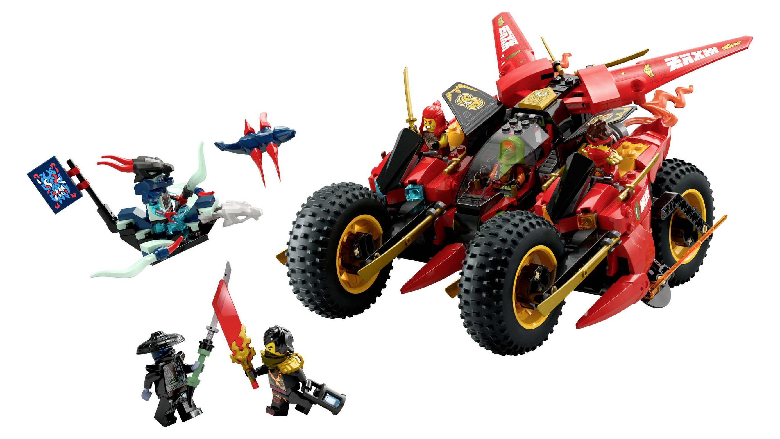- Leválasztható nindzsajárművek – A hatalmas NINJAGO® jármű 3 kisebb járműre bontható: Kai nindzsamotorjára, Wyldfyre nindzsamotorjára és Frak 2 korongvetővel felszerelt, játék repülőjére
