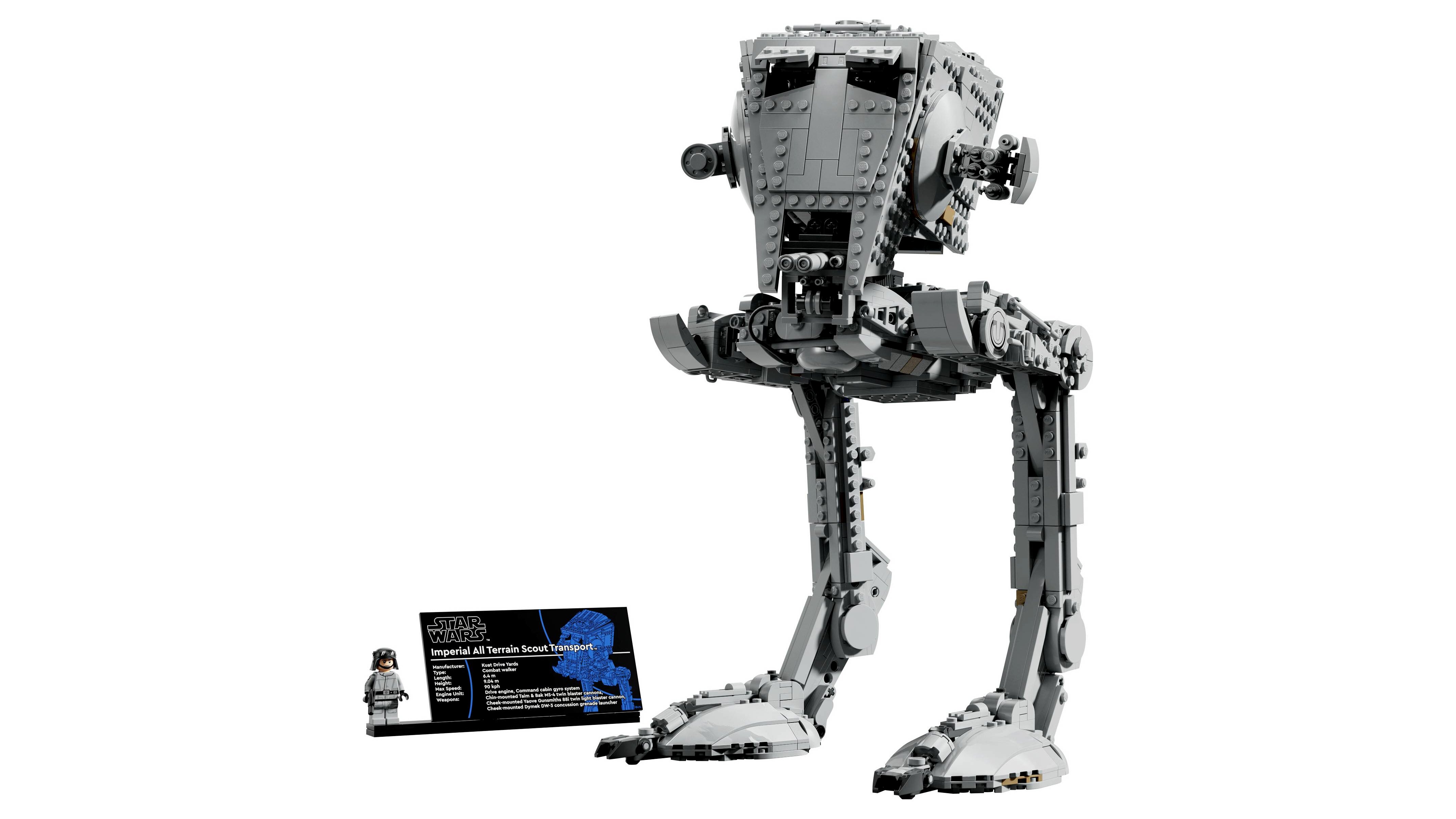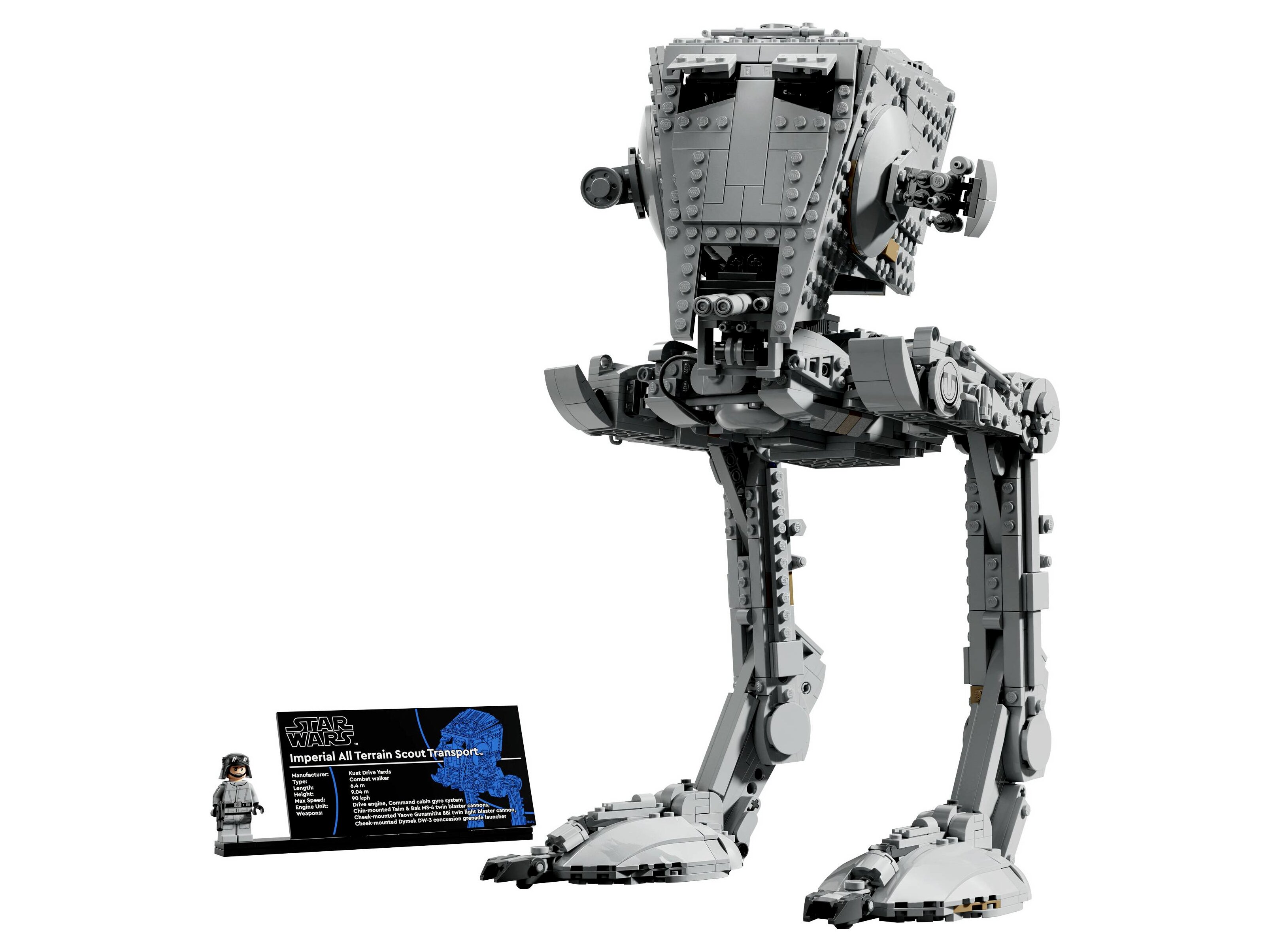 Ehhez a gyűjthető, kockákból épült járműhöz tartozik egy információs tábla és egy különleges LEGO Star Wars minifigura (egy AT-ST pilóta a Birodalom címerével a karján), hogy teljes legyen ez a lenyűgöző kiállítási darab.