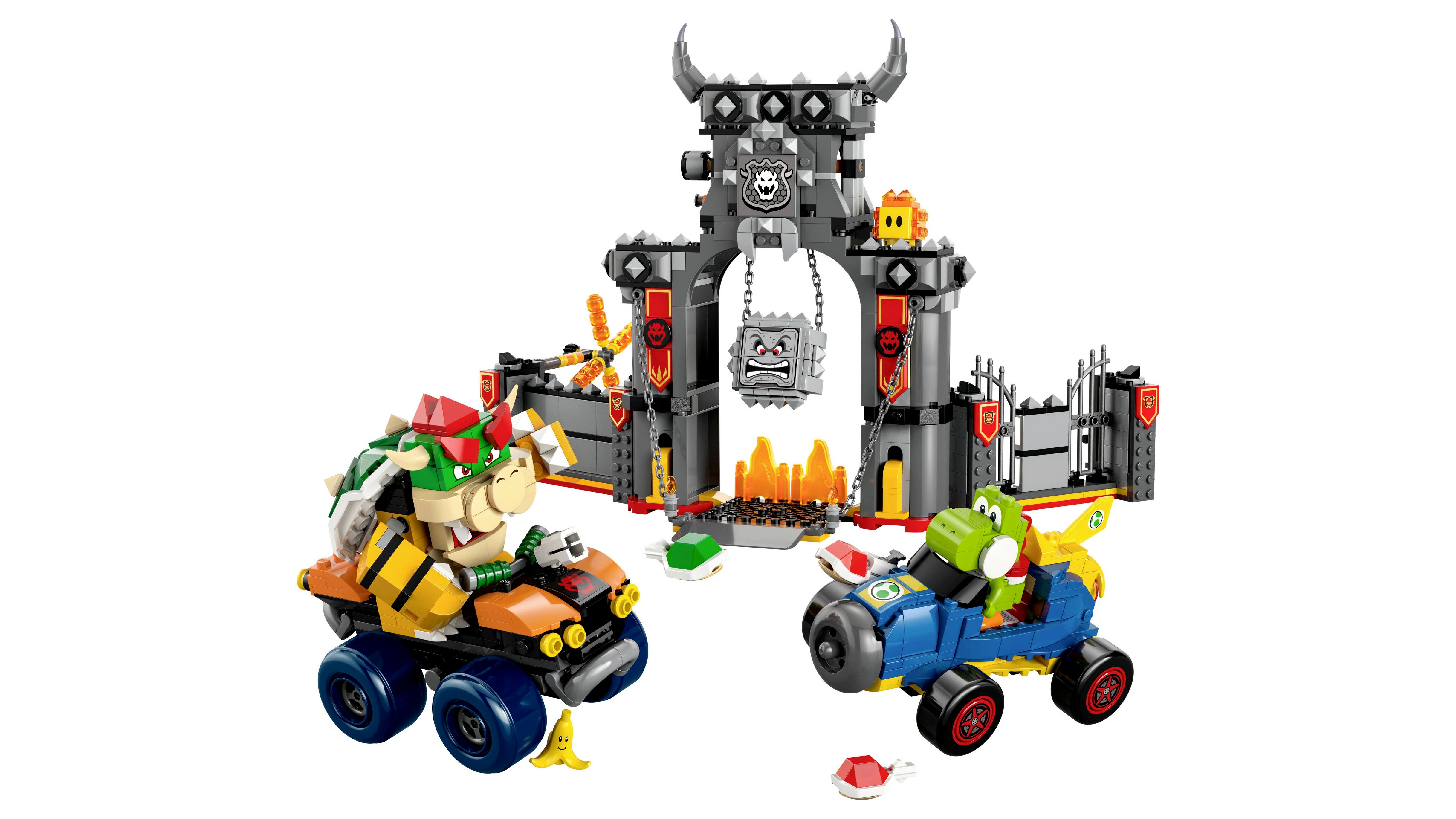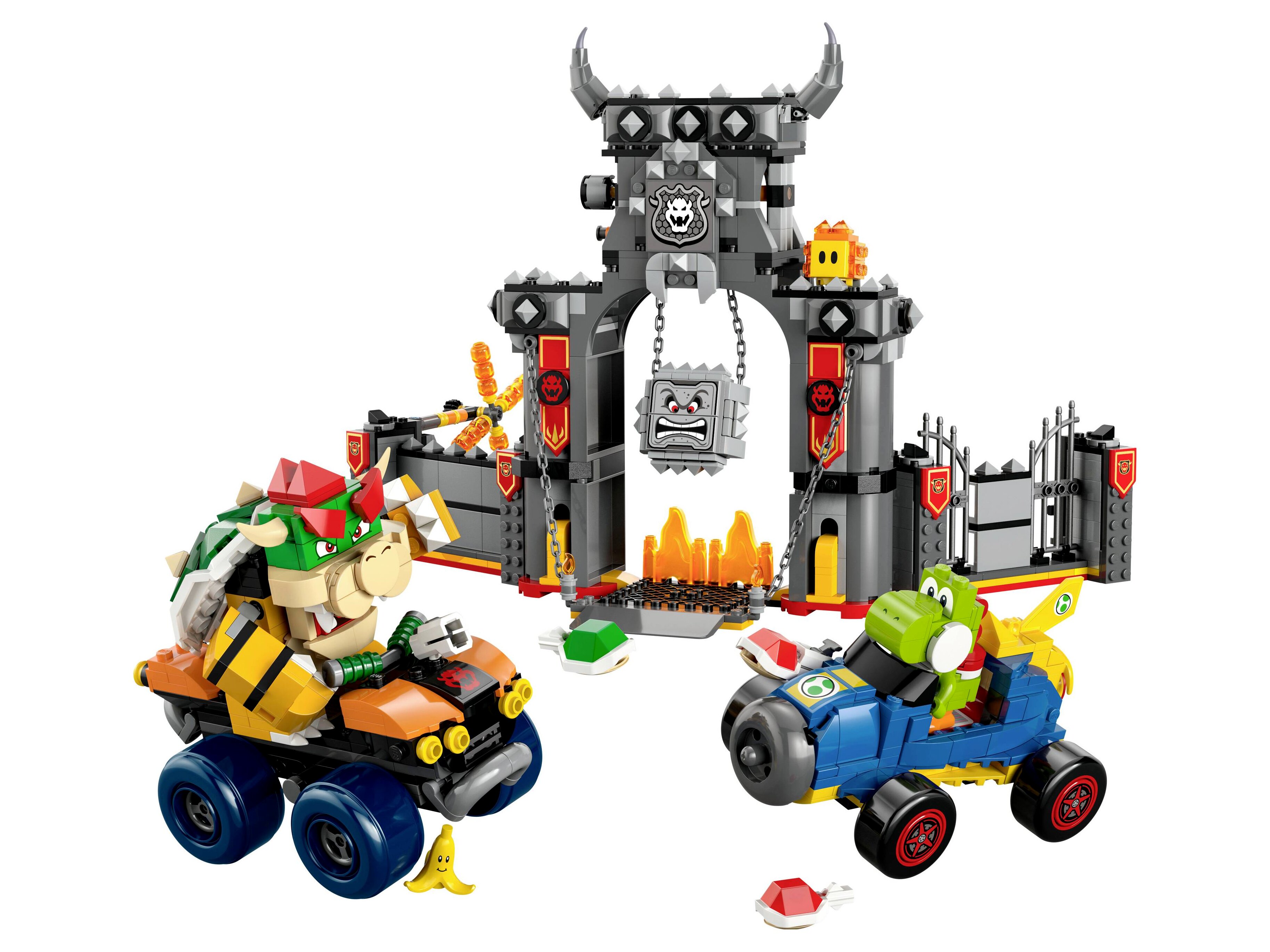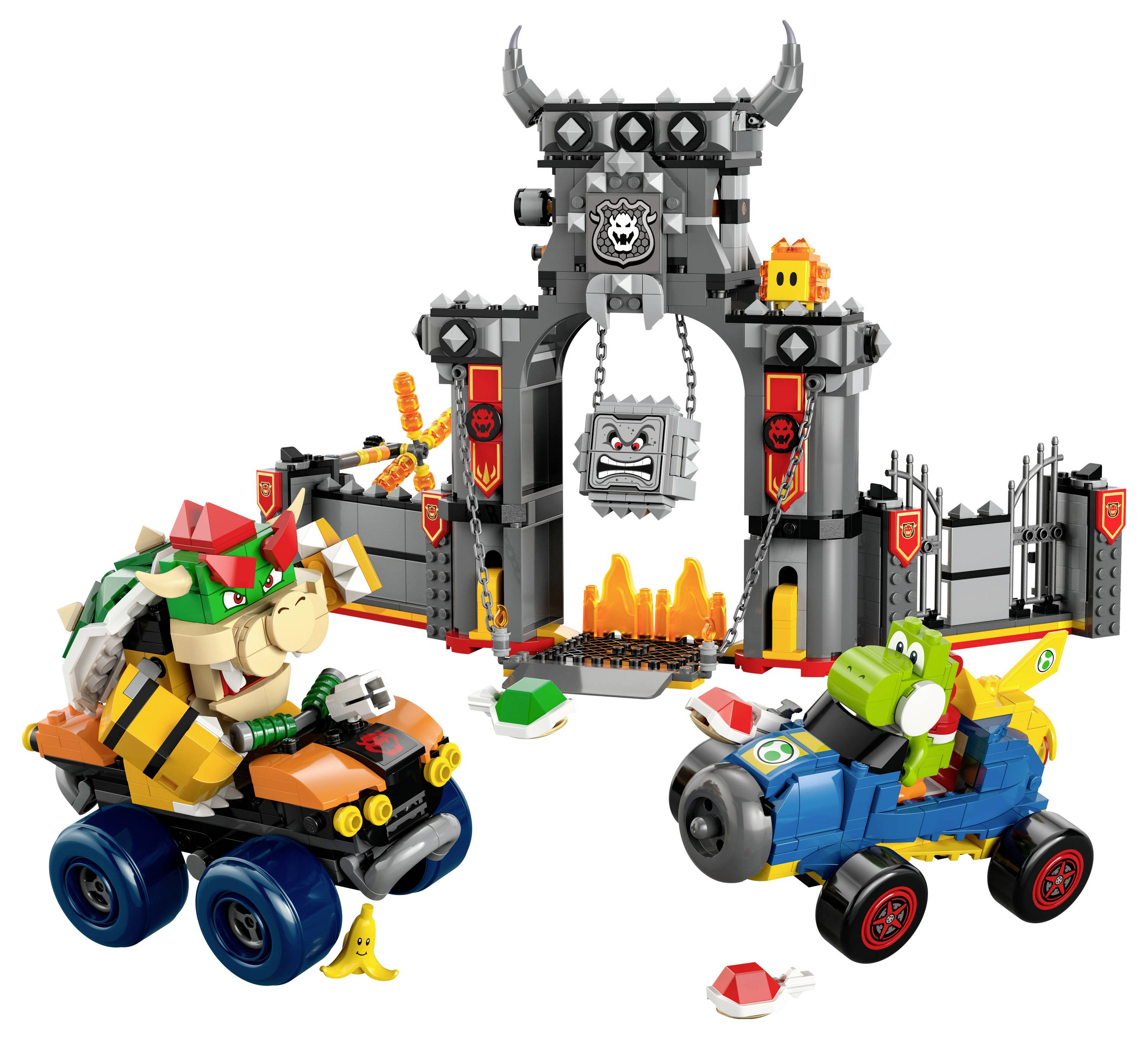 - Bowser kastélya – Versenyeztesd Bowsert és Yoshit, törd át a kastély falait, és kerüld ki a lezuhanó Thwompot ebben a gyerekeknek készült, játék járművet tartalmazó LEGO® Super Mario™: Mario Kart™ játékkészletben!