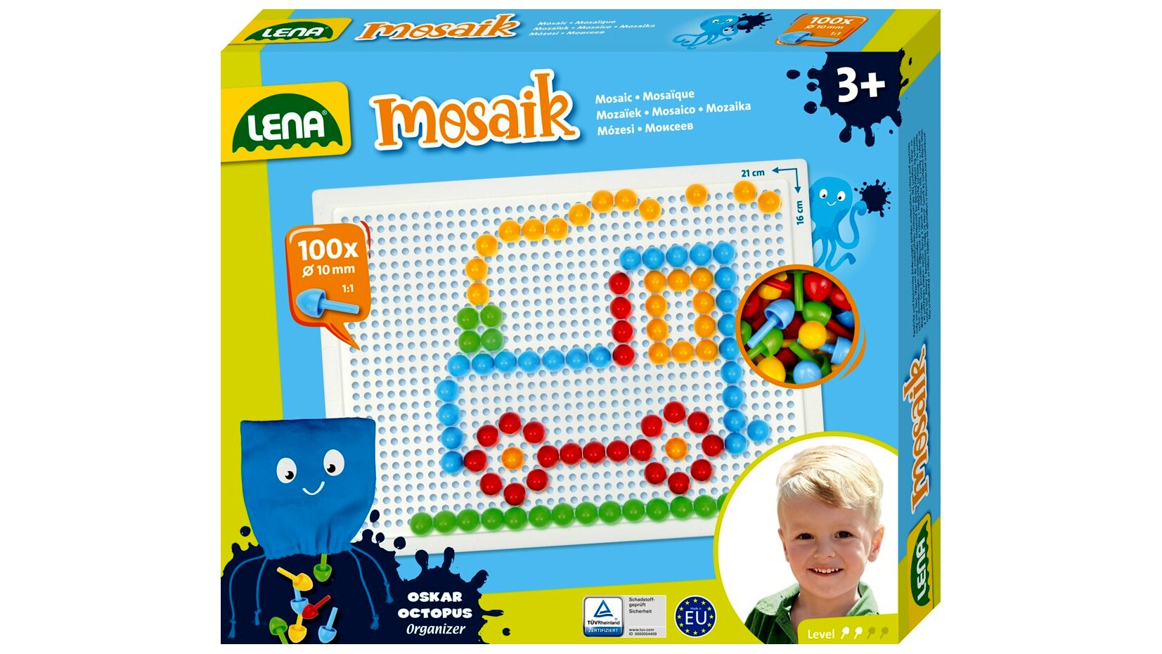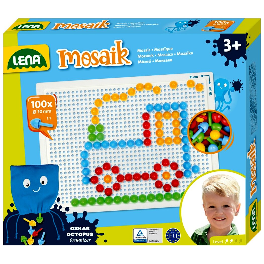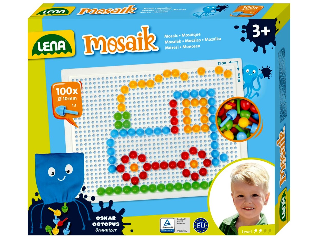Lena pötyi mozaik képkészítő készlet. A készletben 100 darab, 10 mm átmérőjű, különböző színű kis pötyi található, melyekkel a gyerekek bármilyen általuk tervezett képet kirakhatnak. Remekül fejleszti a kézügyességet és a kreativitást.