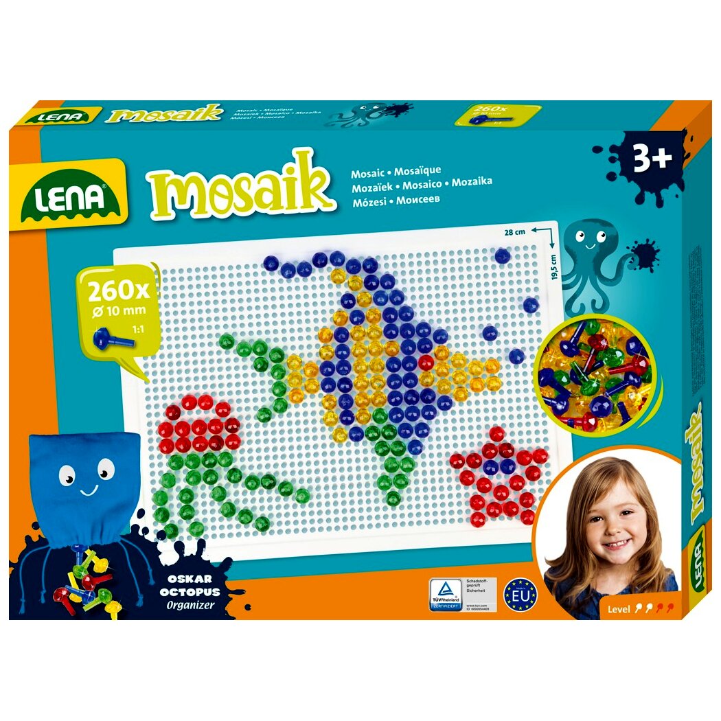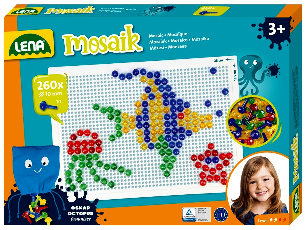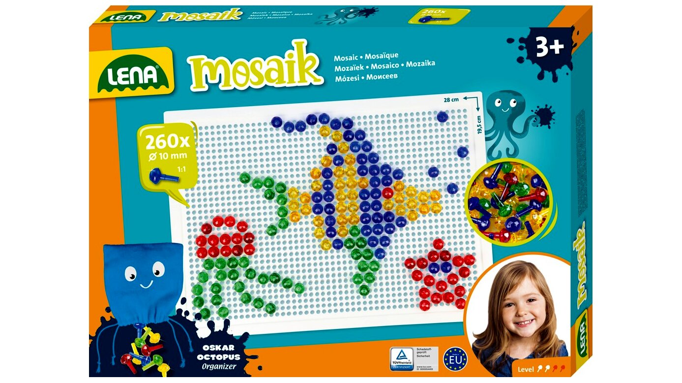 Lena pötyi mozaik képkészítő készlet. A készletben 260 darab, 10 mm átmérőjű, különböző színű kis pötyi található, melyekkel a gyerekek bármilyen általuk tervezett képet kirakhatnak. Remekül fejleszti a kézügyességet és a kreativitást.