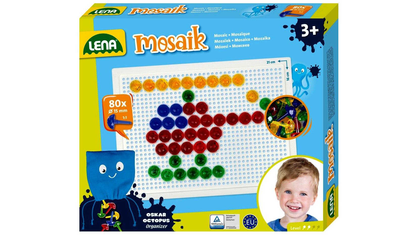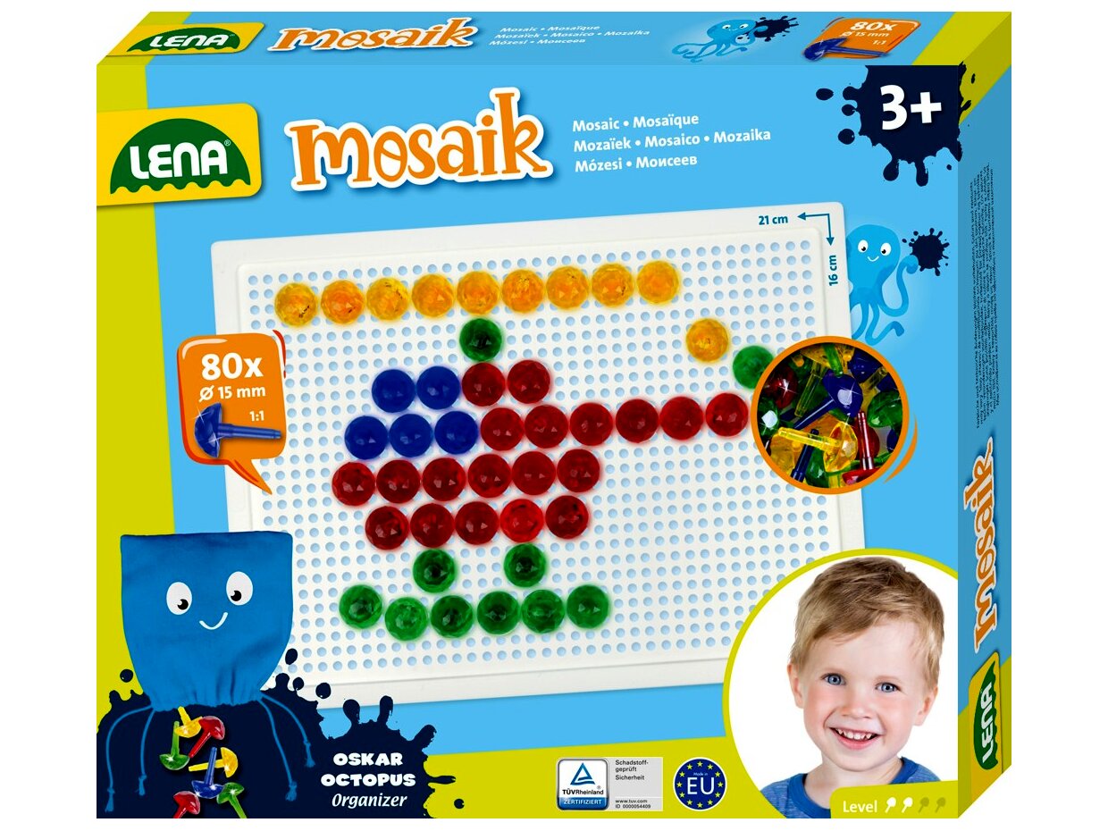 Lena pötyi mozaik képkészítő készlet. A készletben 80 darab, 15 mm átmérőjű, különböző színű kis pötyi található, melyekkel a gyerekek bármilyen általuk tervezett képet kirakhatnak. Remekül fejleszti a kézügyességet és a kreativitást.