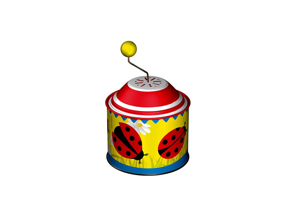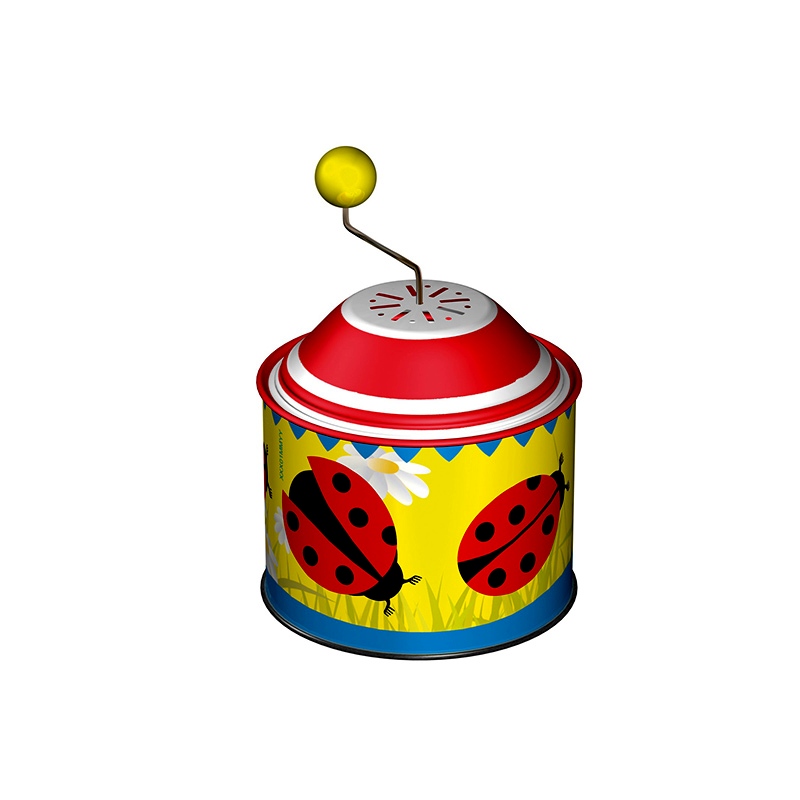 Katicákkal díszített, fémből készült Lena zenélő henger. A tetején található kis kart tekerve kedves kis dallamot játszik.