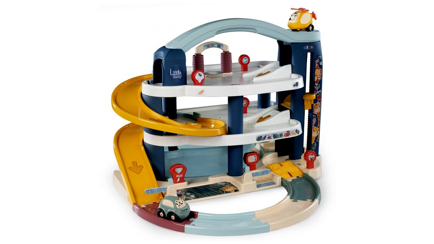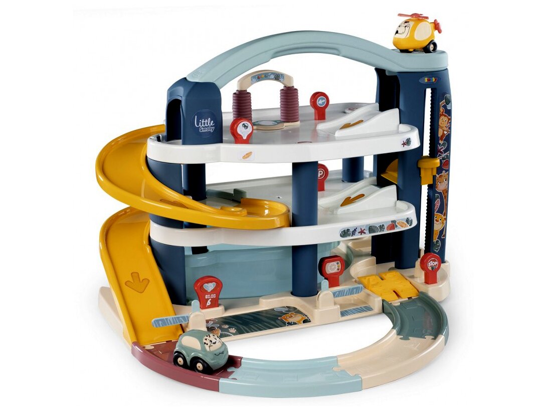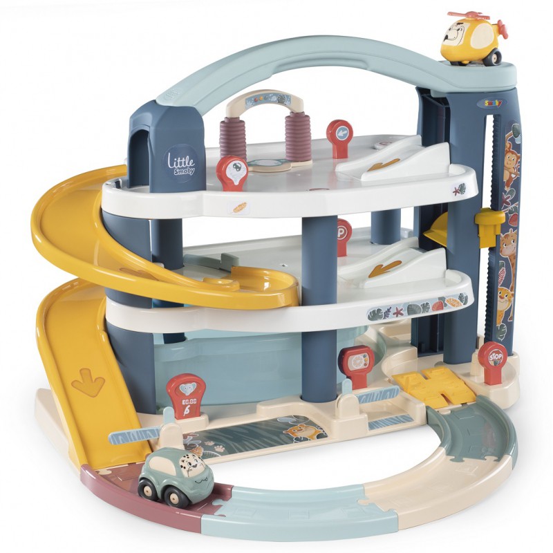 A Little Smoby sorozat a legkisebb autó- és garázsrajongó gyerekeknek készült. A pasztell színű pályaelemek és a járgányok elegáns megjelenést kölcsönöznek a játéknak, így könnyedén a szoba díszévé is válhat.A háromszintes garázsban lift, autómosó (forgó törlőkendővel), helikopterleszálló és egy csúszda is található. A fogantyúnak köszönhetően a garázst bárhová magukkal vihetik a gyerkőcök, továbbá a kisautók is remekül tárolhatóak benne. A kisautók mókás állatarcokkal vannak ellátva.