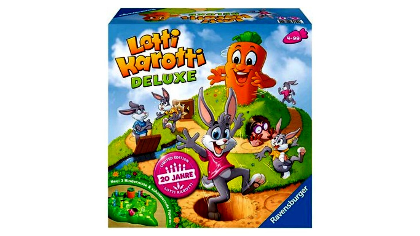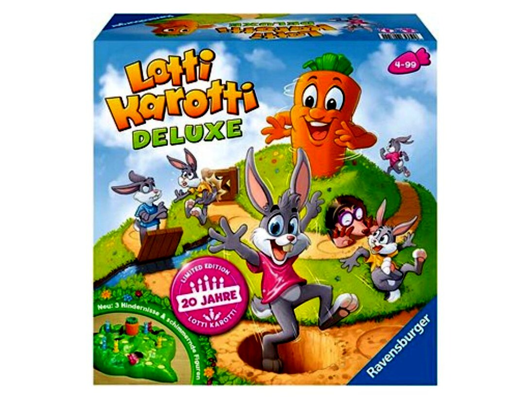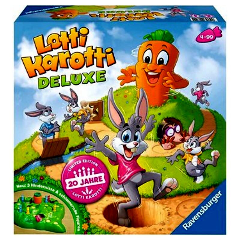 A Lotti Karotti Deluxe - Tréfás Répák társasjátékkal szórakoztató nyúlversenyt rendezhet a család apraja és nagyja. A Deluxe kiadás játékszabálya ugyanaz, mint az eredeti Lotti Karotti díjnyertes társasjátéknak: a nyúlcipőt húzó tapsifülesek célja, hogy elérjék az óriásrépát, ami pontosan a játéktáblaként szolgáló dombocska közepén kandikál ki a földből.A játék kezdetén a játékosok 4-4 nyúlfigurával indulnak, és a felhúzott kártyáknak megfelelően egyre feljebb lépegetnek a játéktáblán. Ha a kártyájukon egy sárgarépa jelenik meg, az adott játékosnak úgy kell fordulnia, hogy a sárgarépa a játéktér közepén legyen, azonban vigyázat, könnyen megtörténhet, hogy ekkor az egyik figura a földre huppan. A Deluxe kiadásban a nyulacskák útját egy vakond is állhatja, a kapu egy szinttel hátrébb mozdíthatja, a felvonóhíd pedig egy körre késleltetheti a játékosok továbbhaladását. Az a játékos nyer, aki először eléri a répát.