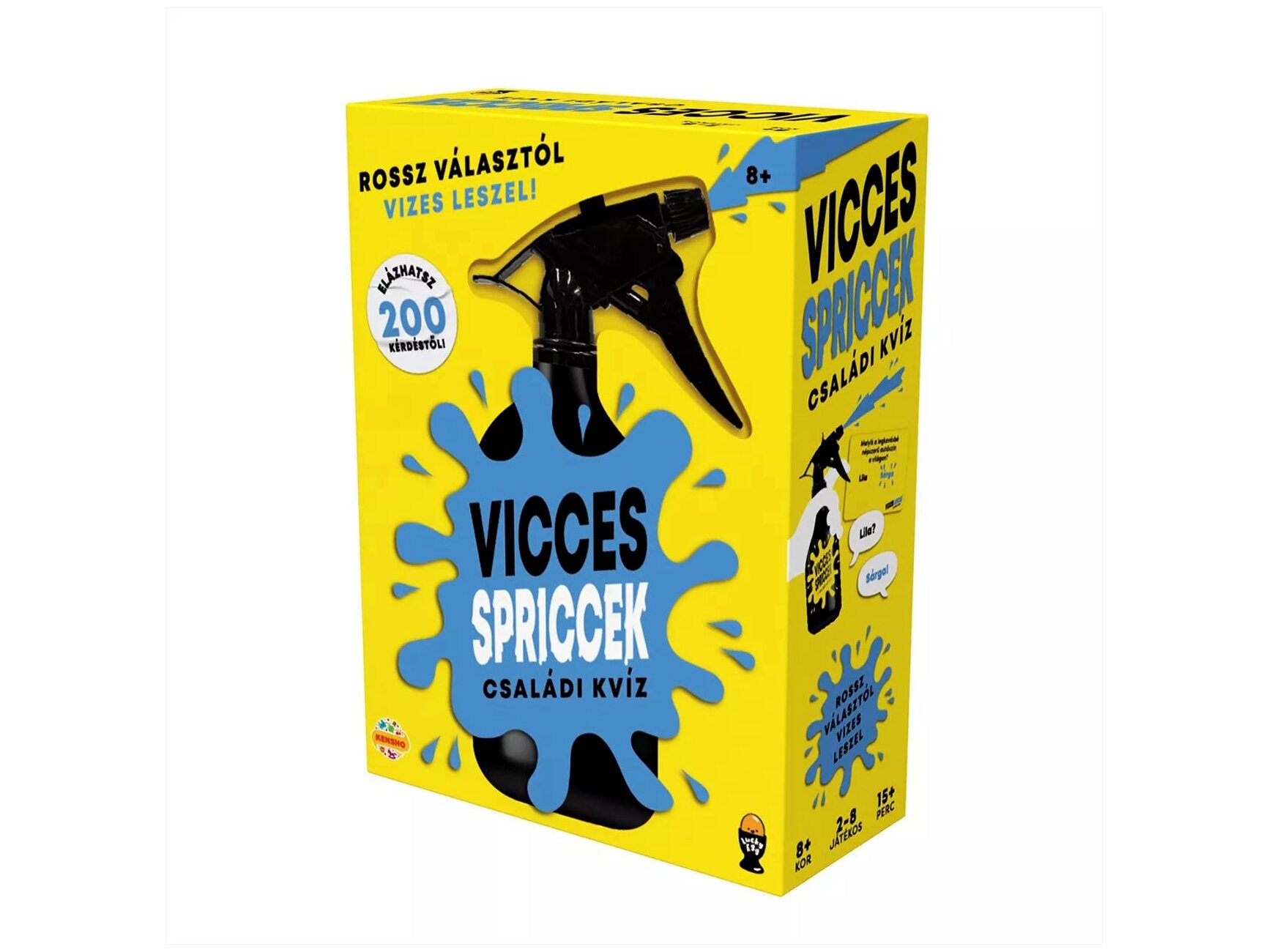 Egy családi kvíz, amit senki nem úszhat meg szárazon! A Vicces Spriccek társasjátékban szokatlan kérdésekre kell válaszolnotok. Azonban ha valaki rosszul felel, vízsugárral néz szembe! A vételkedő kiegyensúlyozottságát az aktuális kérdéskártyák adják, melyek pont annyira modernek, hogy két generáció is jártas legyen a témákban. A dobozban 200 kérdéskártyát találtok, egy spriccelőt és egy dobókockát. Maradjatok résen, maradjatok szárazon, és merüljetek bele a játékba! A Vicces Spriccek társasjátékot 8 éves kortól ajánljuk, melybe egyszerre 2-8 játékos csatlakozhat.