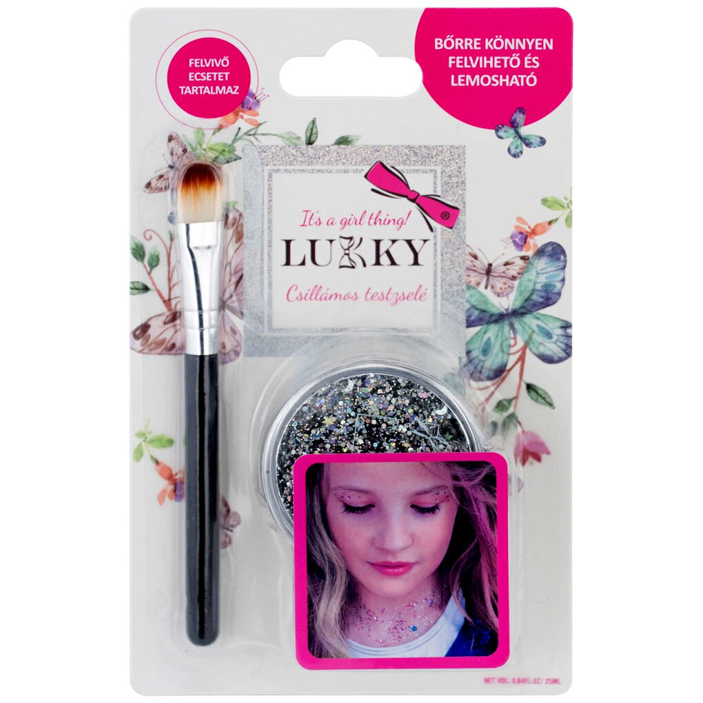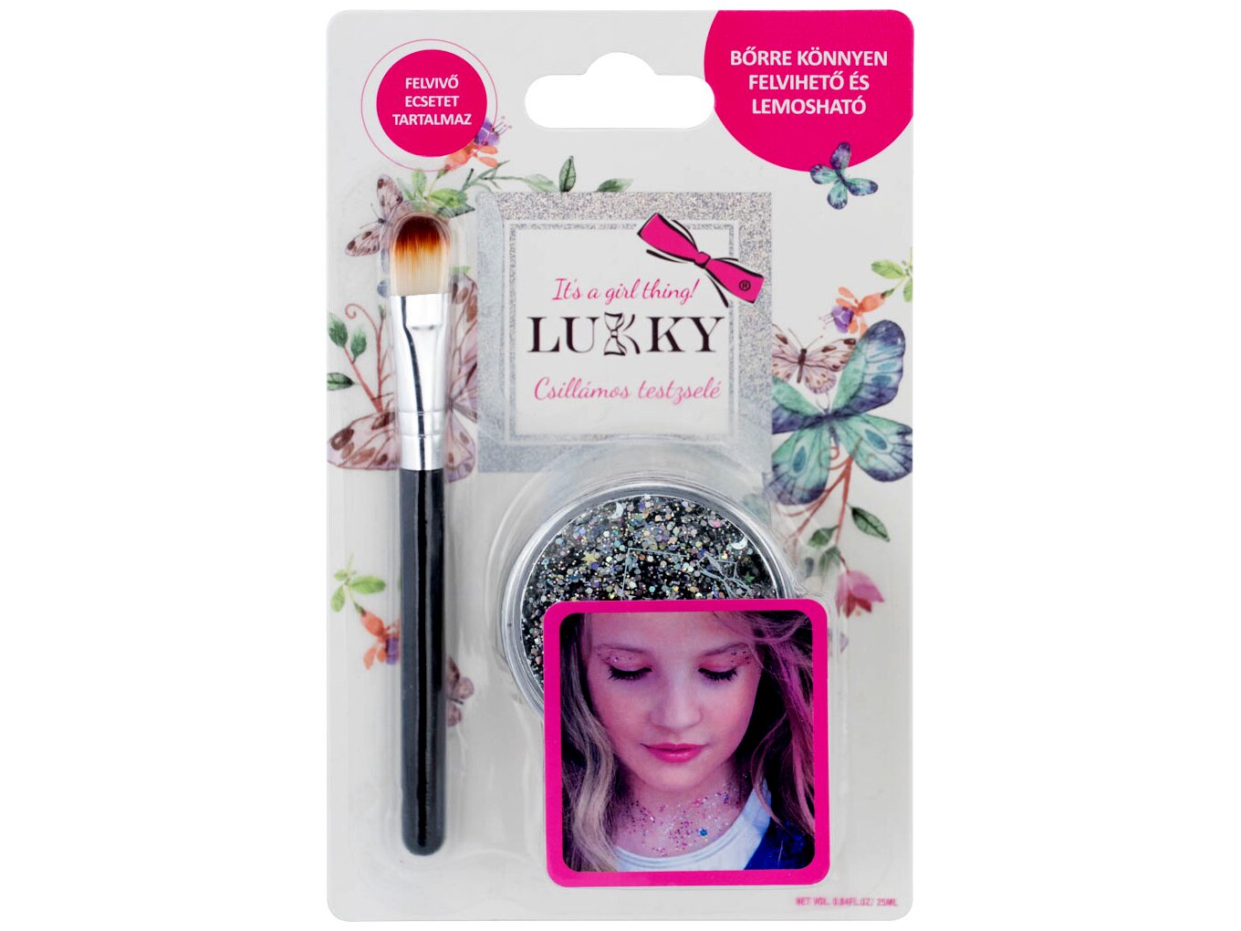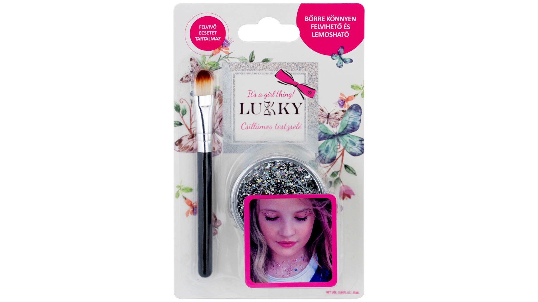 A Lukky csillámos testzselével a lányok egyszerűen és gyorsan varázsolhatnak maguknak csillámos bőrt. Használata könnyű, az ecset segítségével tudják a zselét felvinni a felületekre. Könnyedén lemosható.