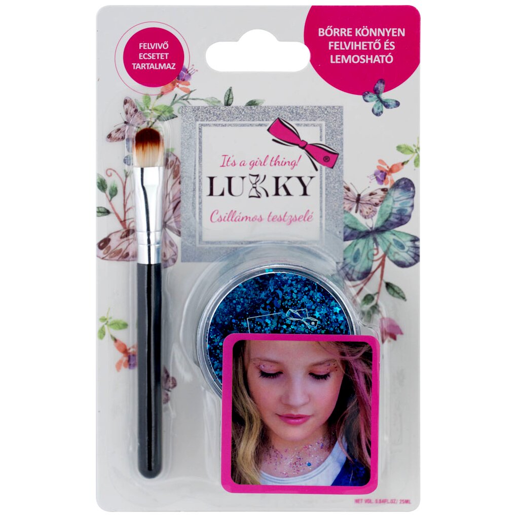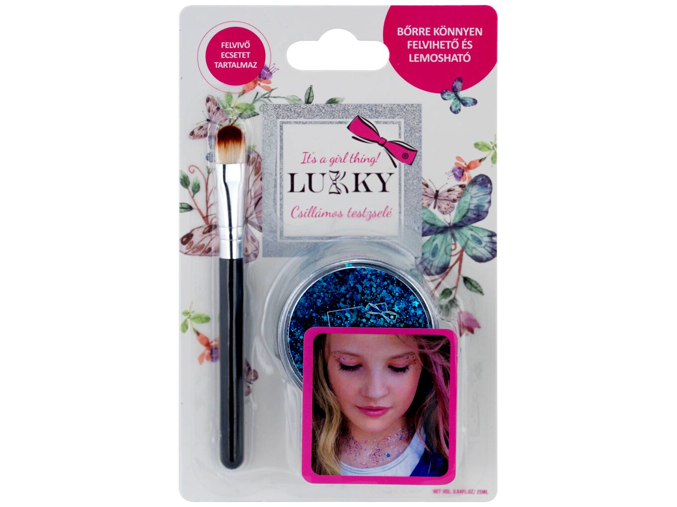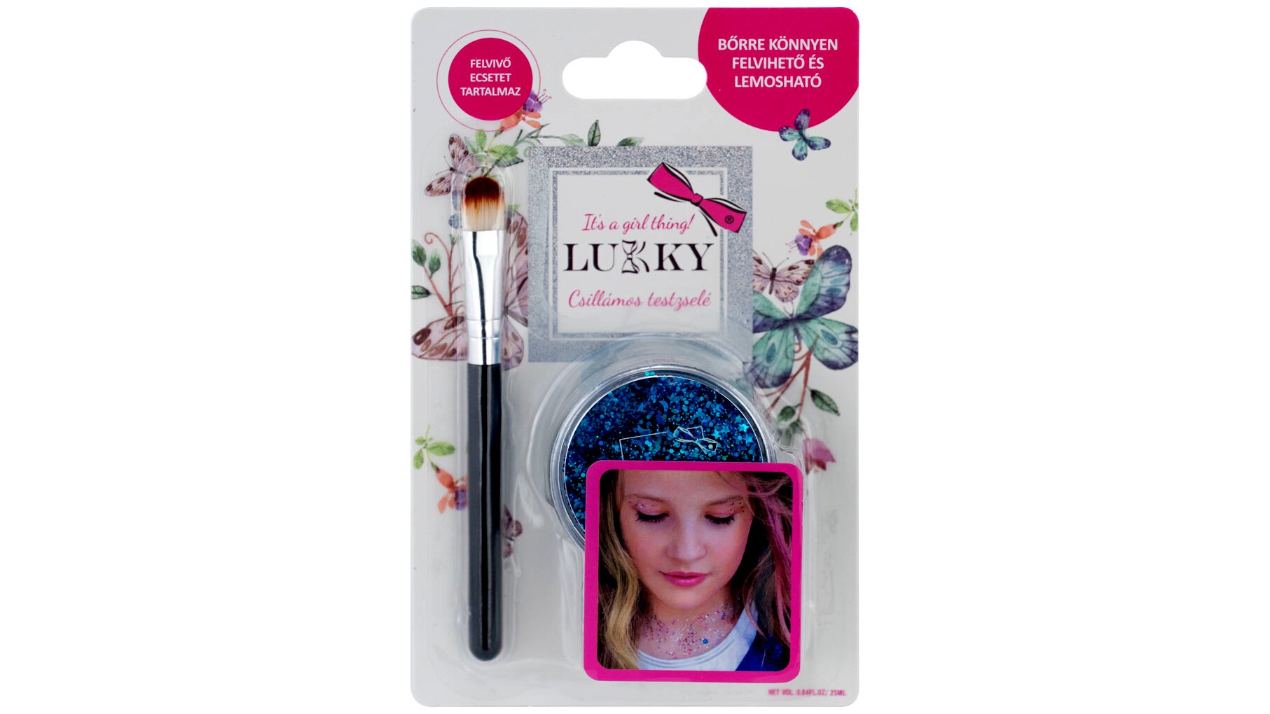A Lukky csillámos testzselével a lányok egyszerűen és gyorsan varázsolhatnak maguknak csillámos bőrt. Használata könnyű, az ecset segítségével tudják a zselét felvinni a felületekre. Könnyedén lemosható.