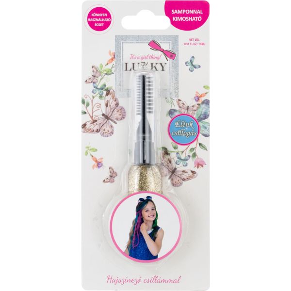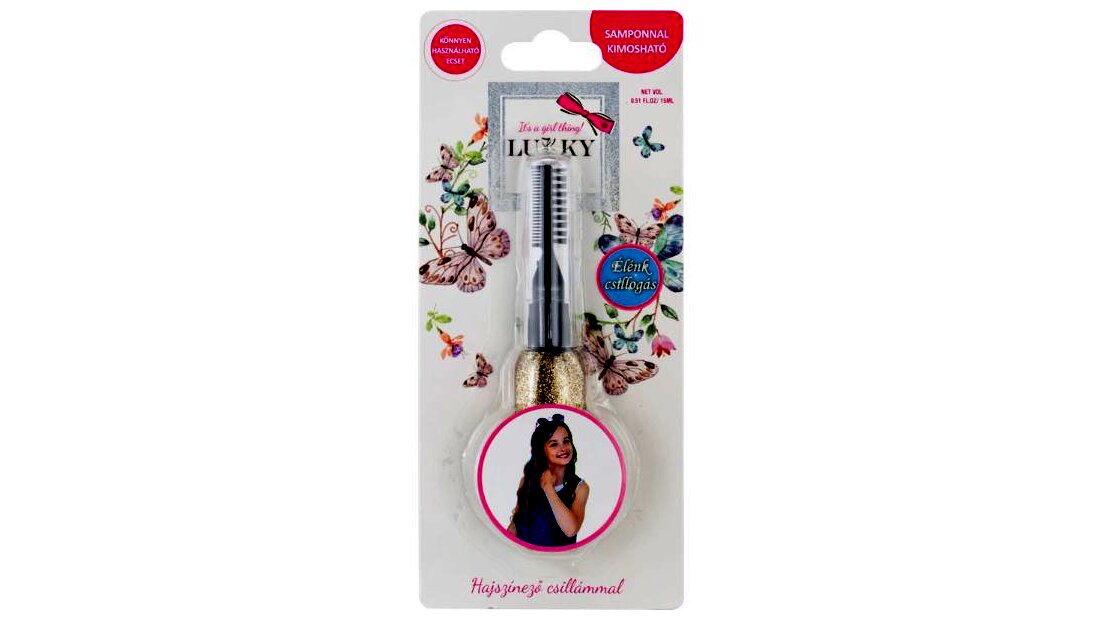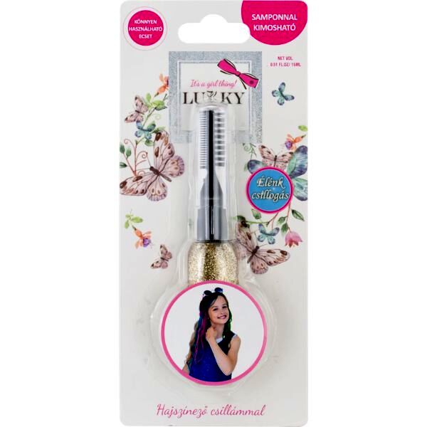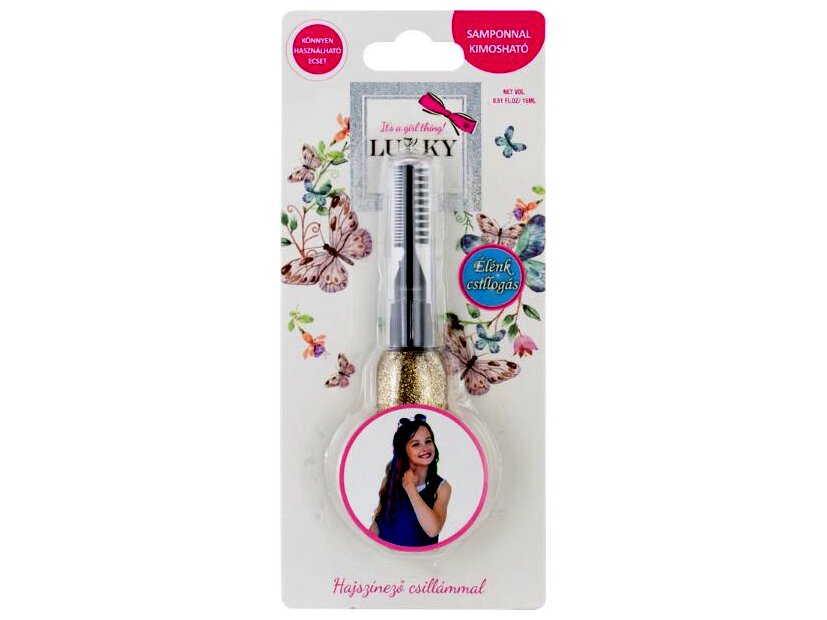 Tündöklő csillogás a hajon! A Lukky hajszínező csillámot biztonsággal próbálhatják ki a lányok, hiszen összetétele gyermekbarát és samponnal könnyedén kimosható a hajból. Használata is egyszerű: egy spirál segítségével fésülhető a hajszálakra. Legyen szó születésnapról, farsangról vagy bármilyen ünnepről a Lukky csillámmal garantált lesz a siker!