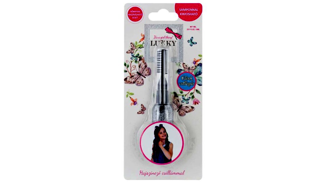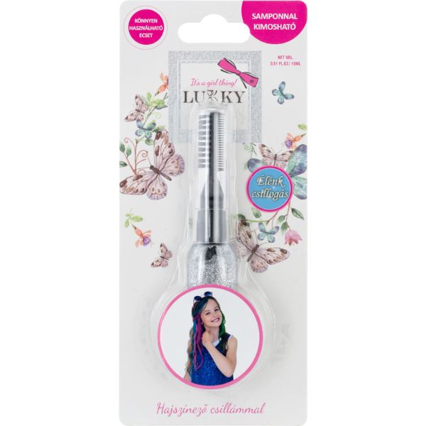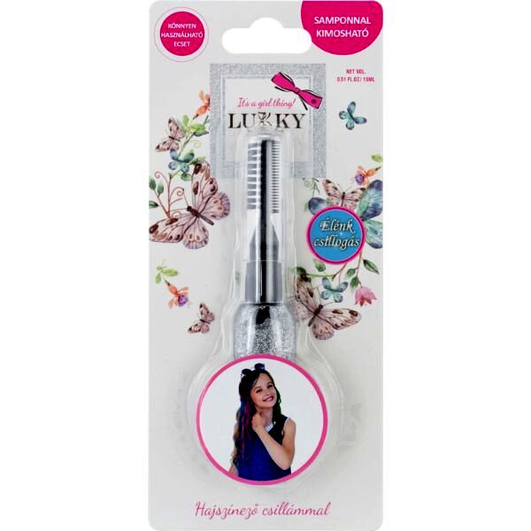 Tündöklő csillogás a hajon! A Lukky hajszínező csillámot biztonsággal próbálhatják ki a lányok, hiszen összetétele gyermekbarát és samponnal könnyedén kimosható a hajból. Használata is egyszerű: egy spirál segítségével fésülhető a hajszálakra. Legyen szó születésnapról, farsangról vagy bármilyen ünnepről a Lukky csillámmal garantált lesz a siker!