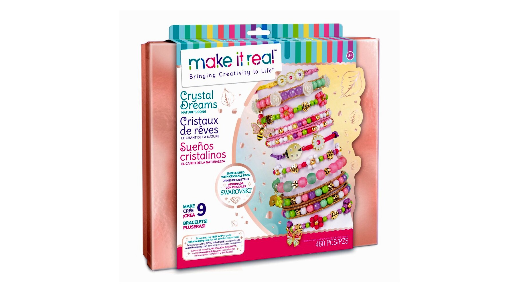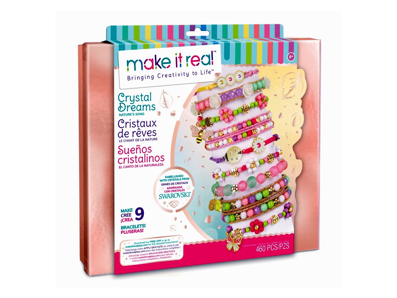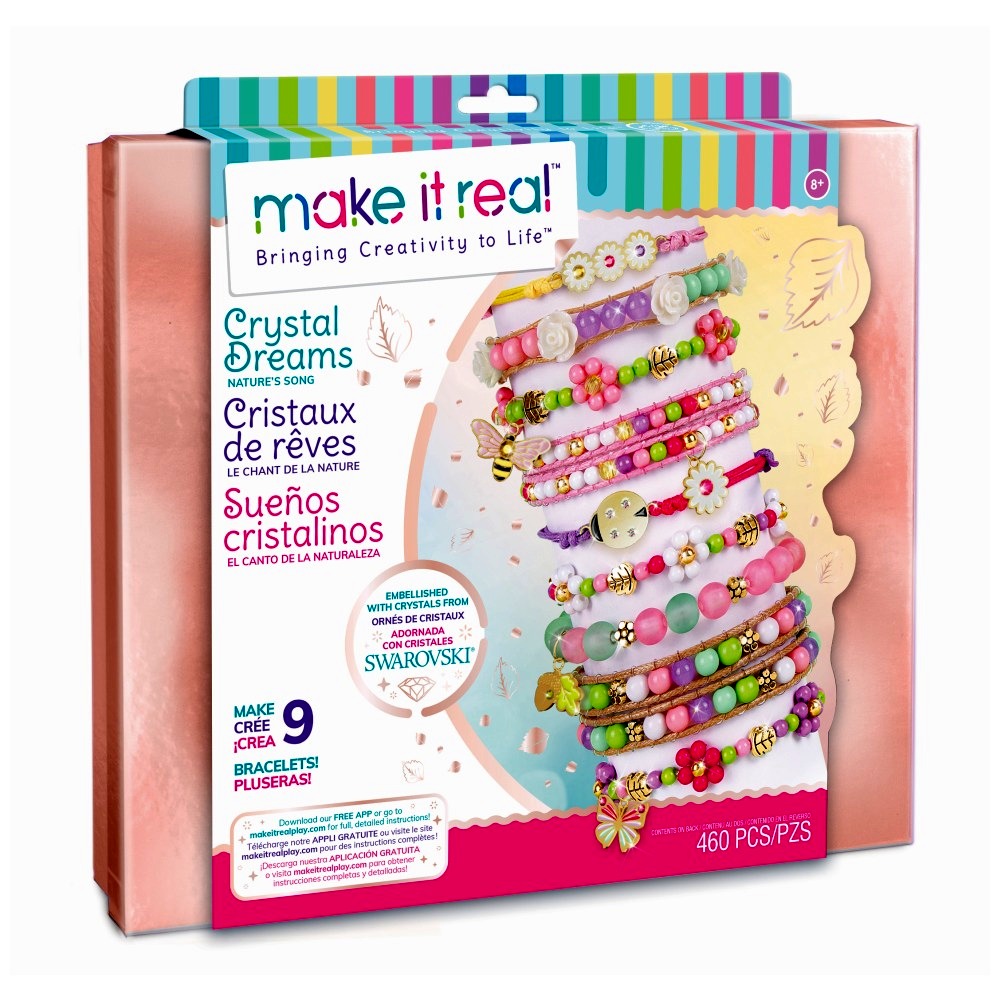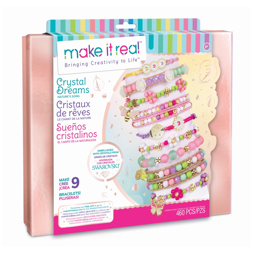 A Make it Real Crystal Dream - Kristály álom ékszerkészítő készlettel a lányok gyönyörű karkötőket készíthetnek saját maguknak vagy barátnőiknek. Ráadásul a csomagban Swarovski® kristály is rejlik, így a csajok még csillogóbb kiegészítőkkel dobhatják fel ékszerkészletüket.A szett 447 db tavasz ihlette gyöngyöt tartalmaz, amelyek között a hagyományos gyöngyformák mellett egyedi gyöngyök is találhatók, így például levélke, pillangó, méhecske és katica formájú gyöngyökkel és medálokkal is díszíthetők az elkészülő ékszerek. Emellett élénk színű, 4,5 méter hosszú fonalakat (barna, rózsaszín, magenta, lila, sárga) és egy áttetsző, 6 méter hosszú fonalat is tartalmaz a csomag, amelyből akár 9 karkötő is készíthető. Az elkészítés során az elemek szortírozását egy több rekeszre osztott doboz segíti.