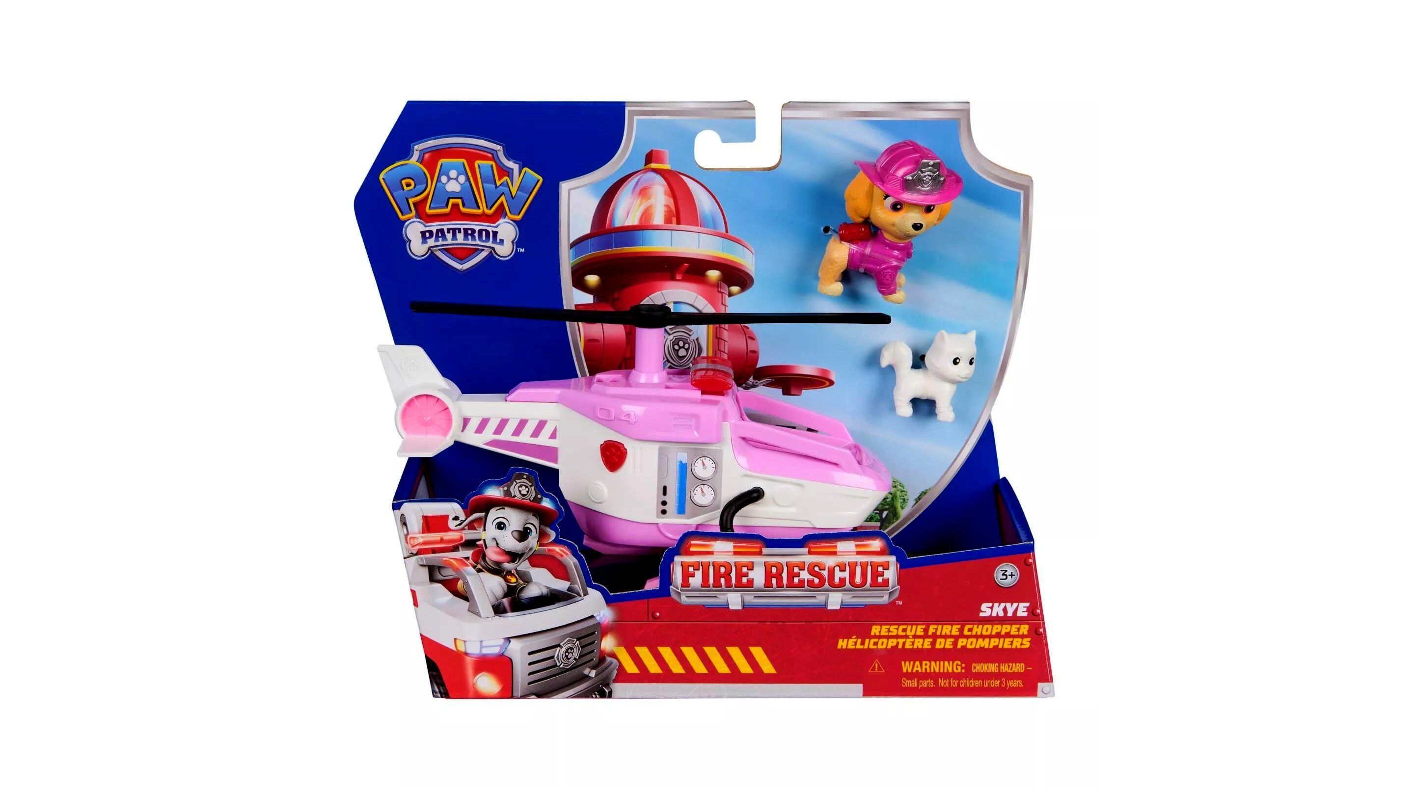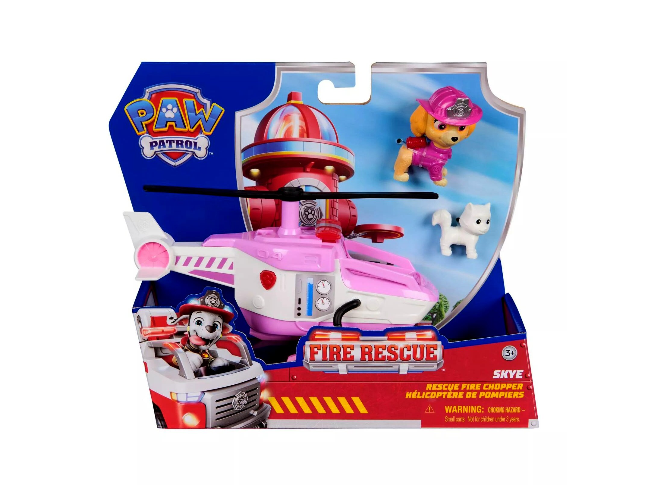 A Skye Rescue Fire Chopper több mint 17,7 cm hosszú és 10,1 cm magas. A helikopter beépített mentőkosárral és forgatható légcsavarral rendelkezik, így garantált az izgalom minden mentési küldetés során. Skye figura tűzoltó felszerelésében, 5 cm-es magasságával, készen áll a kalandra. A termék különlegessége a gombnyomásra aktiválható mentőkosár, amely igazi akciót kölcsönöz a játéknak.