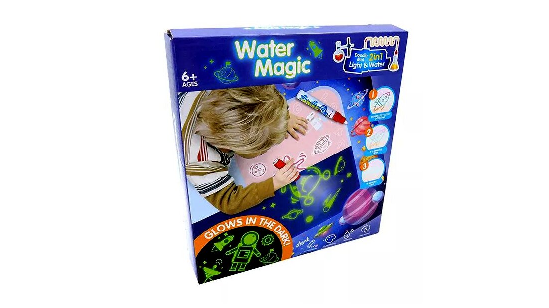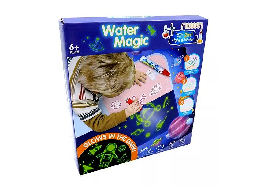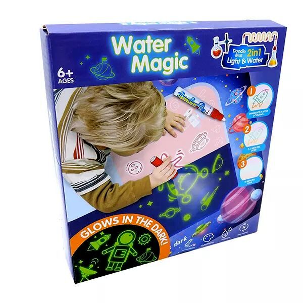 A dobozban található speciális tollat csak fel kell tölteni vízzel, és a kicsik már kezdhetik is az alkotást a szőnyegen. Víz hatására az előre megrajzolt minták előbújnak, és mielőtt megszáradna a szőnyeg, és eltűnne a művészi alkotás, sötétben, a megvilágított részek világítanak. A kis művészek egészen biztosan órákon keresztül alkotnak majd a szőnyeg segítségével.A toll vízzel működik, nem maszatol és nem ken össze semmit.