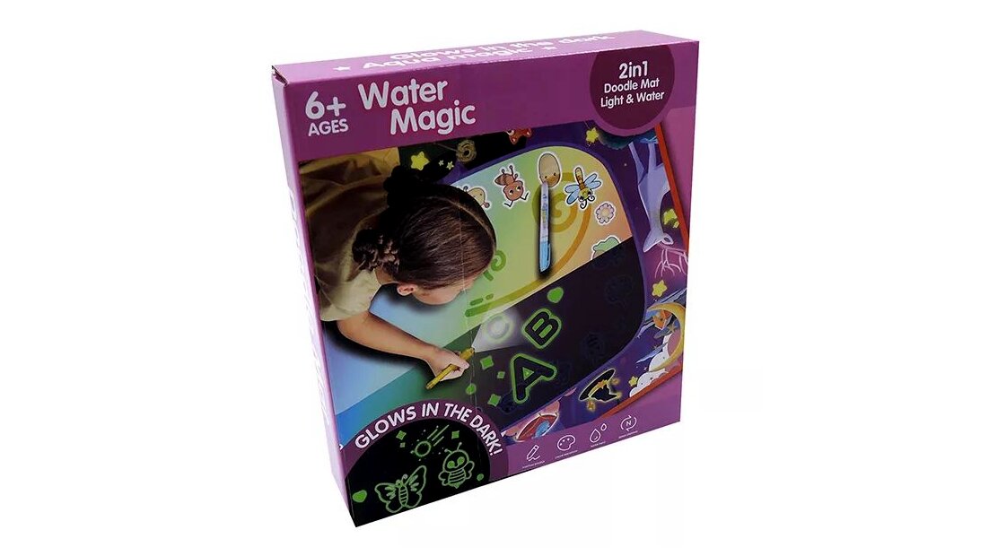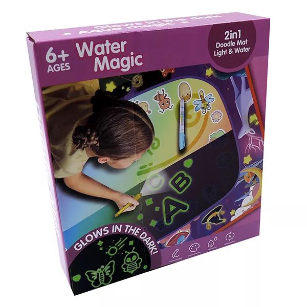 A dobozban található speciális tollat csak fel kell tölteni vízzel, és a kicsik már kezdhetik is az alkotást a szőnyegen. Víz hatására az előre megrajzolt minták előbújnak, és mielőtt megszáradna a szőnyeg, és eltűnne a művészi alkotás, sötétben, a megvilágított részek világítanak. A kis művészek egészen biztosan órákon keresztül alkotnak majd a szőnyeg segítségével.A toll vízzel működik, nem maszatol és nem ken össze semmit.
