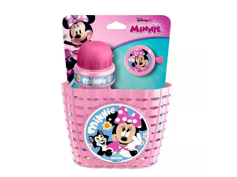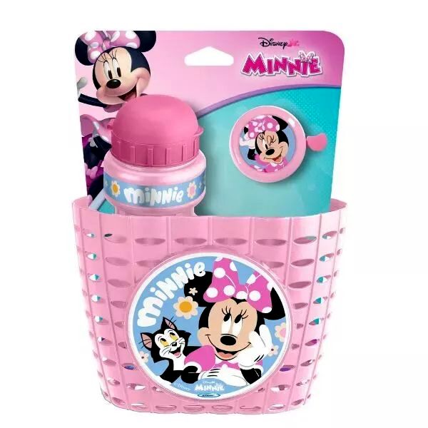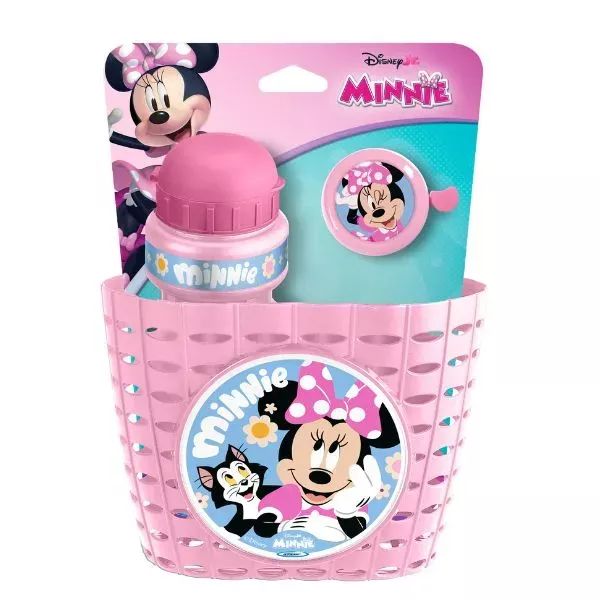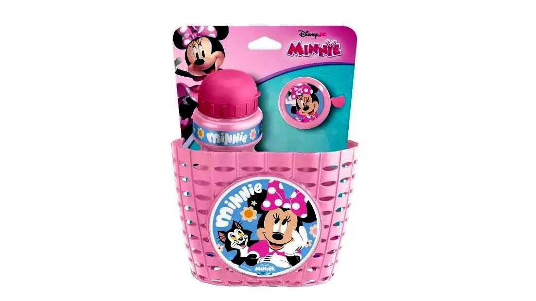 Ez a Minnie egér mintájú kiegészítő szett jó választás gyerekeknek, akik szeretnének kosarat, kulacsot és csengőt a járművükre, egyszerűen felszerelhető, egységes megjelenésű csomagban.