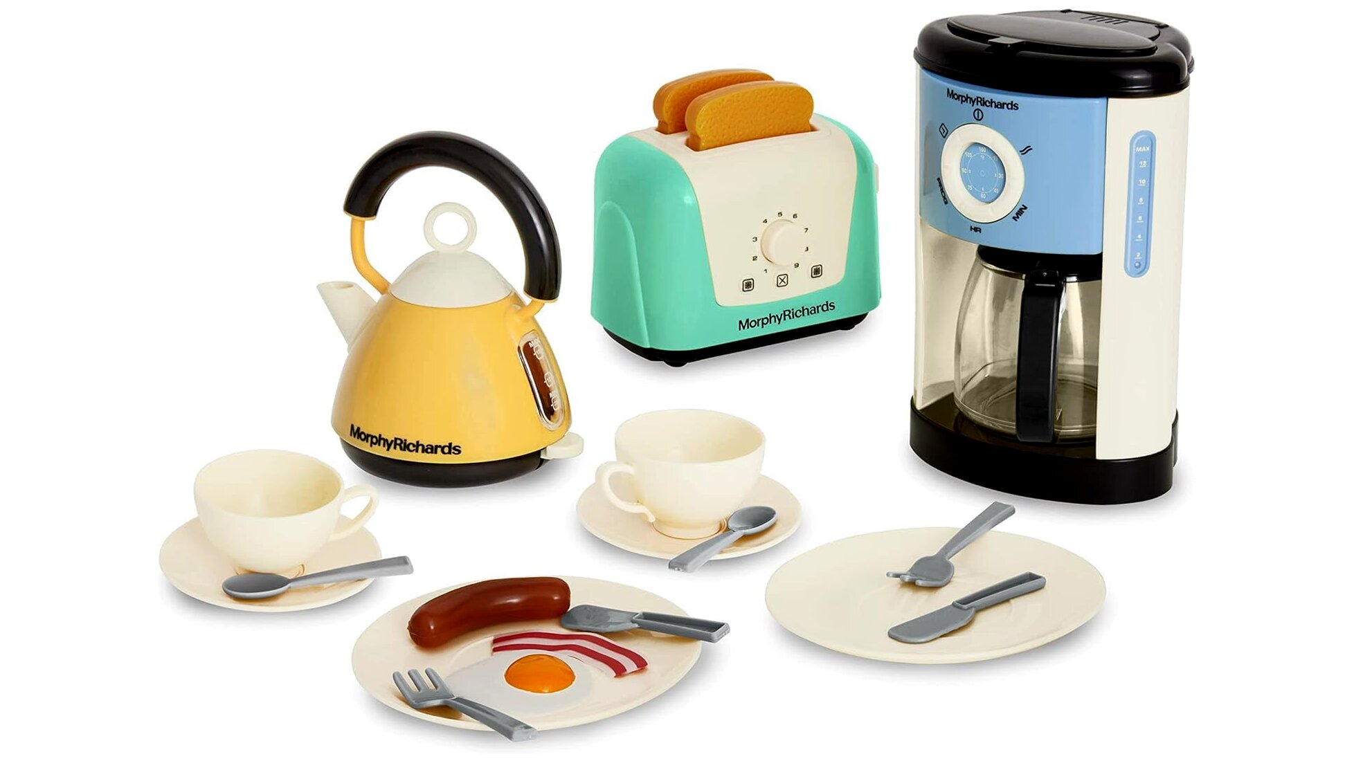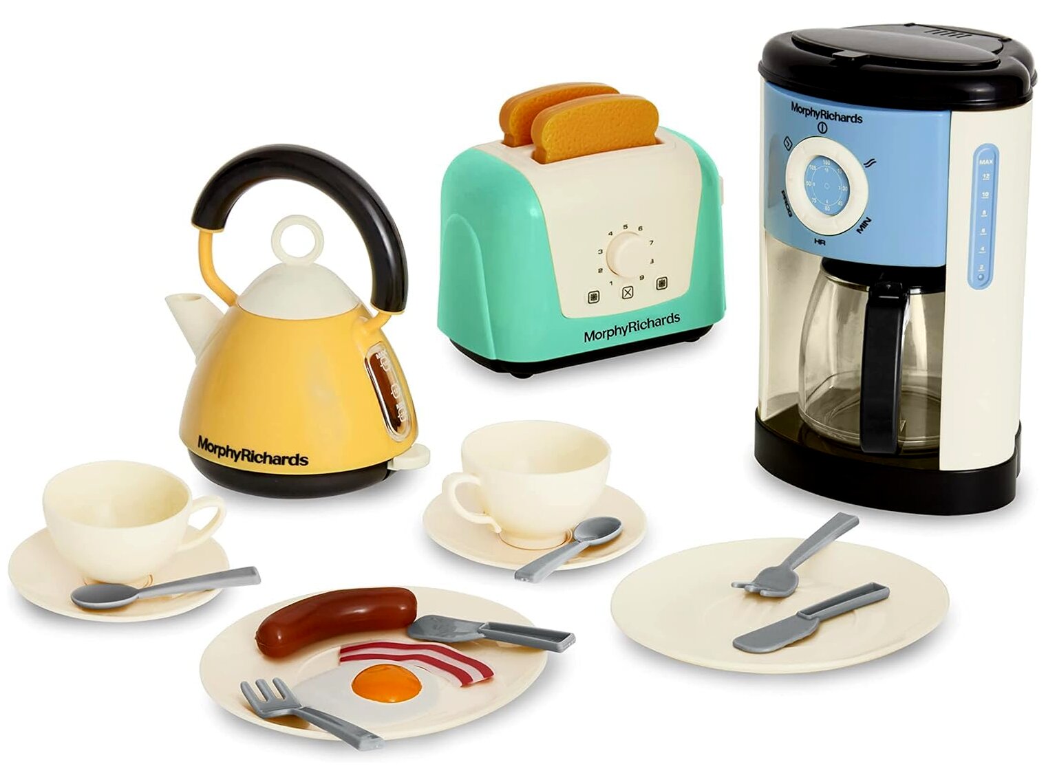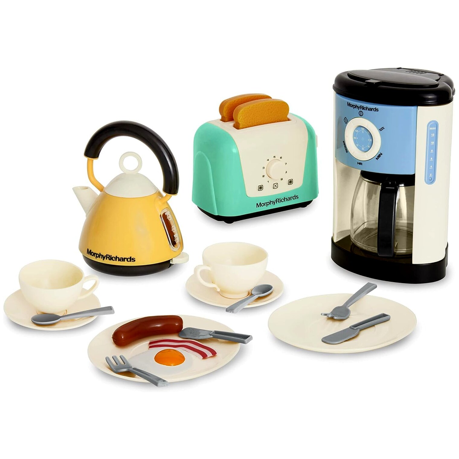 A Morphy Richards konyhai szett elemei a legapróbb részletekig hű mása az igazi konyhai eszközöknek, így a kis szakácsjelöltek valóban úgy érezhetik, hogy egy valódi konyhában főzőcskéznek. Az edények és az eszközök a modern konyhát varázsolják a gyerekszobába.A kávéfőzőbe vizet lehet tölteni, a vízforraló oldalán lévő szintmutató működik, a kenyérpirítóhoz pedig két szelet műanyag kenyér is tartozik. A szett tartalmaz még csészéket, evőeszközöket, kolbászt, bacont és tojást is. Mindent, ami csak kellhet egy kiadós reggelihez. A játék fejleszti a kéz-szem koordinációt, a finommotorikát és segít az ok-okozati összefüggések megértésében.