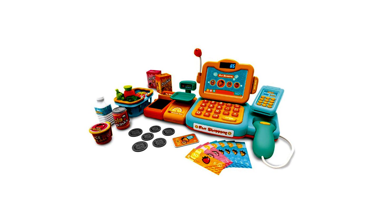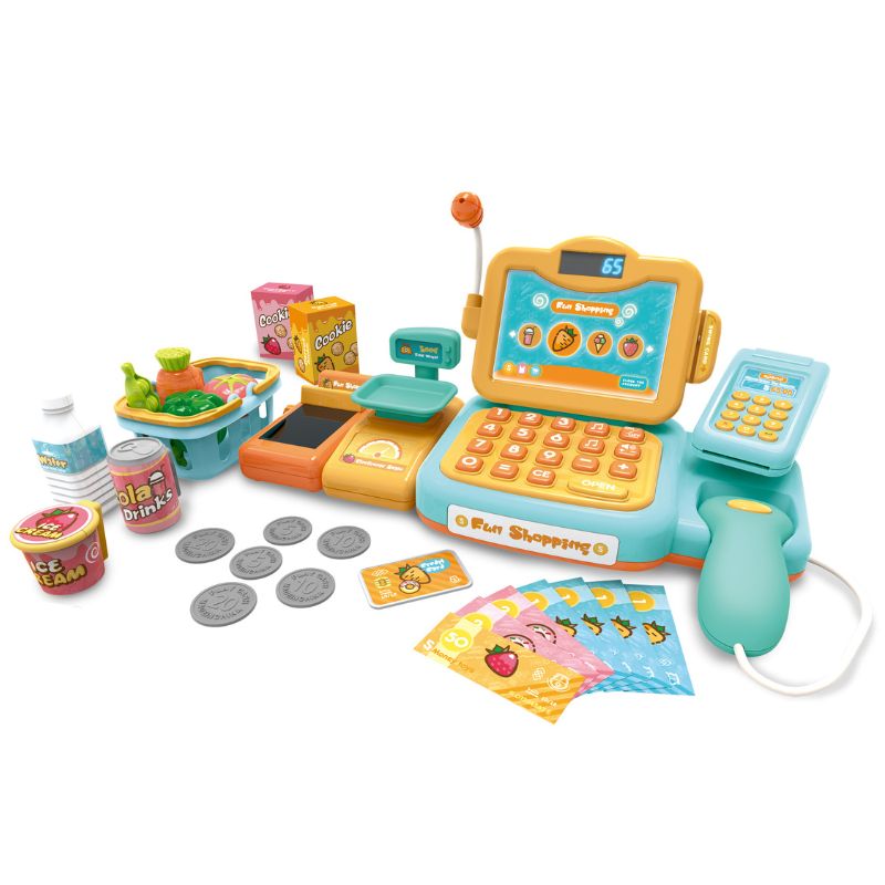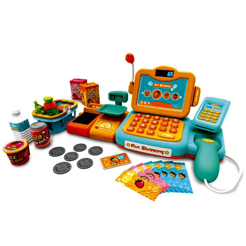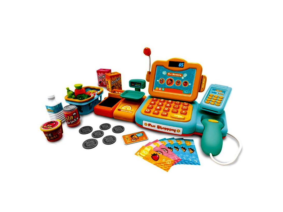 Ez a multifunkciós pénztárgép szett lehetőséget teremt a gyerekek számára, hogy megismerkedjenek a mindennapi élet egy fontos tevékenységével: a bevásárlással. A 24 elemet tartalmazó játékszett segítségével a kicsik megtanulhatják a számokat, gyakorolhatják az alapműveleteket, valamint felfedezhetik a készpénzzel és bankkártyával történő fizetés mikéntjét.A pénztárgép számológéppel, mikrofonnal, valamint szkennerrel felszerelt, fiókja nyitható. A kosárban kényelmesen elférnek a megvásárolni kívánt termékek (pl. sütisdobozok, desszertek, zöldségek). A kis eladóknak nincs más dolguk, mint beszkennelni az áru vonalkódját vagy épp lemérni a súlyát, majd - attól függően, hogy készpénzzel vagy kártyával történik a fizetés - bedugni a kártyát a bankkártya-leolvasóba, vagy kinyitni a kis fiókot. A pénztárgép gombnyomásra hangot ad és különböző dalokat játszik le, valamint a gyerekek a mikrofonba is beszélgetnek, hogy még izgalmasabb legyen a játékélmény.