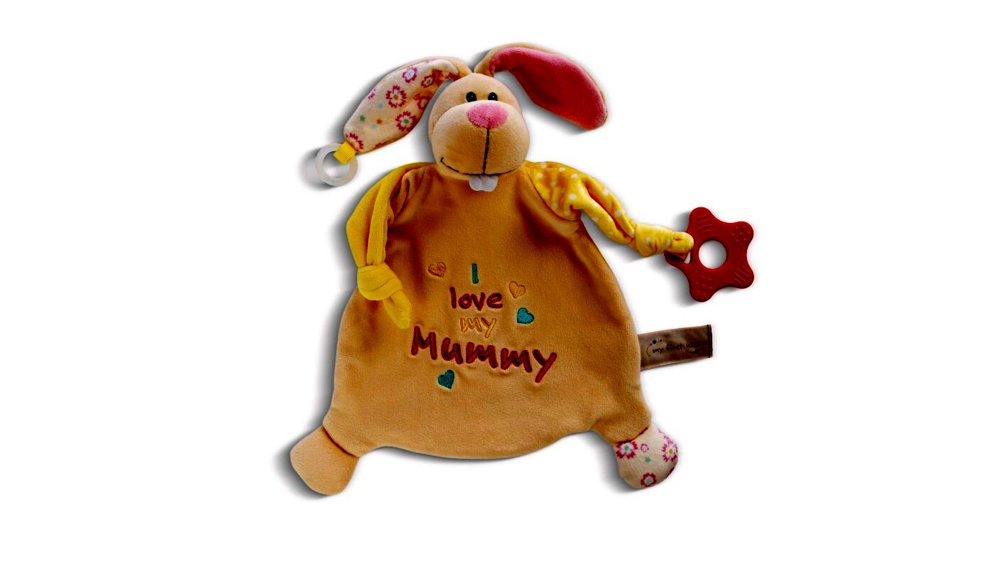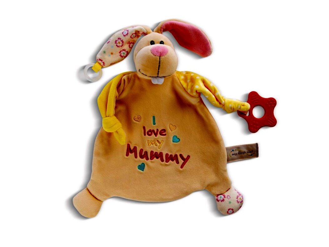 A hosszú lógó fülű és aranyos nyuszifogacskákkal díszített nyuszis szundikendő nélkülözhetetlen társ a babák és kisgyermekek számára. A szuper puha anyag és a MyFirstNICI szundikendő megkötött karjai ösztönzik a fogást, tapintást és ölelést.A rögzítőgyűrűnek köszönhetően a szeretettel megtervezett szundikendő az „I love my Mummy” felirattal könnyedén rögzíthető az akár füllel, akár anélkül használt cumihoz. Az integrált, puha, texturált rágóka segíti a babát a fogzás idején. Csodás ajándékötlet születésre!