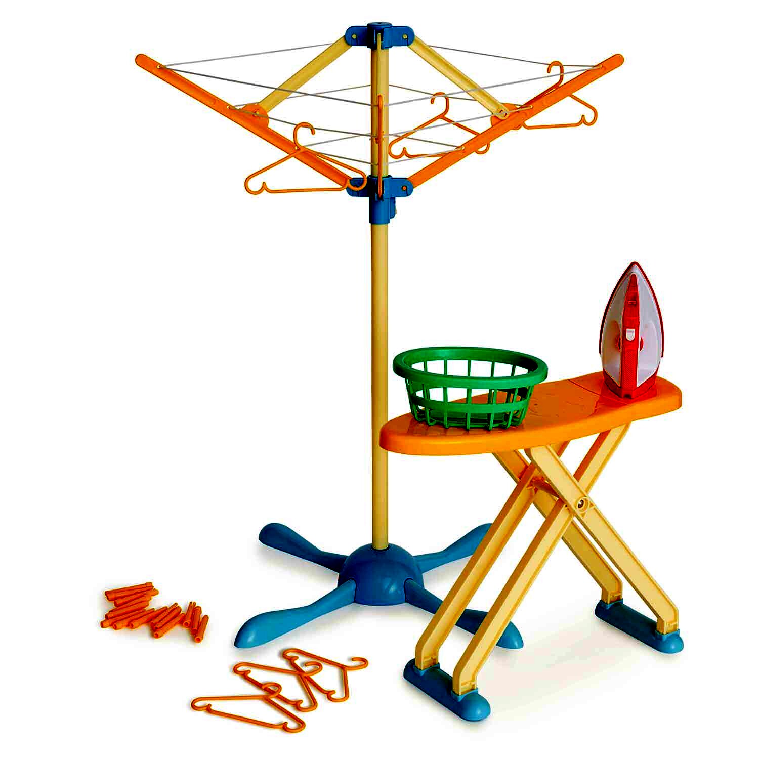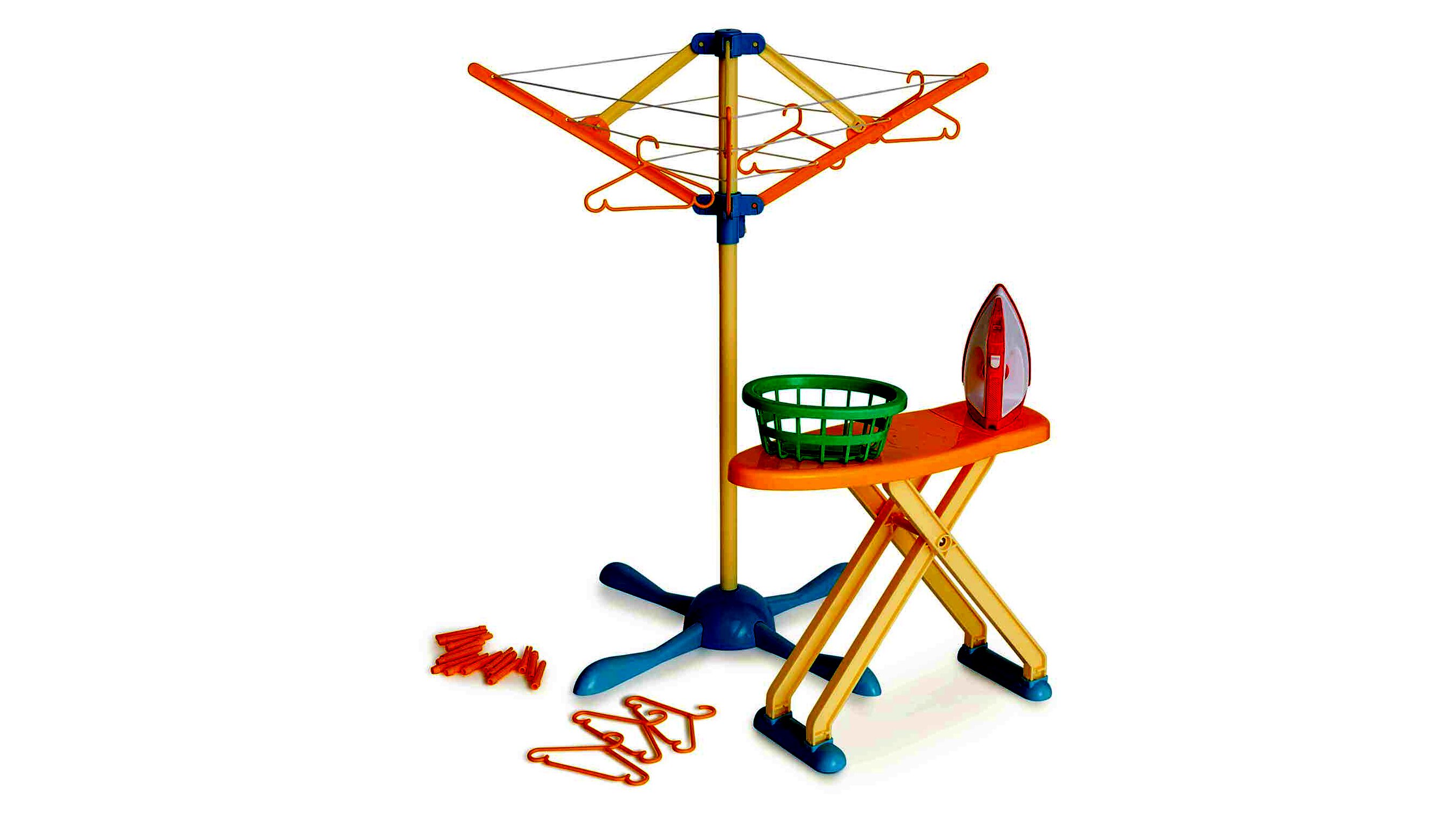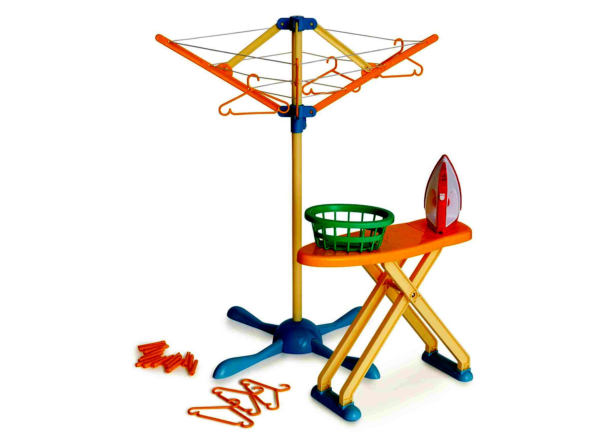 Tartalom: 1 db összecsukható vasalódeszka, 1 db ruhaszárító állvány, 1 db játékvasaló, 1 db szennyeskosár, ruhacsipeszek, fogasok.