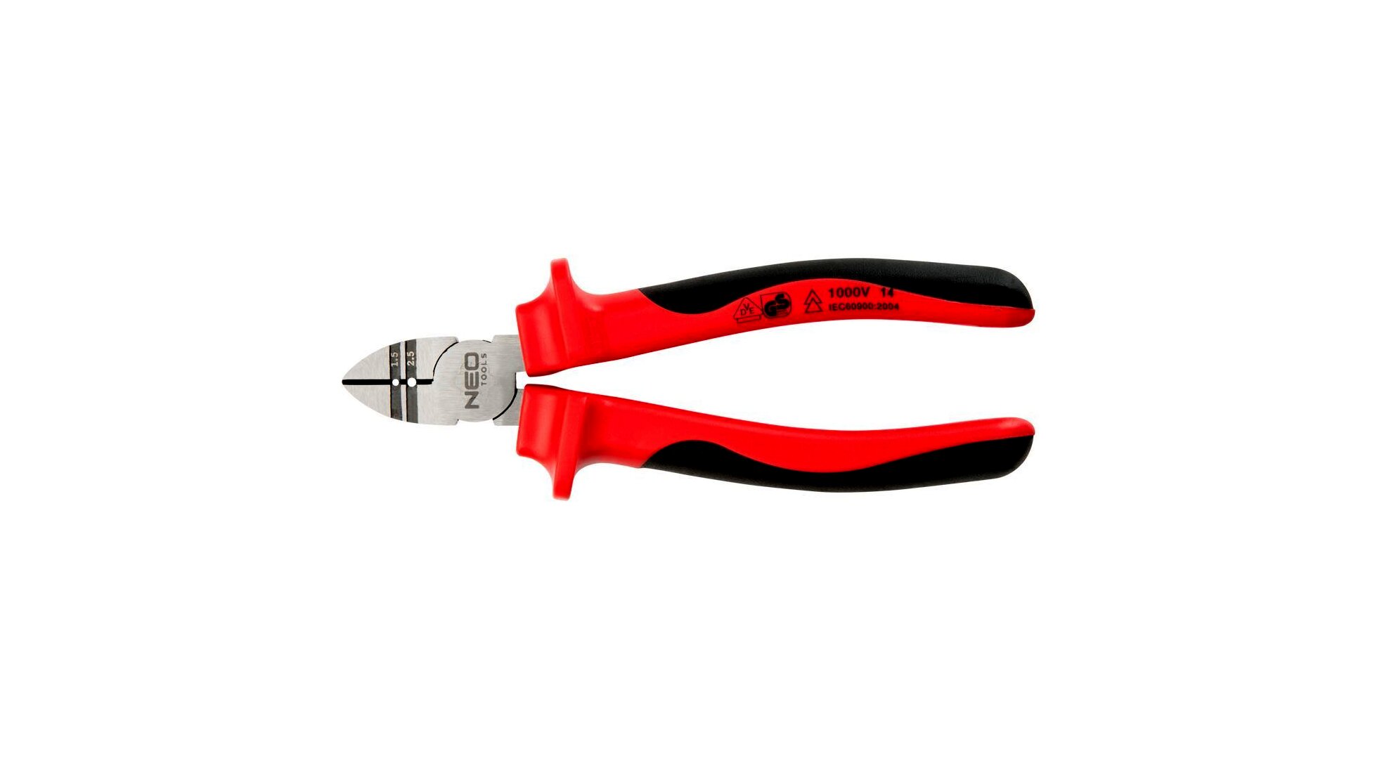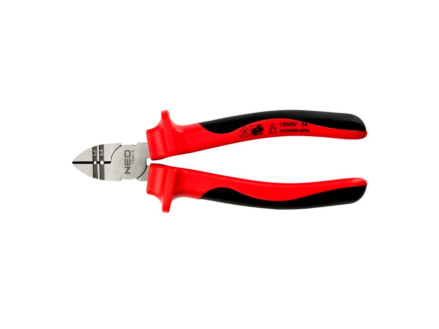 NEO oldalcsípőfogó 1000 V, 160 mm hosszú. Max. 1000 V feszültség alatti használatra minősített. Tartós króm-vanádium acélból készül. Kábelcsupaszoló funkcióval 1,5 mm² és 2 mm² átmérőjű vezetékekhez. Az ergonómikus bimateriál markolat növeli a használat komfortját. A GS tanúsítvány bizonyítja a szerszám kiváló minőségét és tartósságát. A NEO márka a professzionális igényeket is kielégíti.