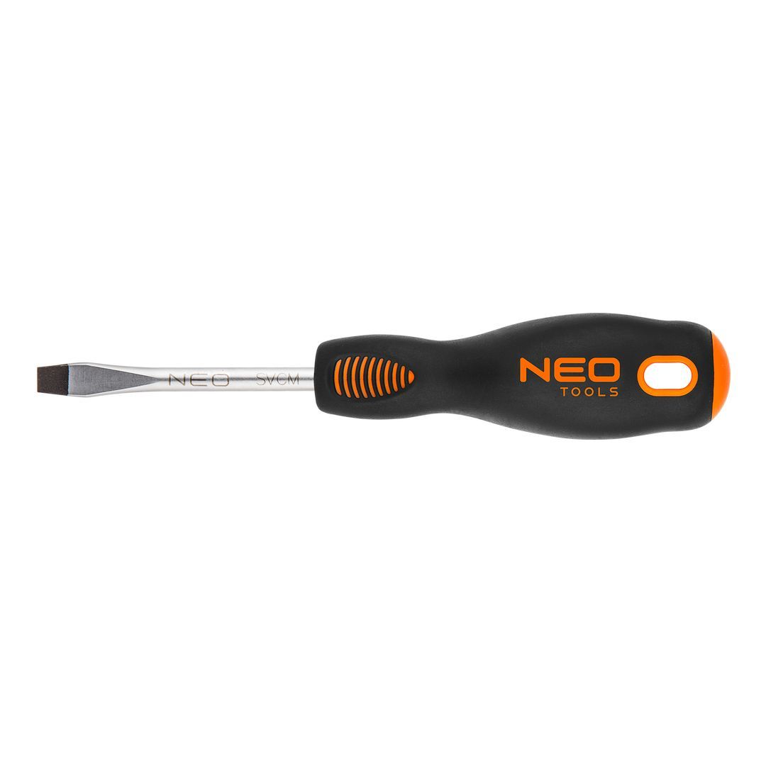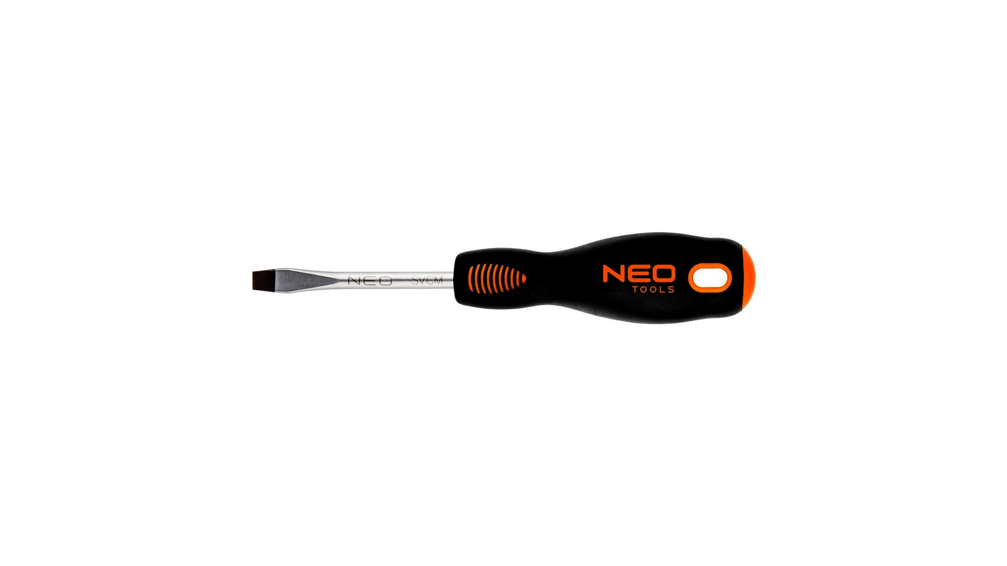 NEO lapos csavarhúzó. A csavarhúzó szára kivételesen ellenálló S2. A csavarhúzó hegy hőkezelésnek lett alávetve, így megfelelő, 56 HRC keménységet és hajlítószilárdságot ért el. A csavarhúzó hegye mágneses. A markolat három élű hasáb alakja a kialakított hüvelyktámasszal csökkenti a kéz megterhelését munka közben, és megkönnyíti a megfelelő forgatónyomaték elérését. A bimateriál markolat nem csúszik ki a kézből, ellenálló vegyszerek, kenőolajok és zsírok hatásának. A szerszám minőségét bizonyítja a TÜV tanúsítvány és a gyártó által nyújtott 25 éves jótállás. A NEO márka a professzionális igényeket is kielégíti.