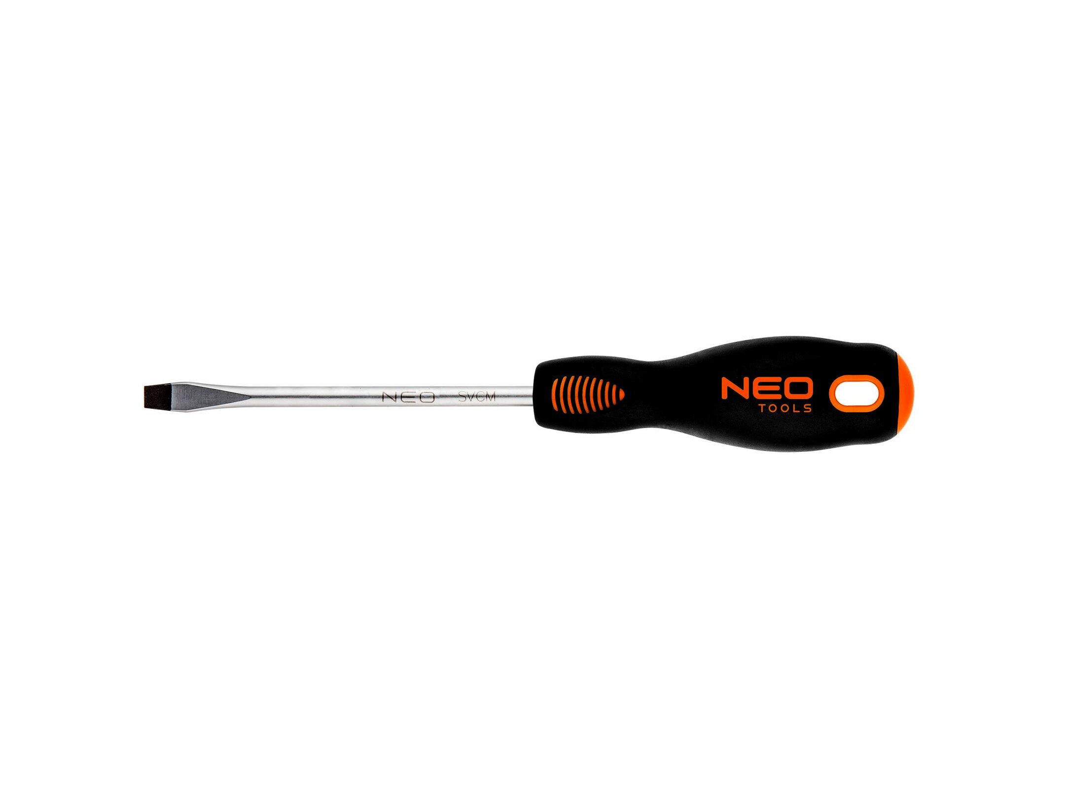 NEO lapos csavarhúzó. A csavarhúzó szára kivételesen ellenálló S2. A csavarhúzó hegy hőkezelésnek lett alávetve, így megfelelő, 56 HRC keménységet és hajlítószilárdságot ért el. A csavarhúzó hegye mágneses. A markolat három élű hasáb alakja a kialakított hüvelyktámasszal csökkenti a kéz megterhelését munka közben, és megkönnyíti a megfelelő forgatónyomaték elérését. A bimateriál markolat nem csúszik ki a kézből, ellenálló vegyszerek, kenőolajok és zsírok hatásának. A szerszám minőségét bizonyítja a TÜV tanúsítvány és a gyártó által nyújtott 25 éves jótállás. A NEO márka a professzionális igényeket is kielégíti.