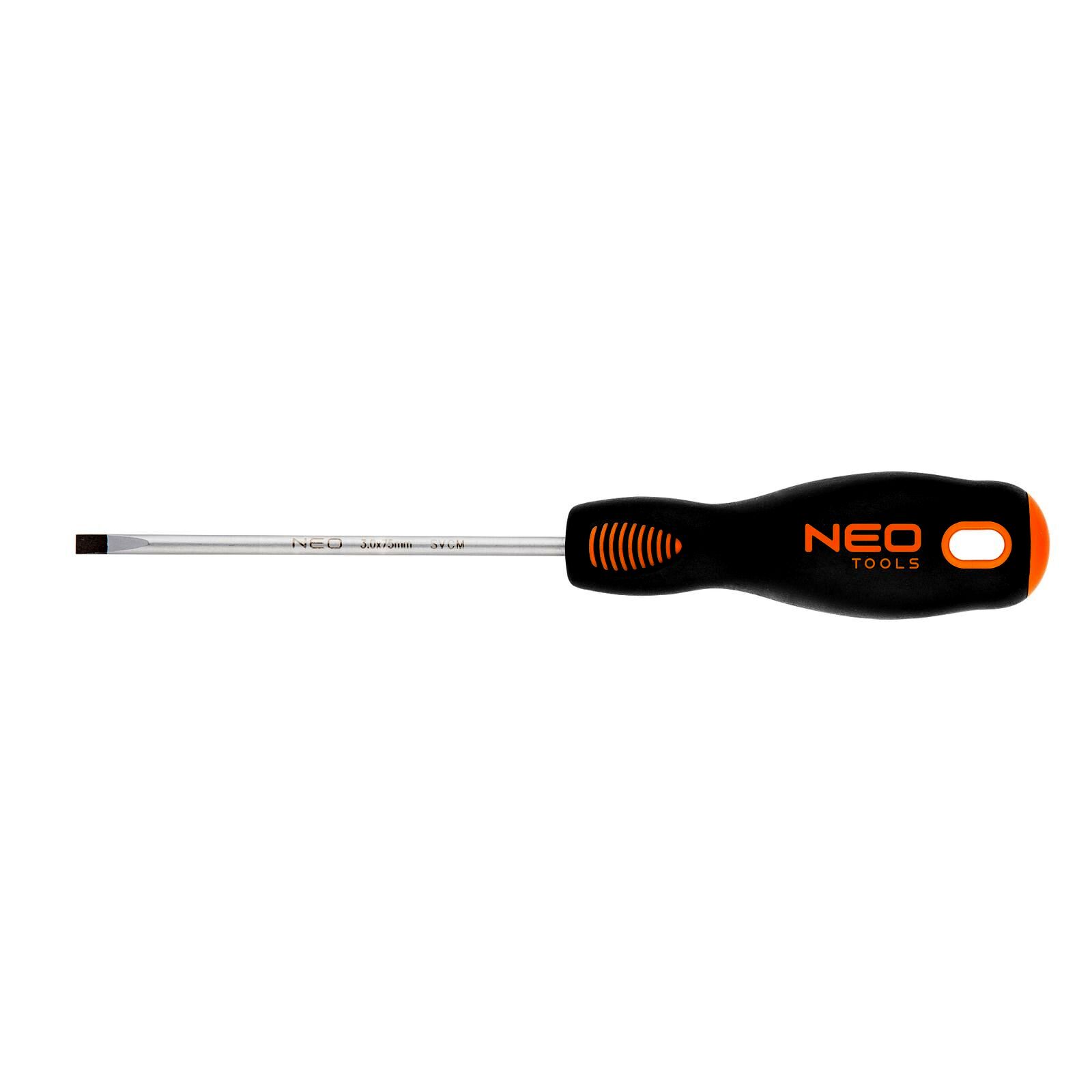 NEO lapos csavarhúzó. A csavarhúzó szára kivételesen ellenálló S2. A csavarhúzó hegy hőkezelésnek lett alávetve, így megfelelő, 56 HRC keménységet és hajlítószilárdságot ért el. A csavarhúzó hegye mágneses. A markolat három élű hasáb alakja a kialakított hüvelyktámasszal csökkenti a kéz megterhelését munka közben, és megkönnyíti a megfelelő forgatónyomaték elérését. A bimateriál markolat nem csúszik ki a kézből, ellenálló vegyszerek, kenőolajok és zsírok hatásának. A szerszám minőségét bizonyítja a TÜV tanúsítvány és a gyártó által nyújtott 25 éves jótállás.