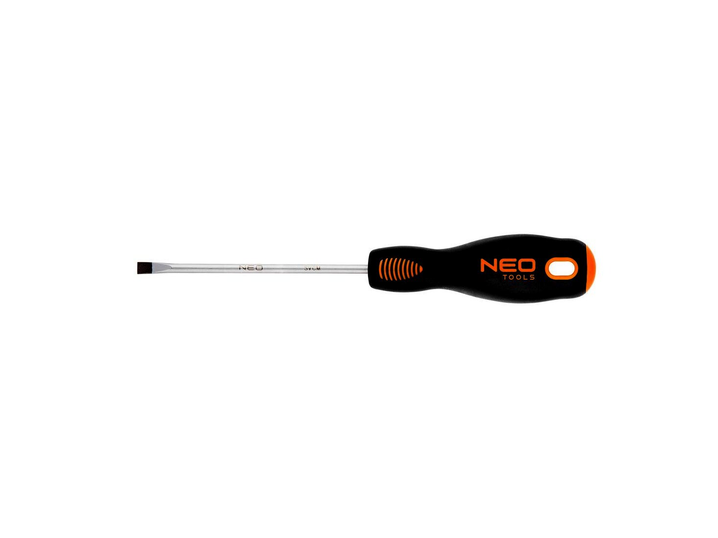 NEO lapos csavarhúzó. A csavarhúzó szára kivételesen ellenálló S2. A csavarhúzó hegy hőkezelésnek lett alávetve, így megfelelő, 56 HRC keménységet és hajlítószilárdságot ért el. A csavarhúzó hegye mágneses. A markolat három élű hasáb alakja a kialakított hüvelyktámasszal csökkenti a kéz megterhelését munka közben, és megkönnyíti a megfelelő forgatónyomaték elérését. A bimateriál markolat nem csúszik ki a kézből, ellenálló vegyszerek, kenőolajok és zsírok hatásának. A szerszám minőségét bizonyítja a TÜV tanúsítvány és a gyártó által nyújtott 25 éves jótállás.