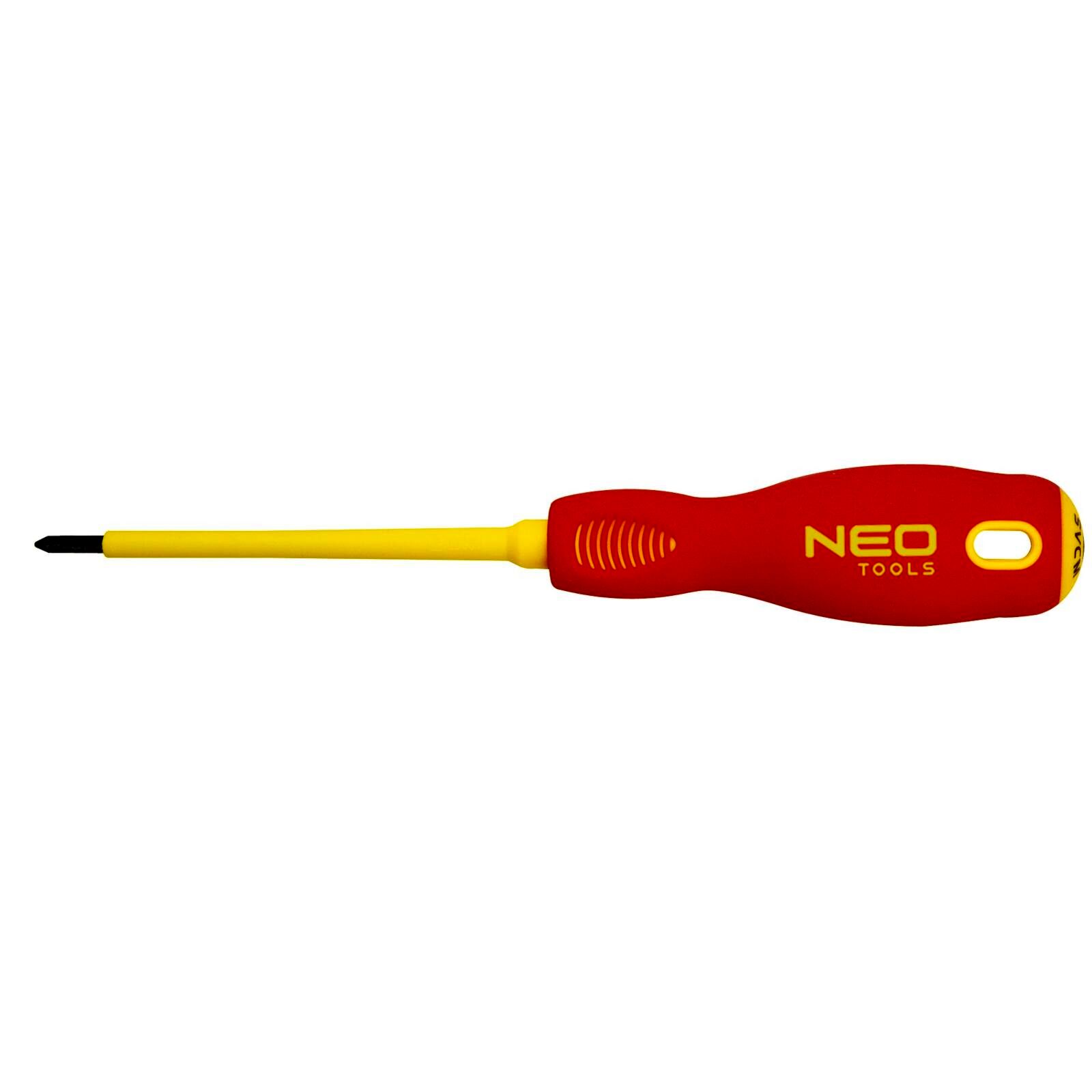 NEO 1000 V kereszt csavarhúzó. A szerszám max. 1000 V feszültség alatti használatra minősített. A csavarhúzó szára kivételesen ellenálló króm-vanádium acélból készül. A csavarhúzó hegy hőkezelésnek lett alávetve, így megfelelő, 56 HRC keménységet és hajlítószilárdságot ért el. A csavarhúzó hegye mágneses. A markolat három élű hasáb alakja a kialakított hüvelyktámasszal csökkenti a kéz megterhelését munka közben, és megkönnyíti a megfelelő forgatónyomaték elérését. A bimateriál markolat nem csúszik ki a kézből, ellenálló vegyszerek, kenőolajok és zsírok hatásának. A szerszám minőségét bizonyítja a TÜV tanúsítvány és a gyártó által nyújtott 25 éves jótállás. A NEO márka a professzionális igényeket is kielégíti.