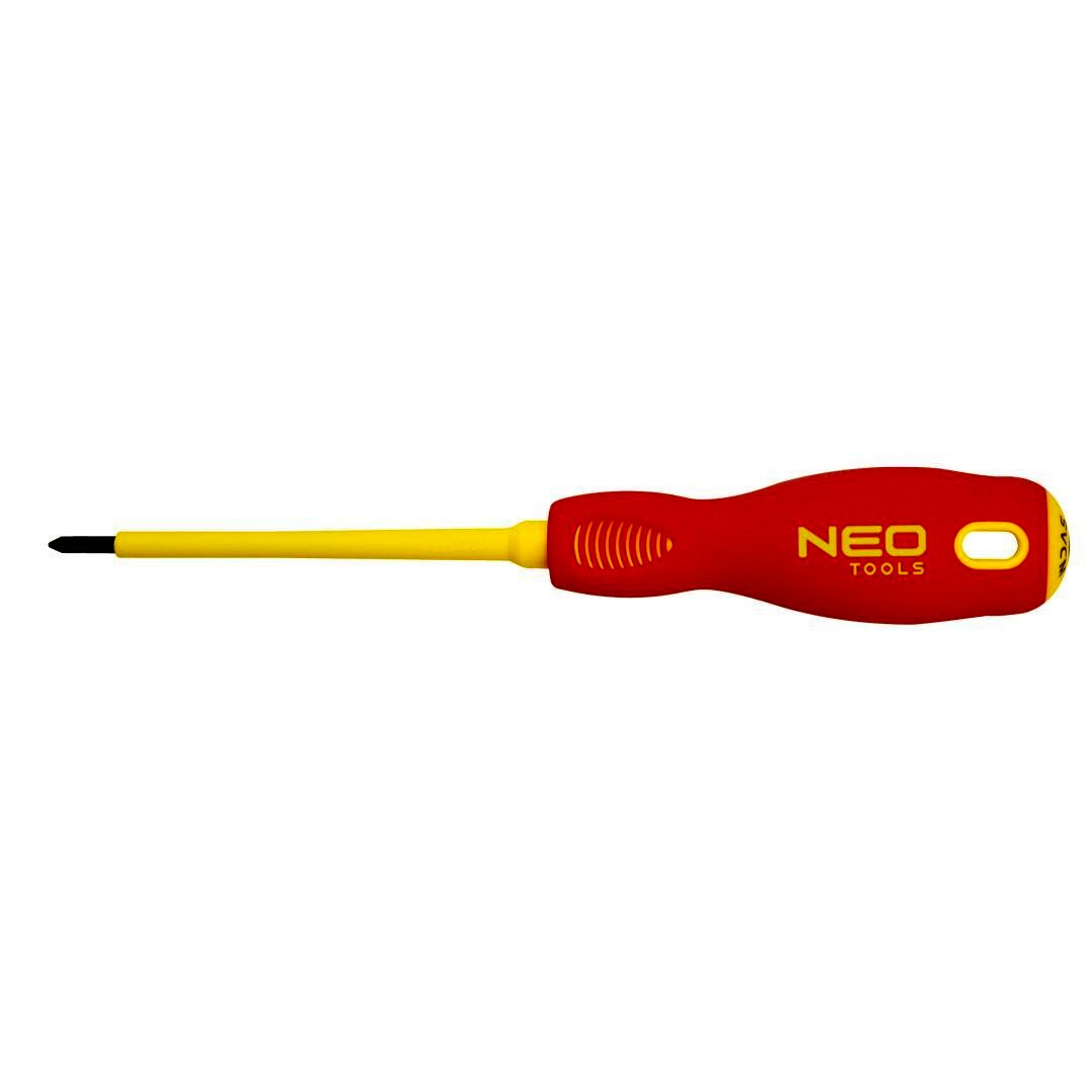 NEO 1000 V kereszt csavarhúzó. A szerszám max. 1000 V feszültség alatti használatra minősített. A csavarhúzó szára kivételesen ellenálló króm-vanádium acélból készül. A csavarhúzó hegy hőkezelésnek lett alávetve, így megfelelő, 56 HRC keménységet és hajlítószilárdságot ért el. A csavarhúzó hegye mágneses. A markolat három élű hasáb alakja a kialakított hüvelyktámasszal csökkenti a kéz megterhelését munka közben, és megkönnyíti a megfelelő forgatónyomaték elérését. A bimateriál markolat nem csúszik ki a kézből, ellenálló vegyszerek, kenőolajok és zsírok hatásának. A szerszám minőségét bizonyítja a TÜV tanúsítvány és a gyártó által nyújtott 25 éves jótállás. A NEO márka a professzionális igényeket is kielégíti.