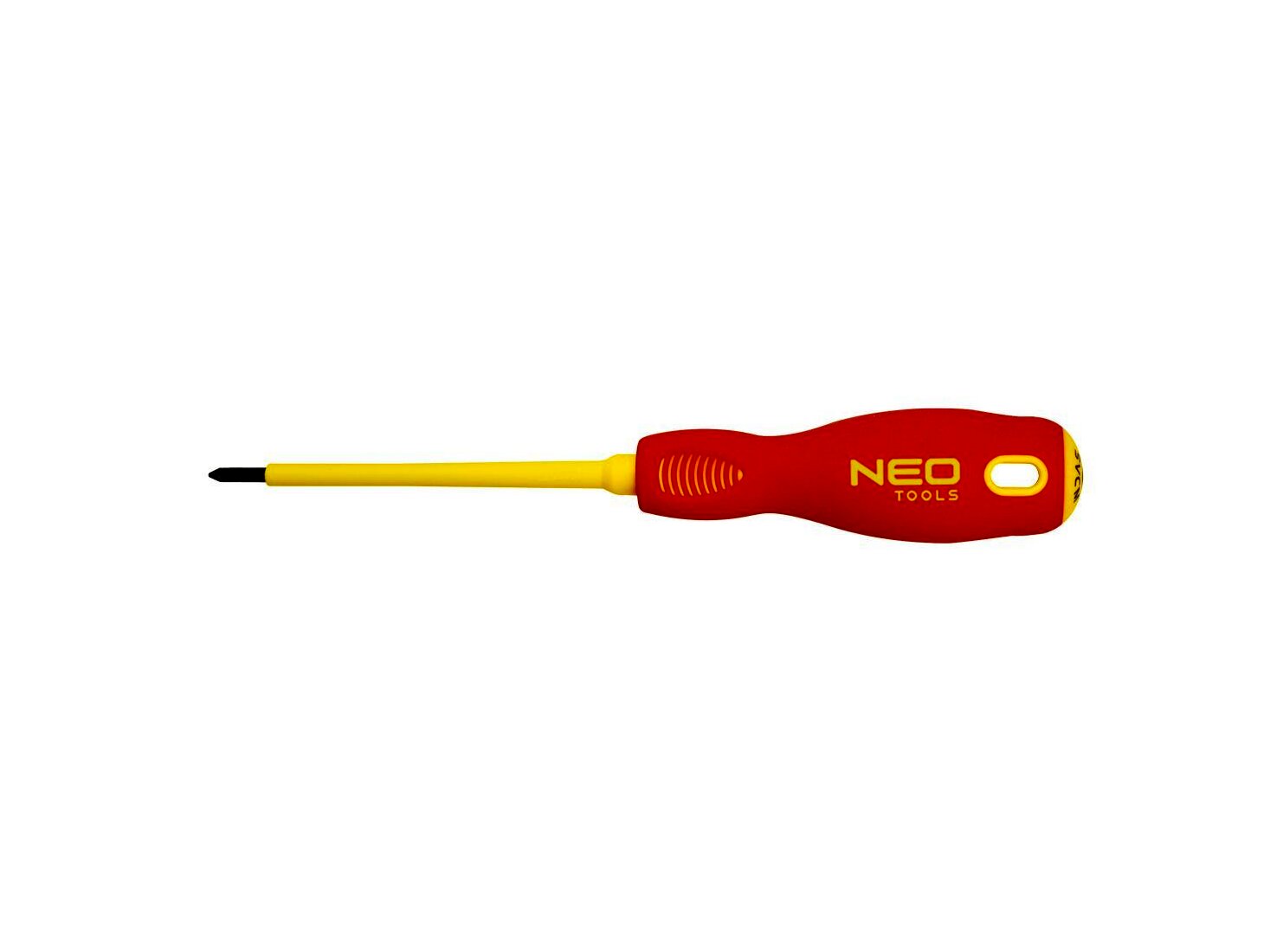 NEO 1000 V kereszt csavarhúzó. A szerszám max. 1000 V feszültség alatti használatra minősített. A csavarhúzó szára kivételesen ellenálló króm-vanádium acélból készül. A csavarhúzó hegy hőkezelésnek lett alávetve, így megfelelő, 56 HRC keménységet és hajlítószilárdságot ért el. A csavarhúzó hegye mágneses. A markolat három élű hasáb alakja a kialakított hüvelyktámasszal csökkenti a kéz megterhelését munka közben, és megkönnyíti a megfelelő forgatónyomaték elérését. A bimateriál markolat nem csúszik ki a kézből, ellenálló vegyszerek, kenőolajok és zsírok hatásának. A szerszám minőségét bizonyítja a TÜV tanúsítvány és a gyártó által nyújtott 25 éves jótállás. A NEO márka a professzionális igényeket is kielégíti.